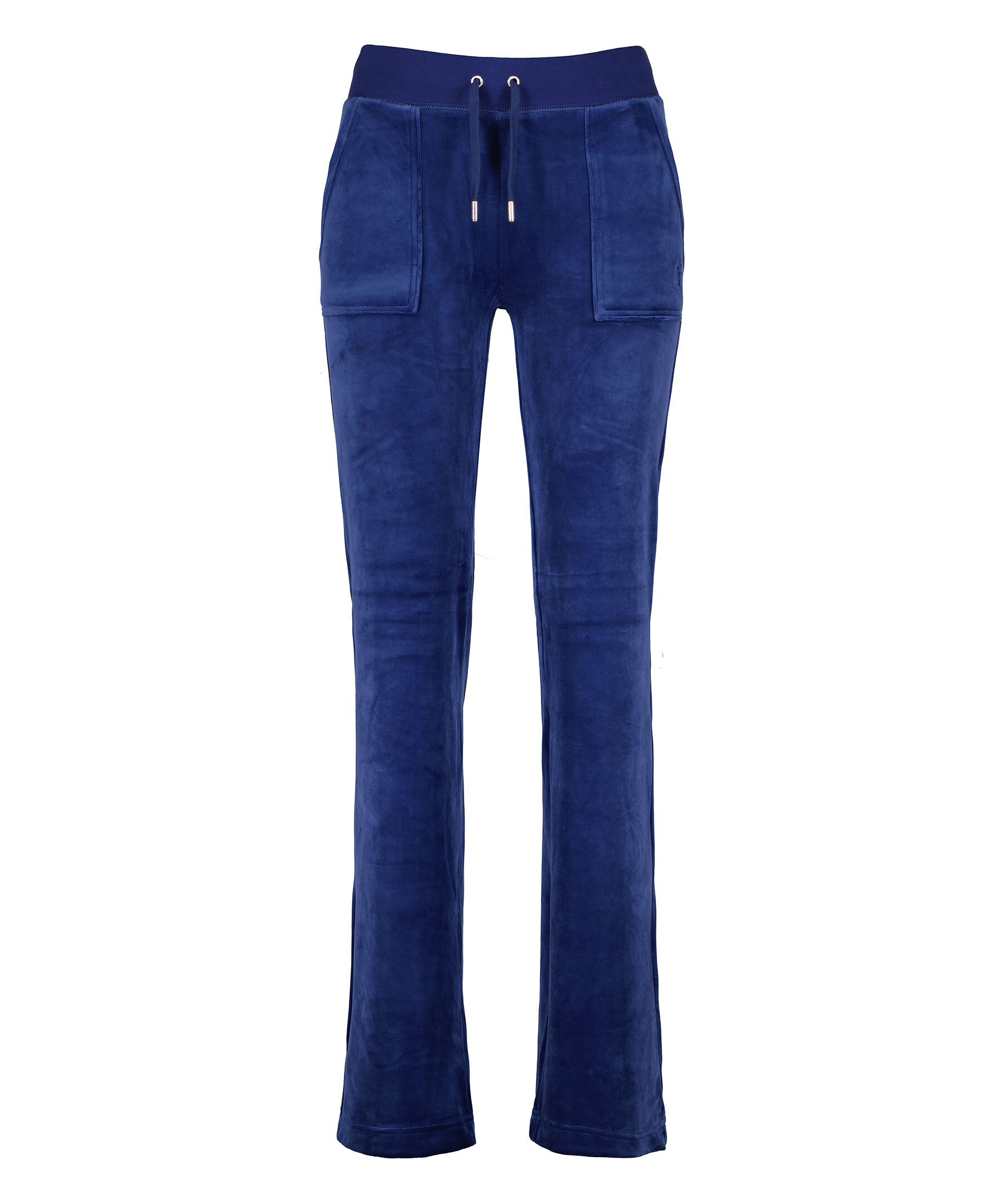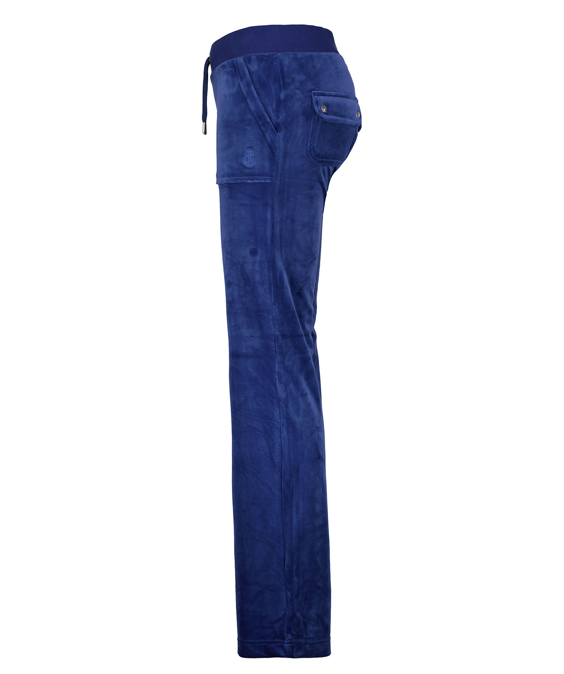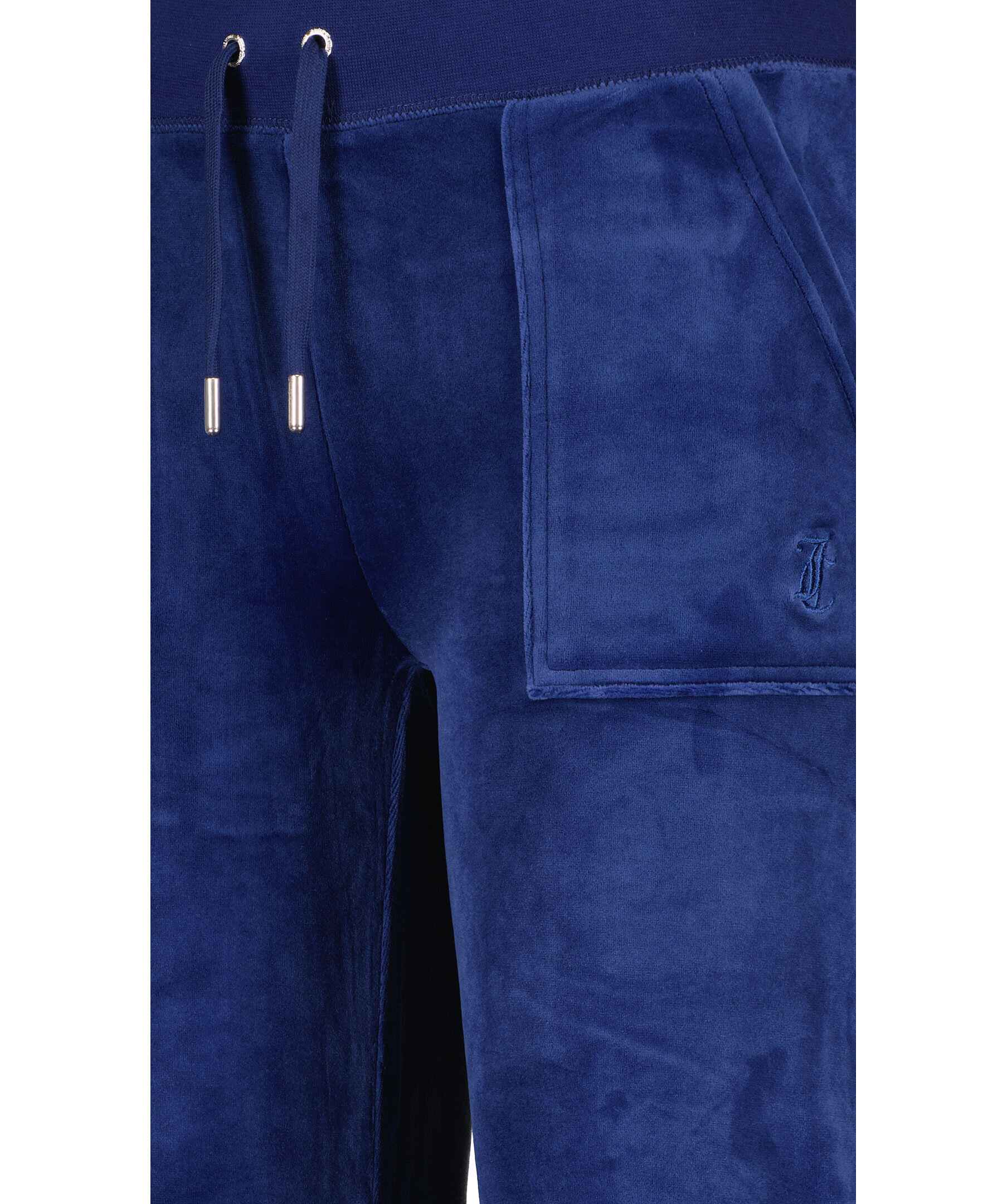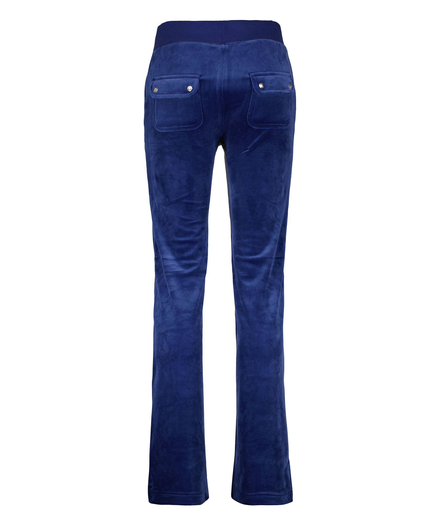 Byxor i velour i färgen Blue Depths från Juicy Couture. Bred resårkant i midjan med snörning, fickor i sidorna och bakfickor med ficklock och tryckknappar med logotyp. Rak modell broderad logga framtill på vänster ficka.