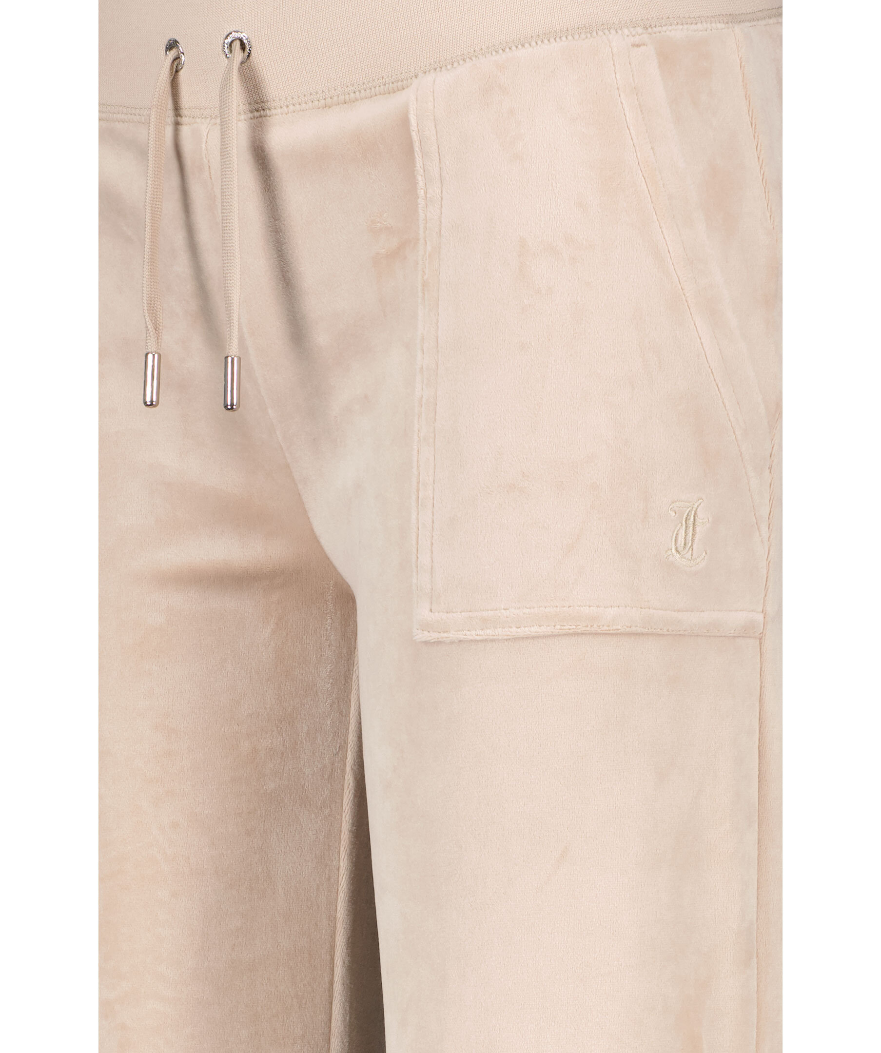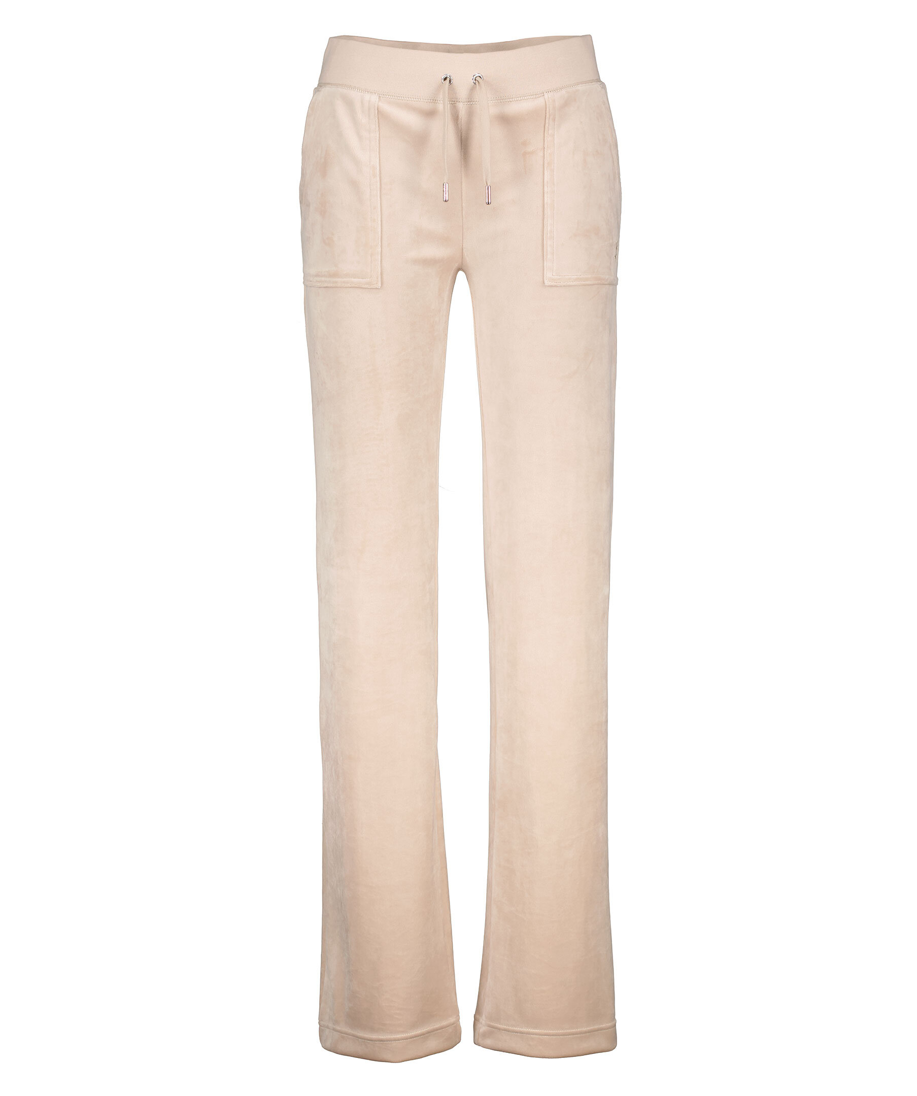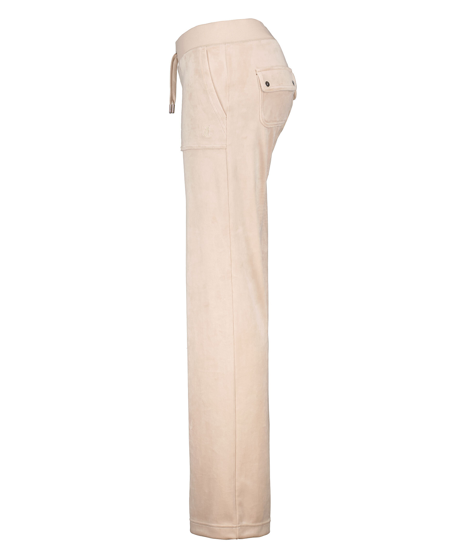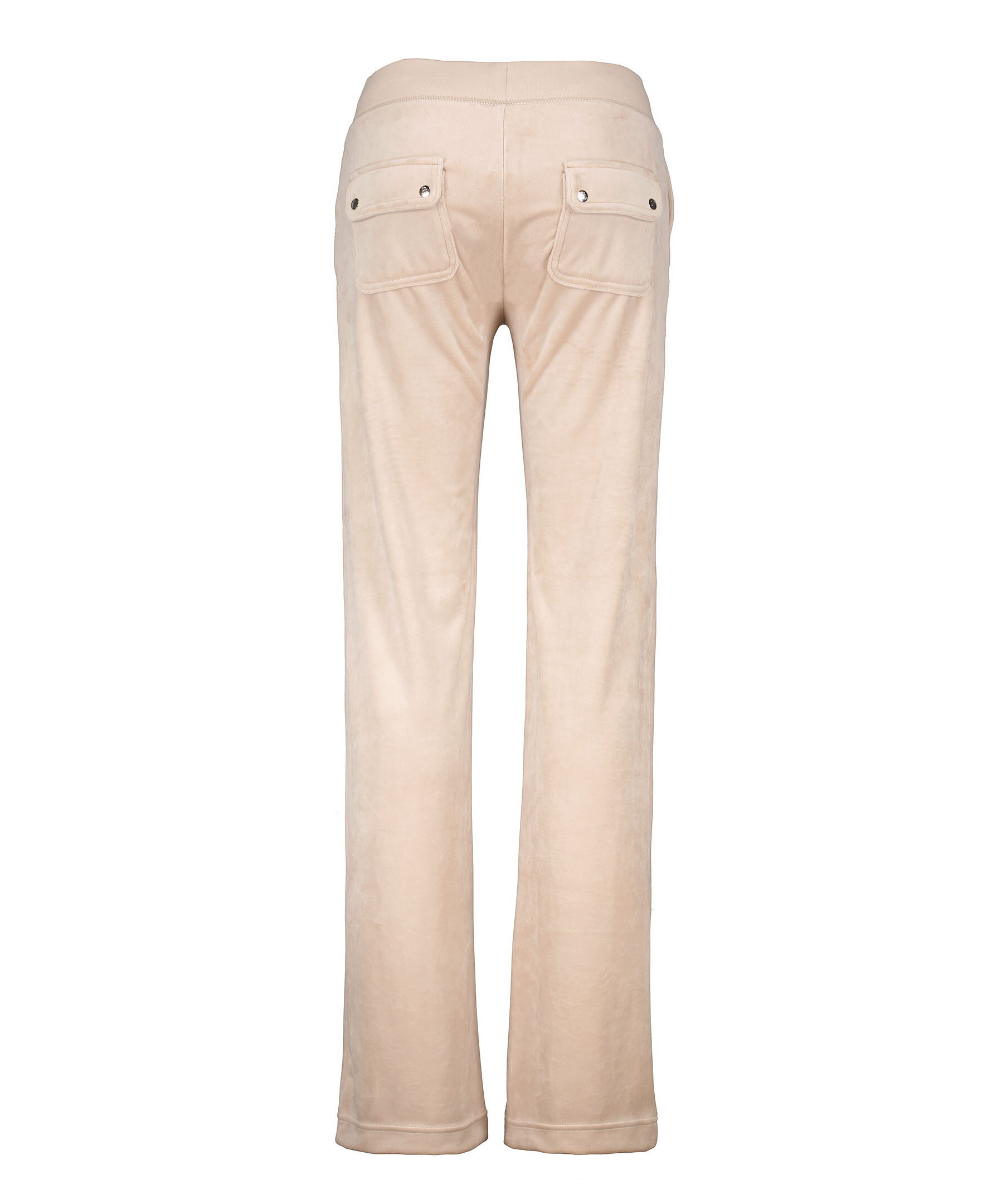 Byxor i velour i färgen Mushroom från Juicy Couture. Bred resårkant i midjan med snörning, fickor i sidorna och bakfickor med ficklock och tryckknappar med logotyp. Rak modell, broderad logga framtill på vänster ficka.