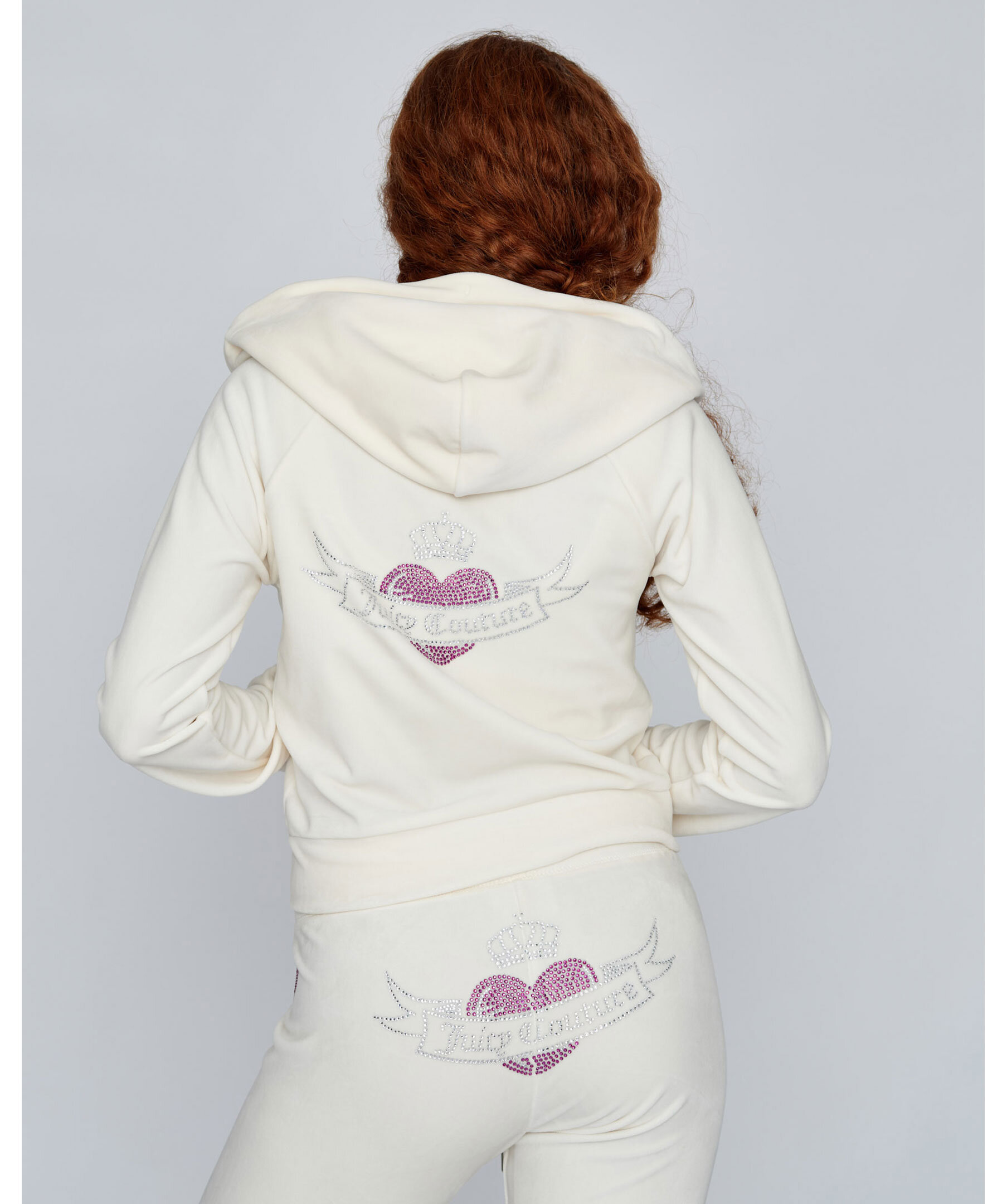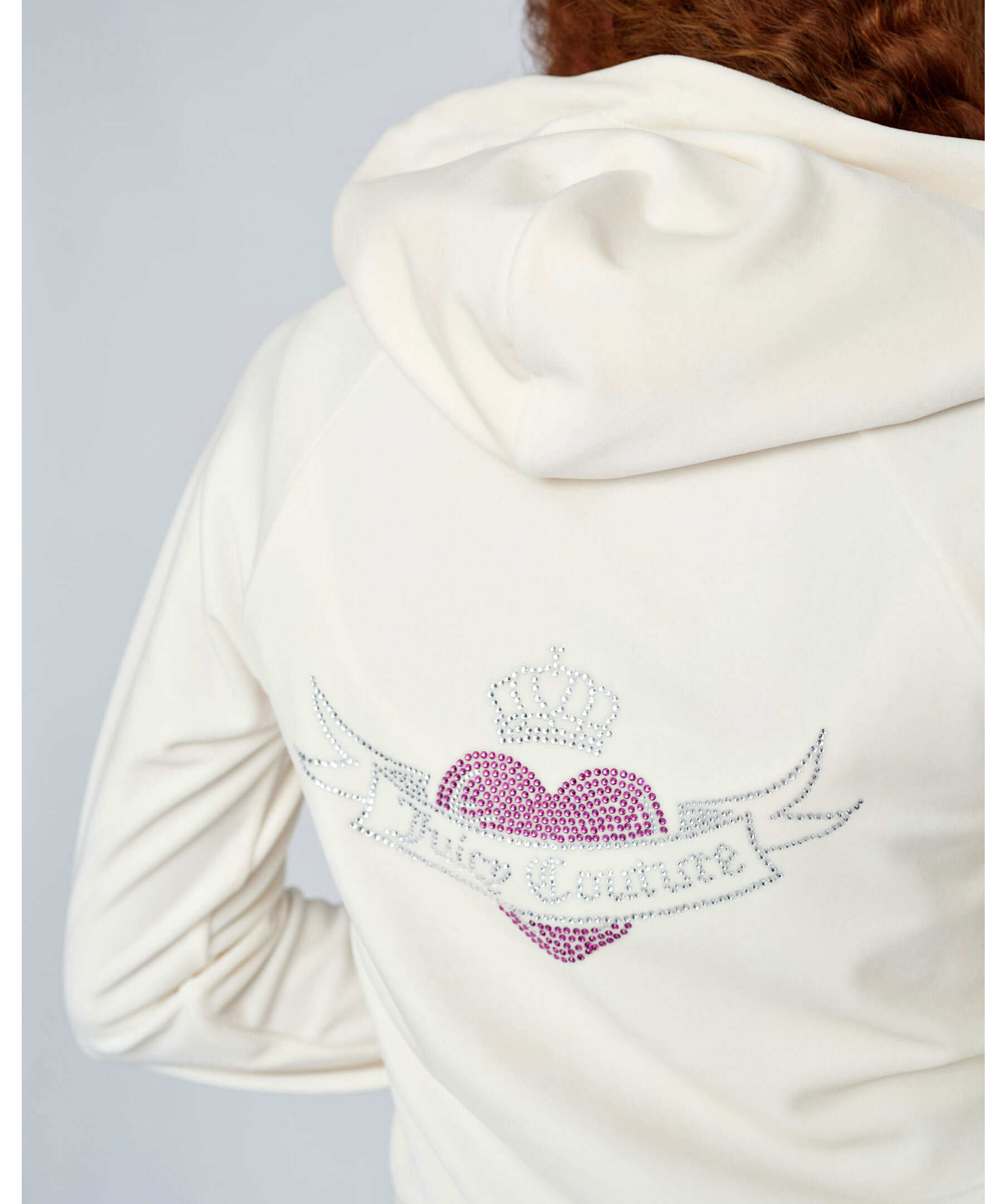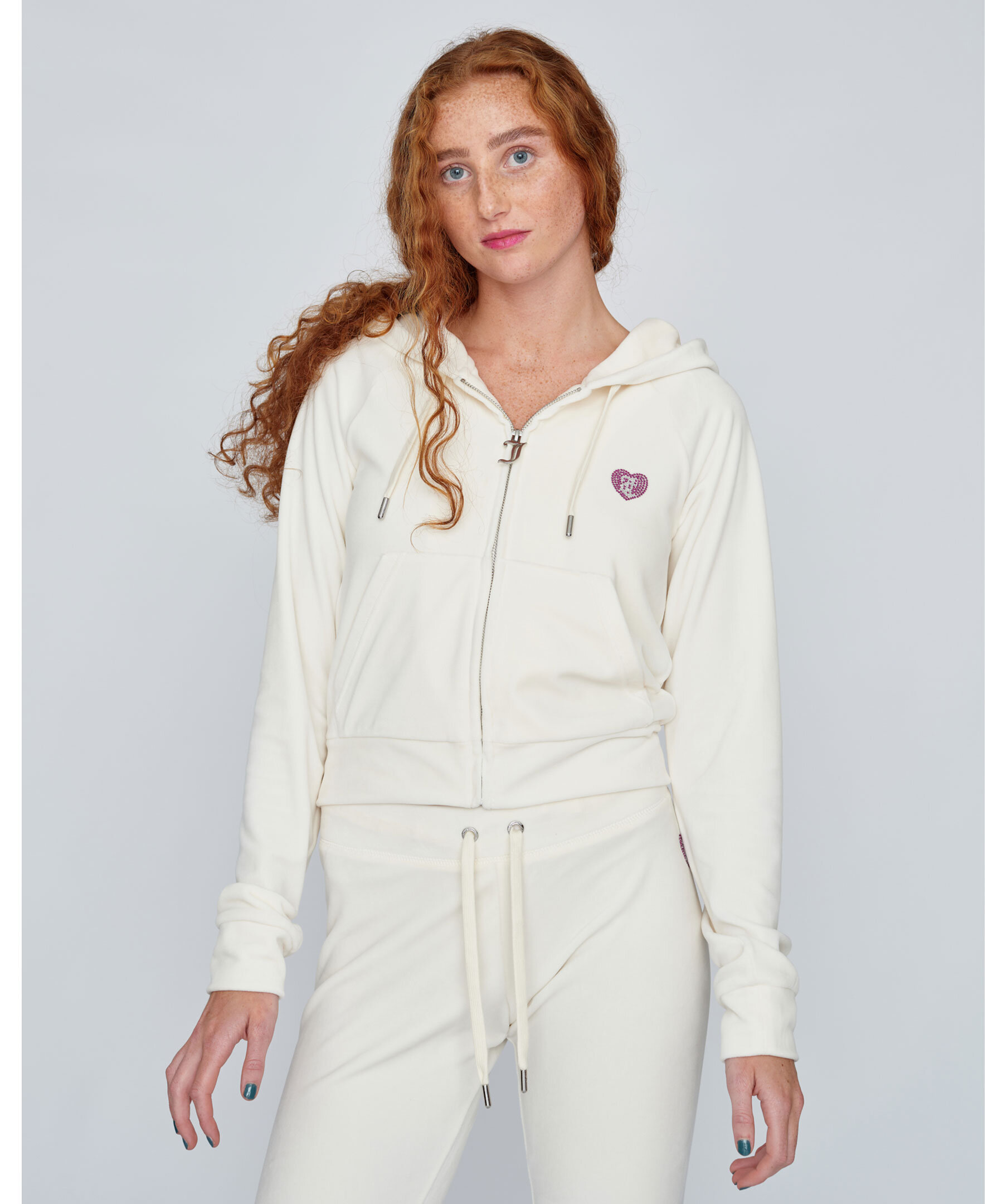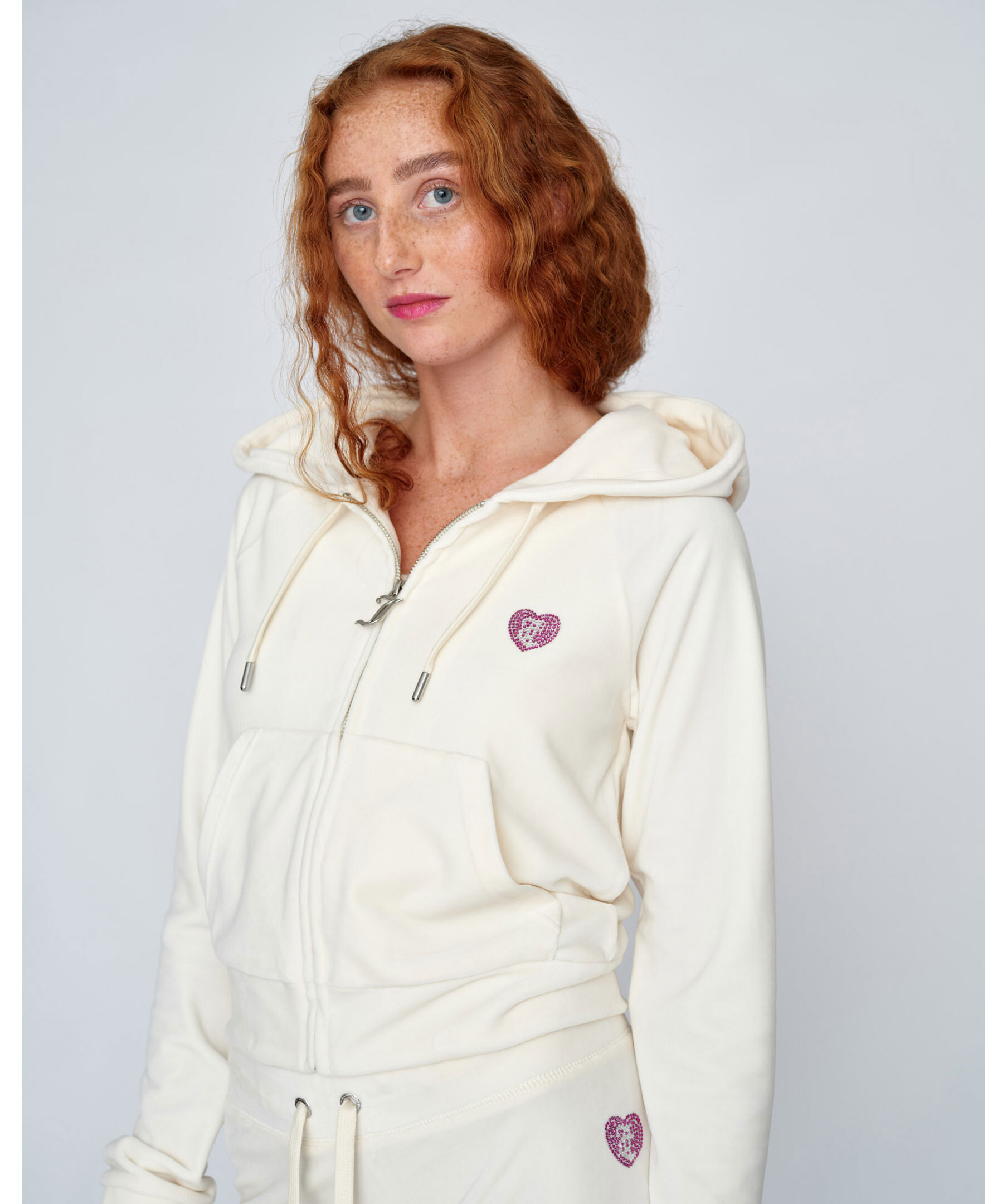 Krämvit hoodie med dragkedja fram i velour från Juicy Couture. Bred mudd i plaggslut och i ärmslut, rosa hjärta och silverfärgad logotyp med strasstenar bak på ryggen och ett litet rosa hjärta fram på vänster sida även det i strasstenar. Snörning i luvan och fickor fram.