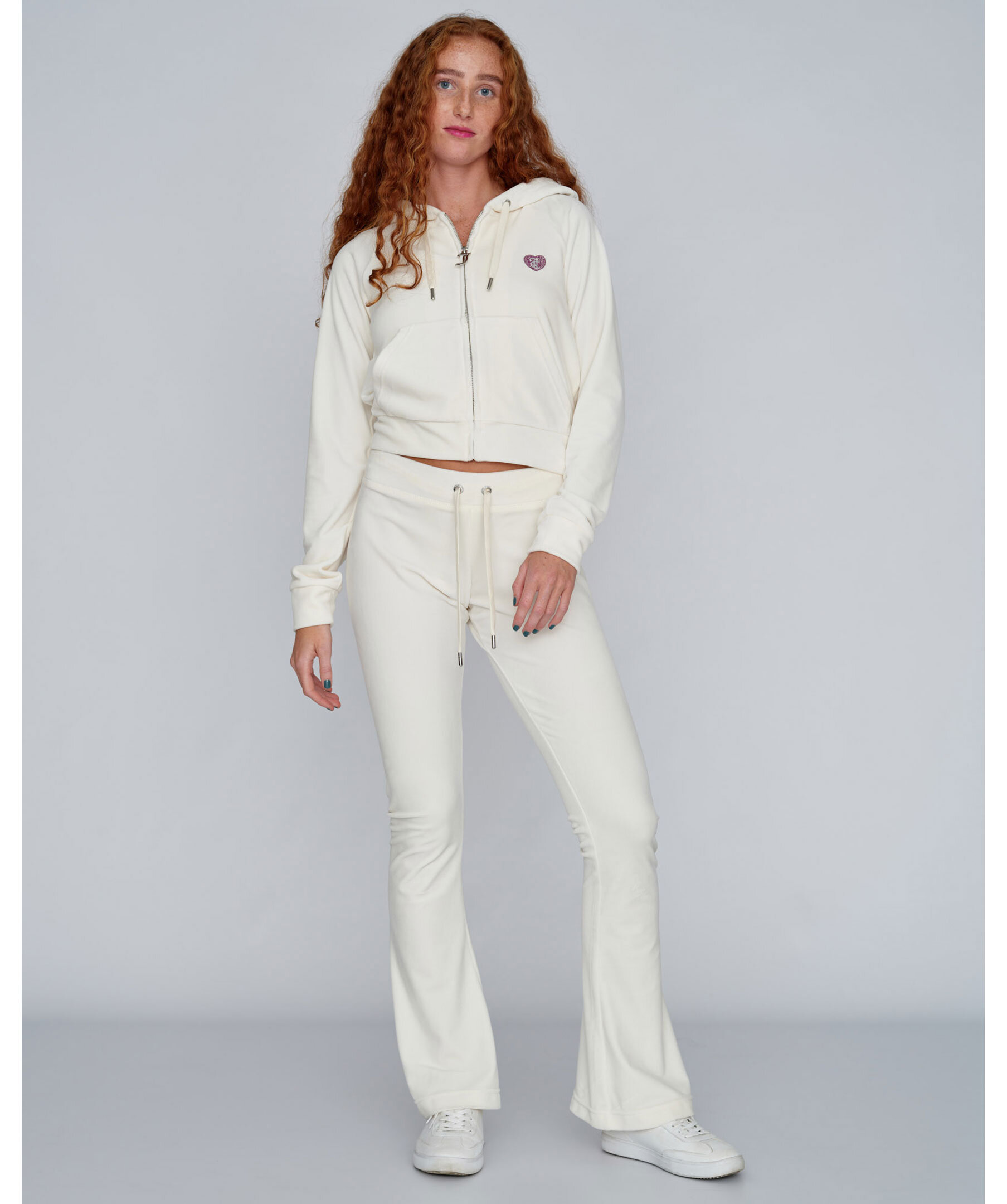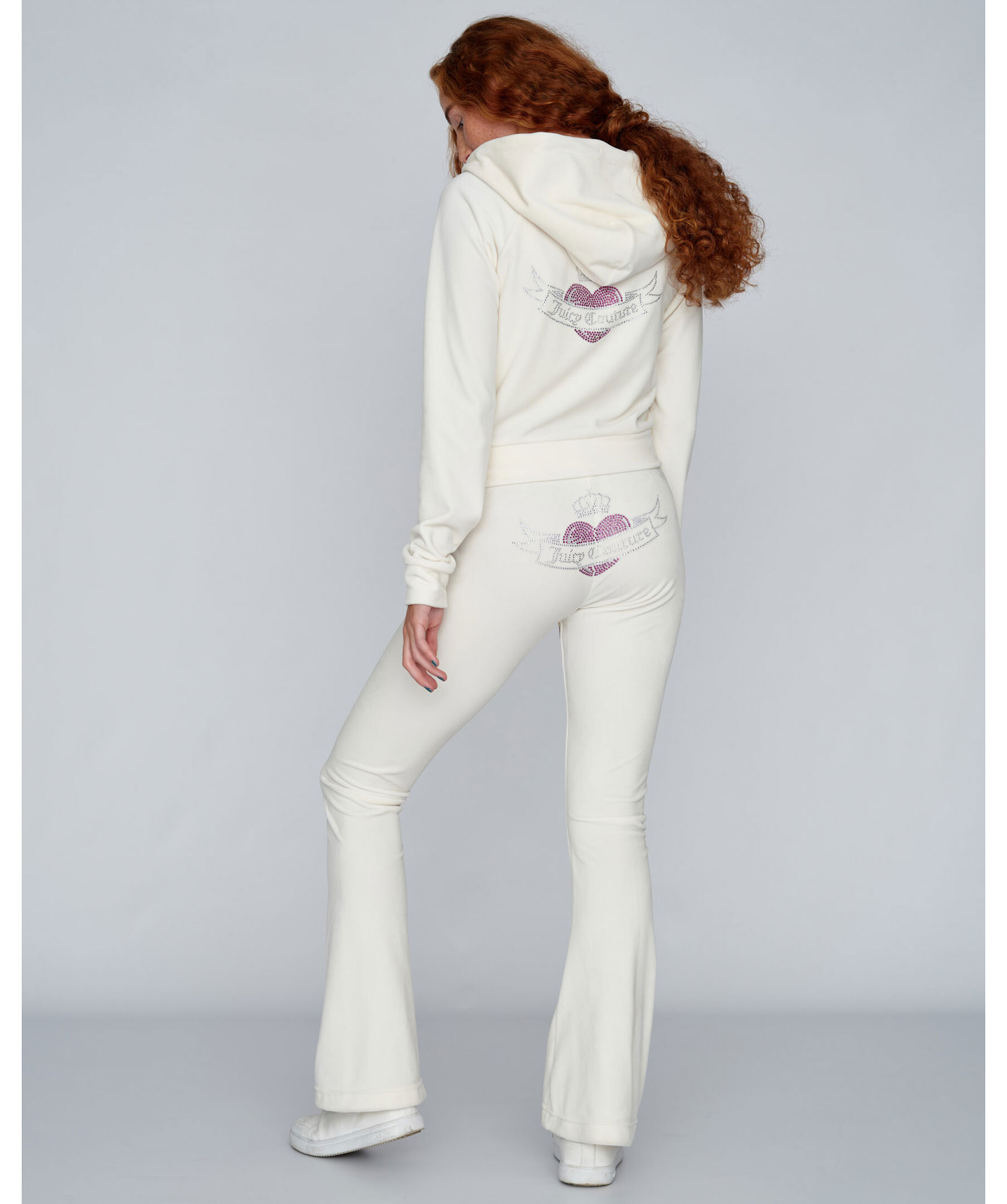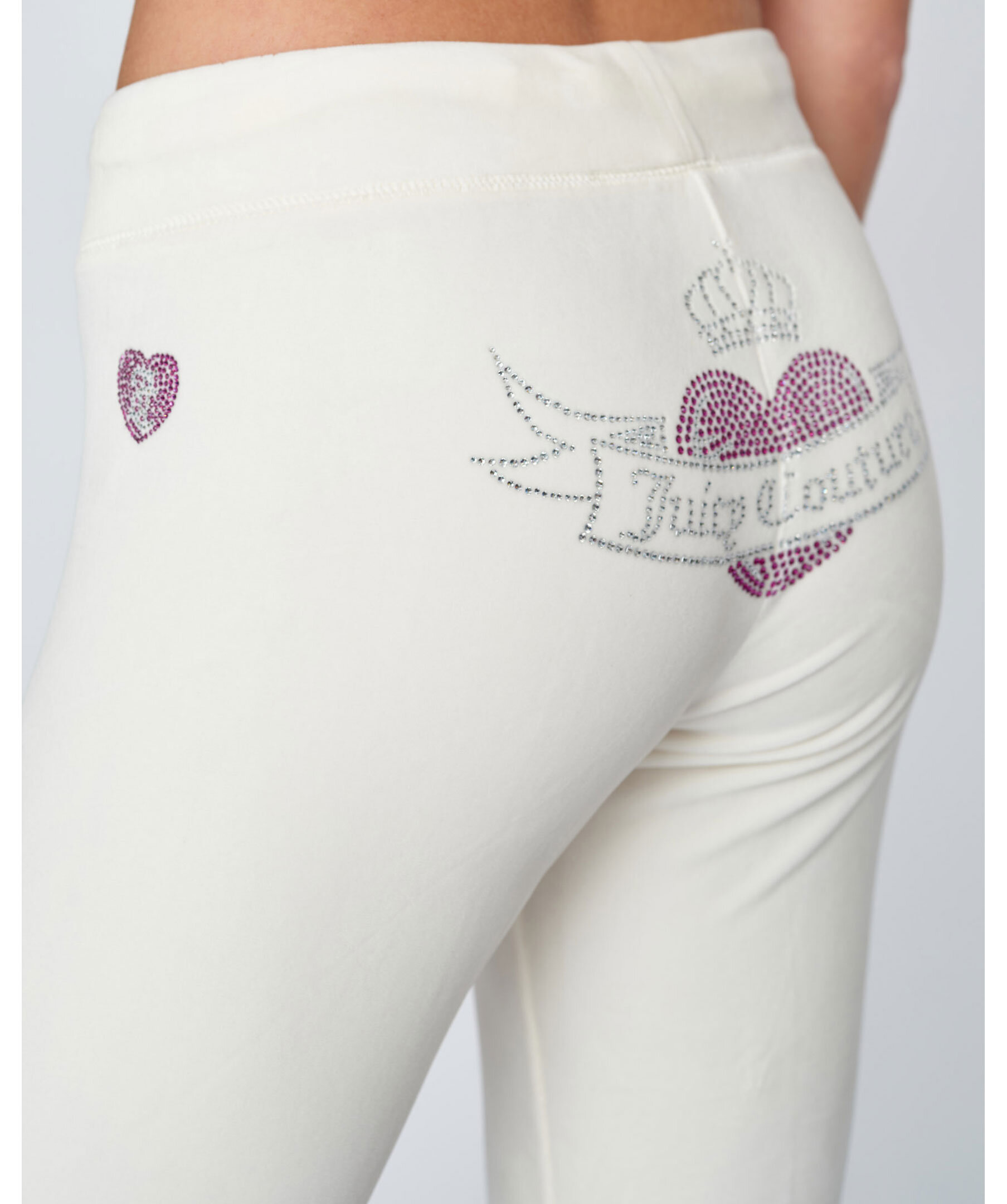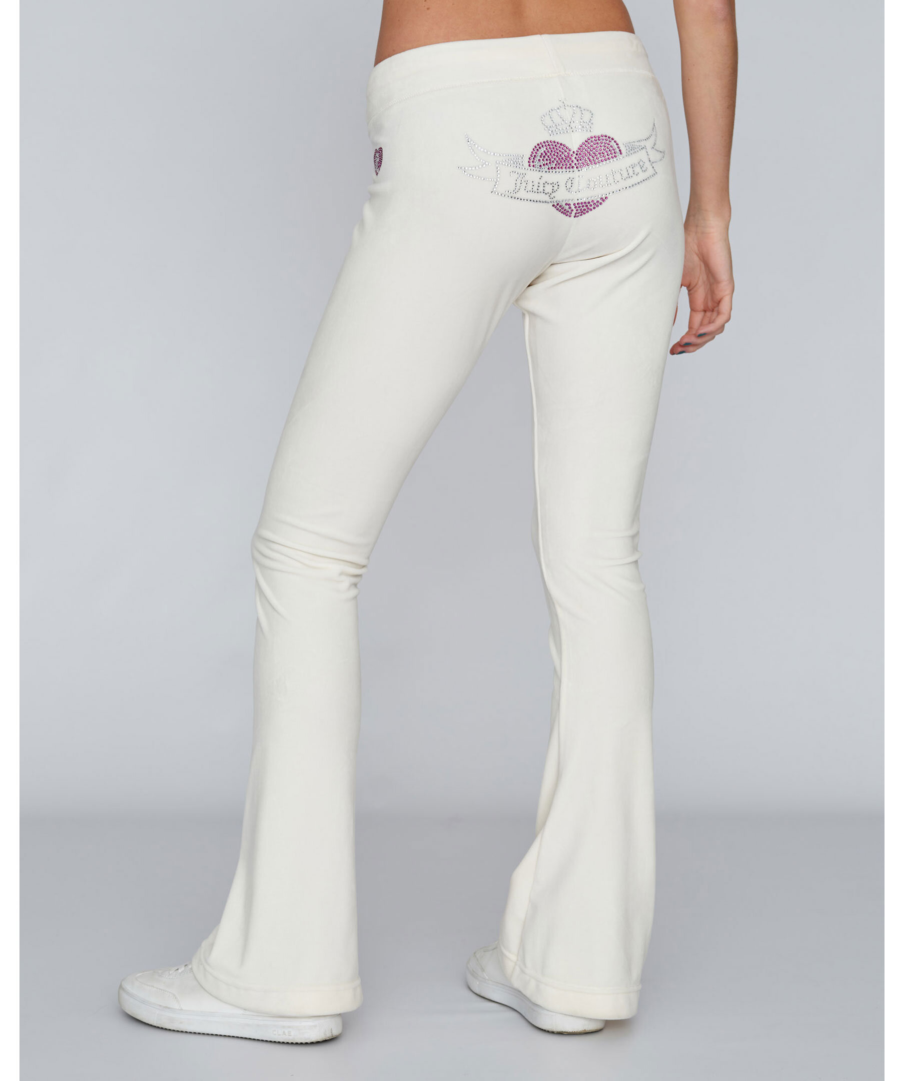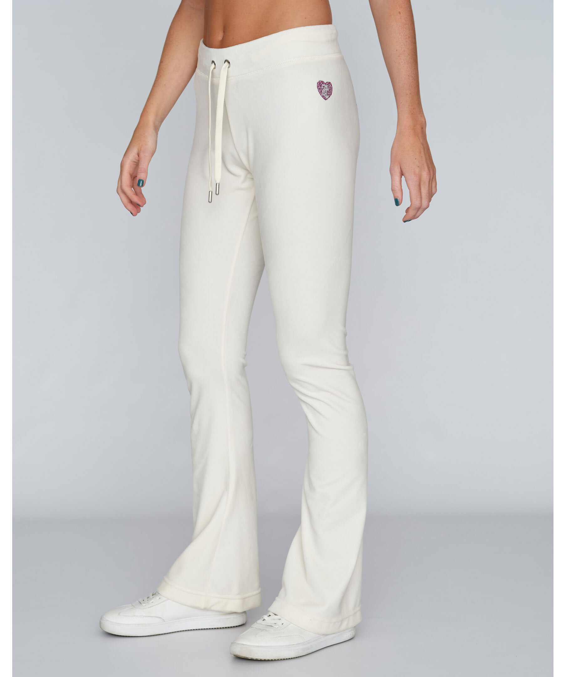 Krämvita byxor i velour från Juicy Couture. Bred mudd i midjan med snörning, rosa hjärta och silverfärgad logotyp med strasstenar bak på rumpan och ett litet rosa hjärta på ena höften fram även det i strasstenar. Smal modell med utsvängda ben nedtill.