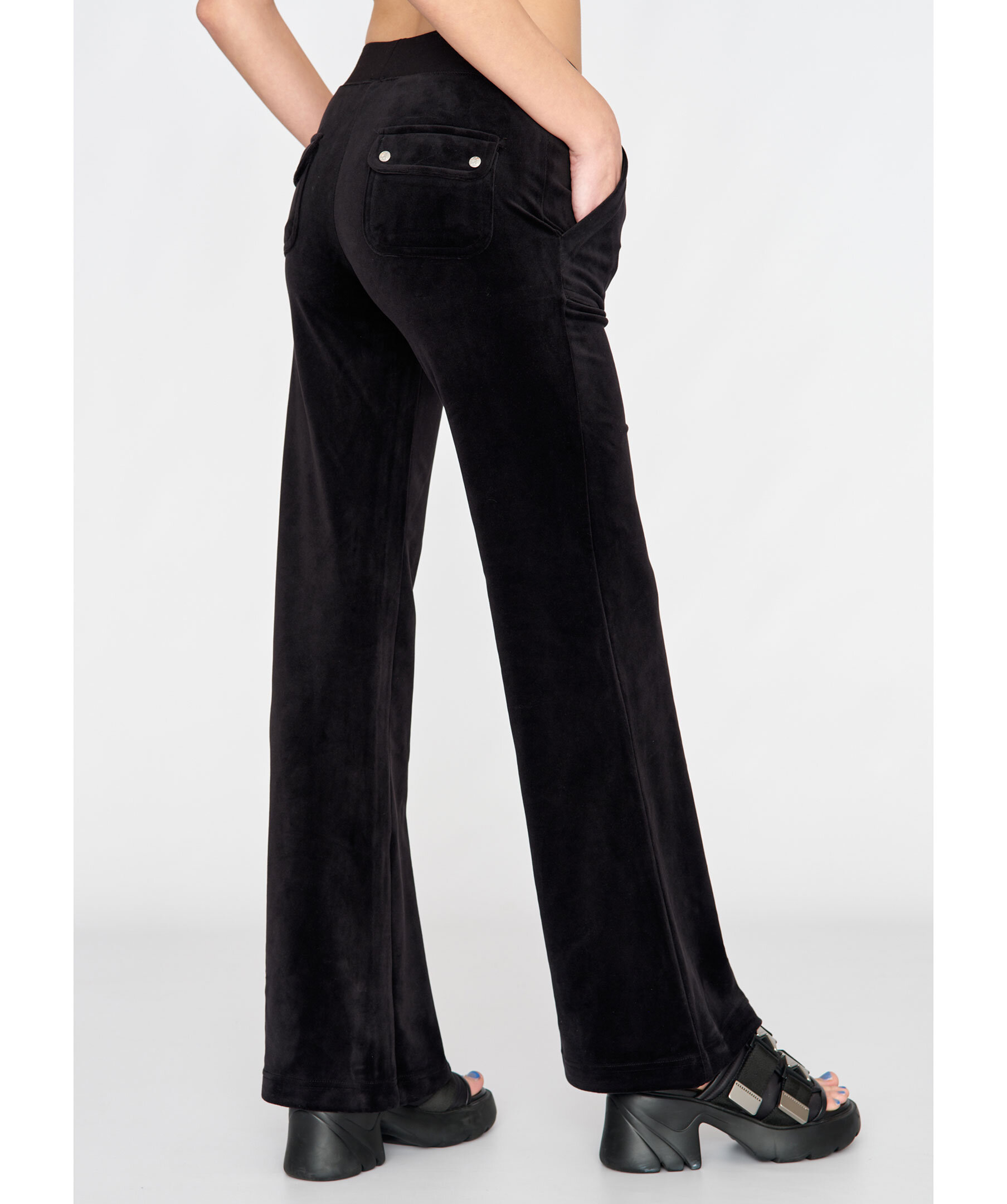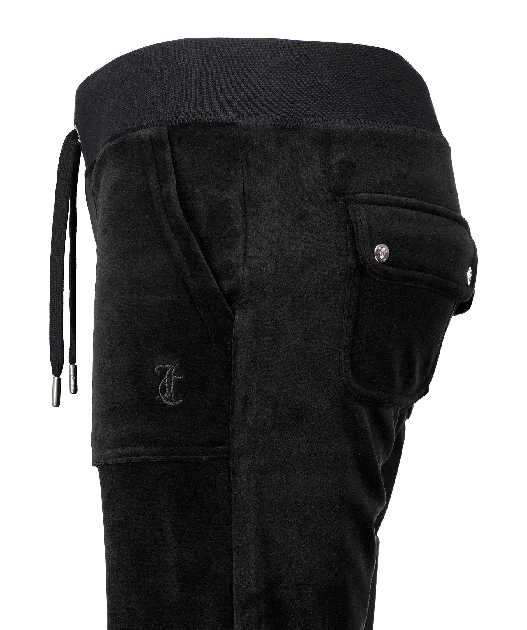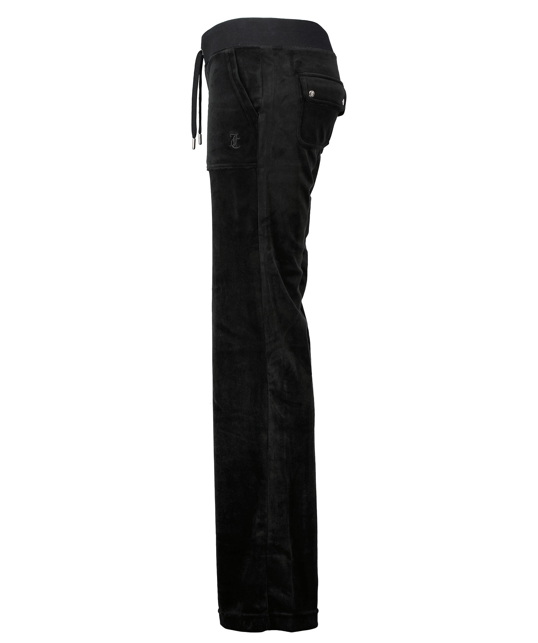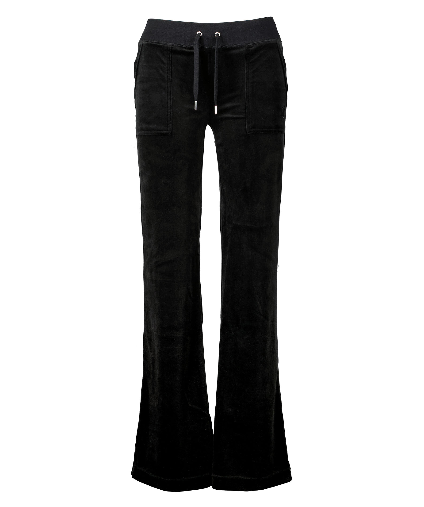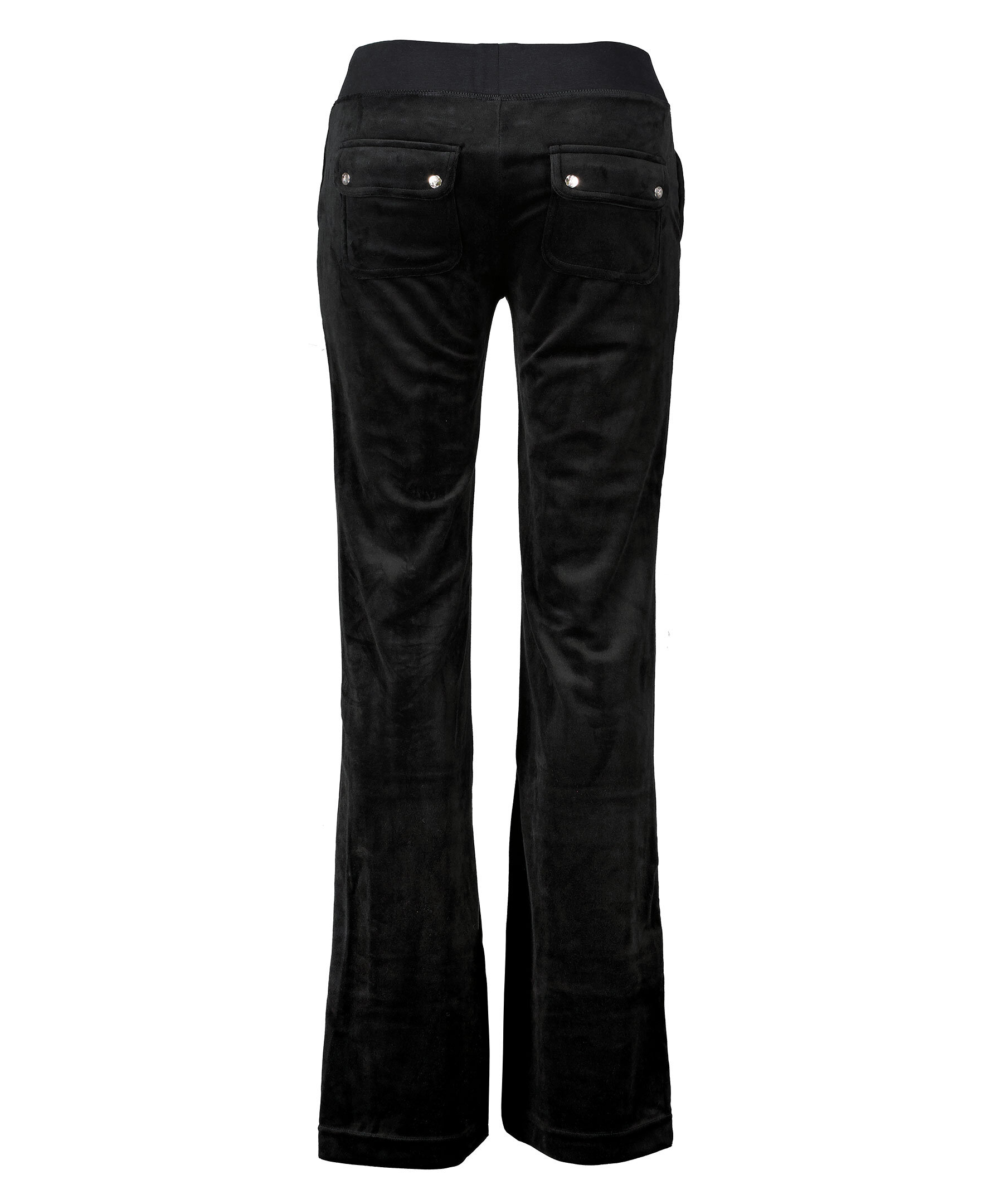 Svarta byxor i velour från Juicy Couture. Bred resårkant i midjan med snörning, fickor i sidorna och bakfickor med ficklock och tryckknappar med logotyp. Rak modell, broderad logga framtill på vänster ficka.