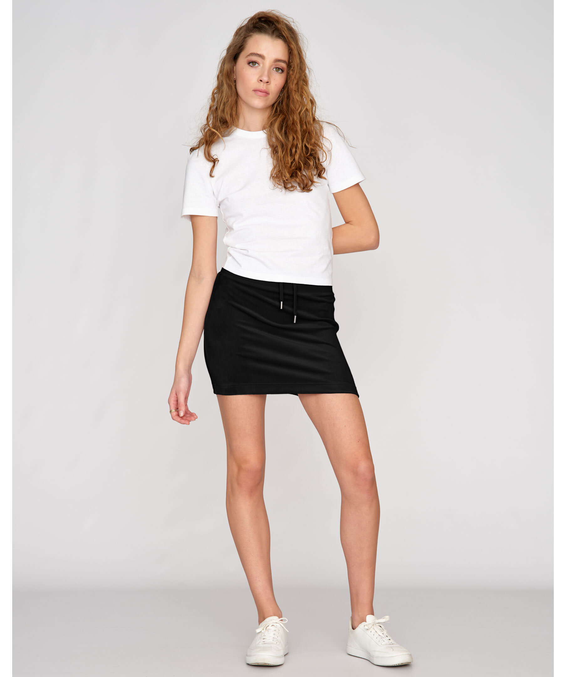 Svart minikjol i velour från Juicy Couture. Bred ribbstickadmudd i midjan med dragsko. Kjolen slutar mitt på låret.