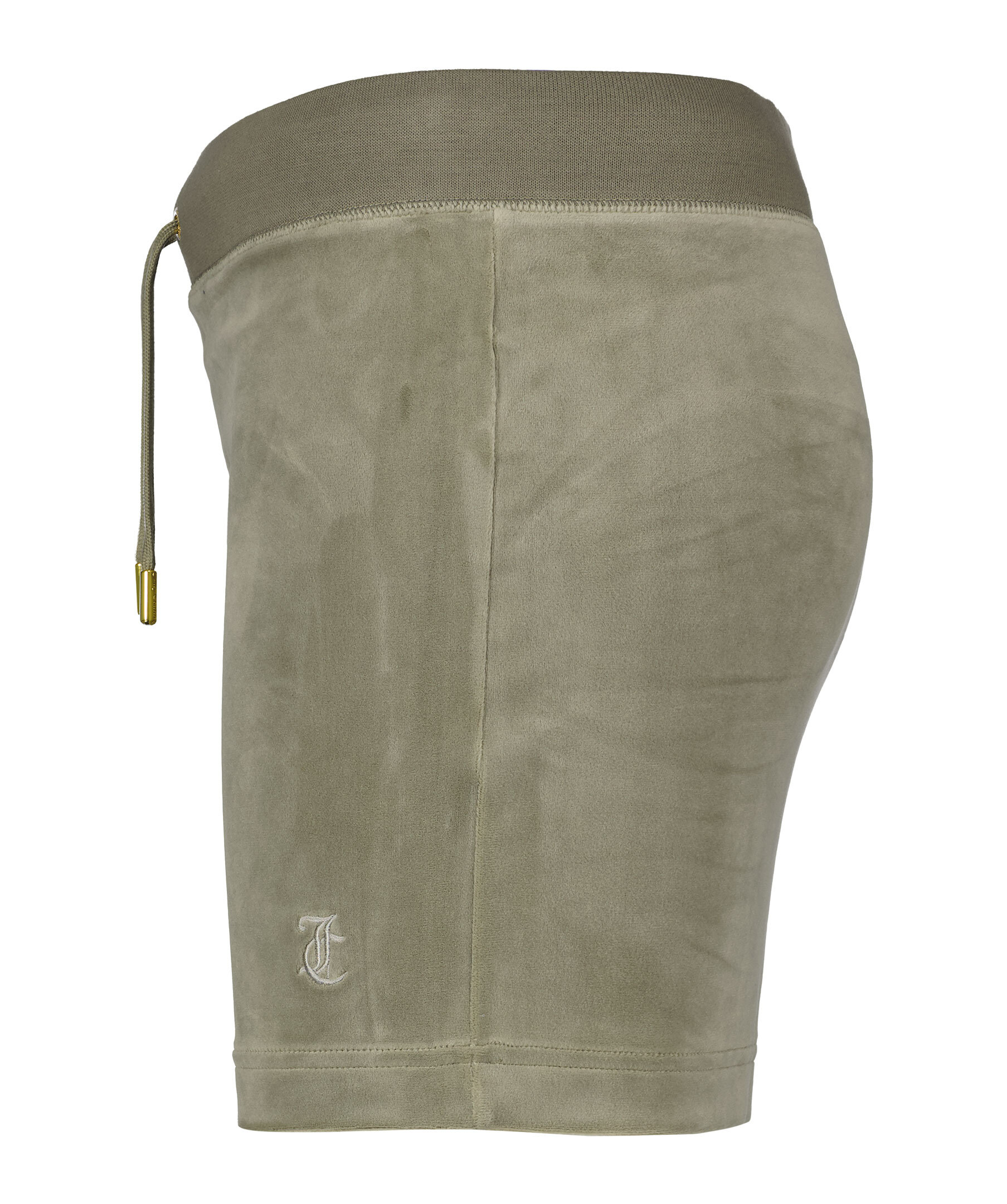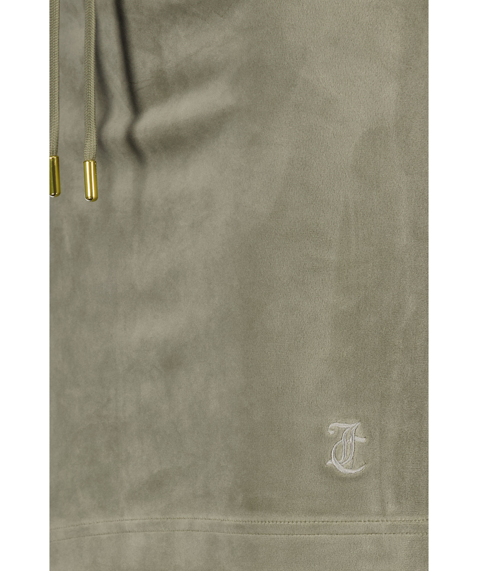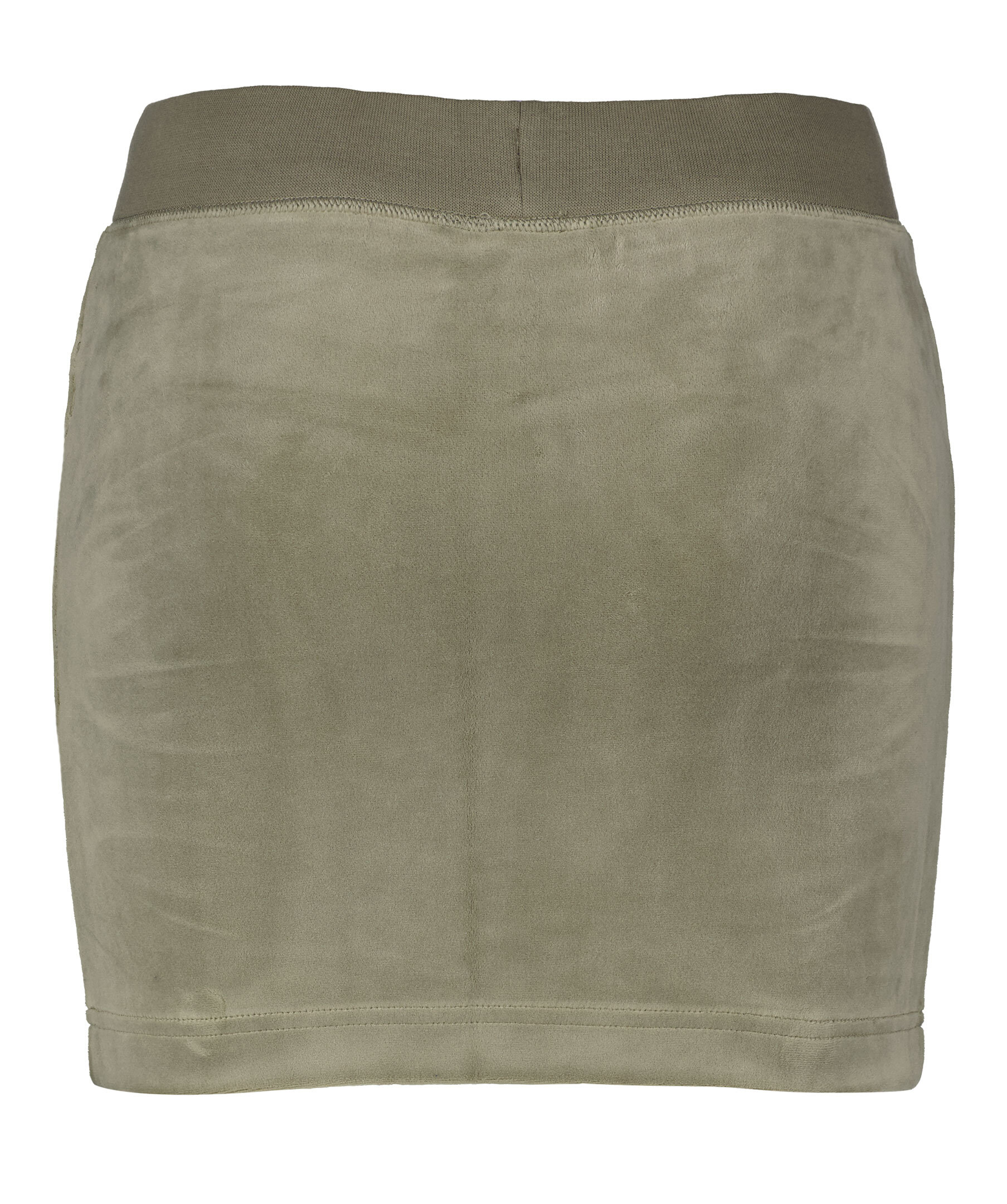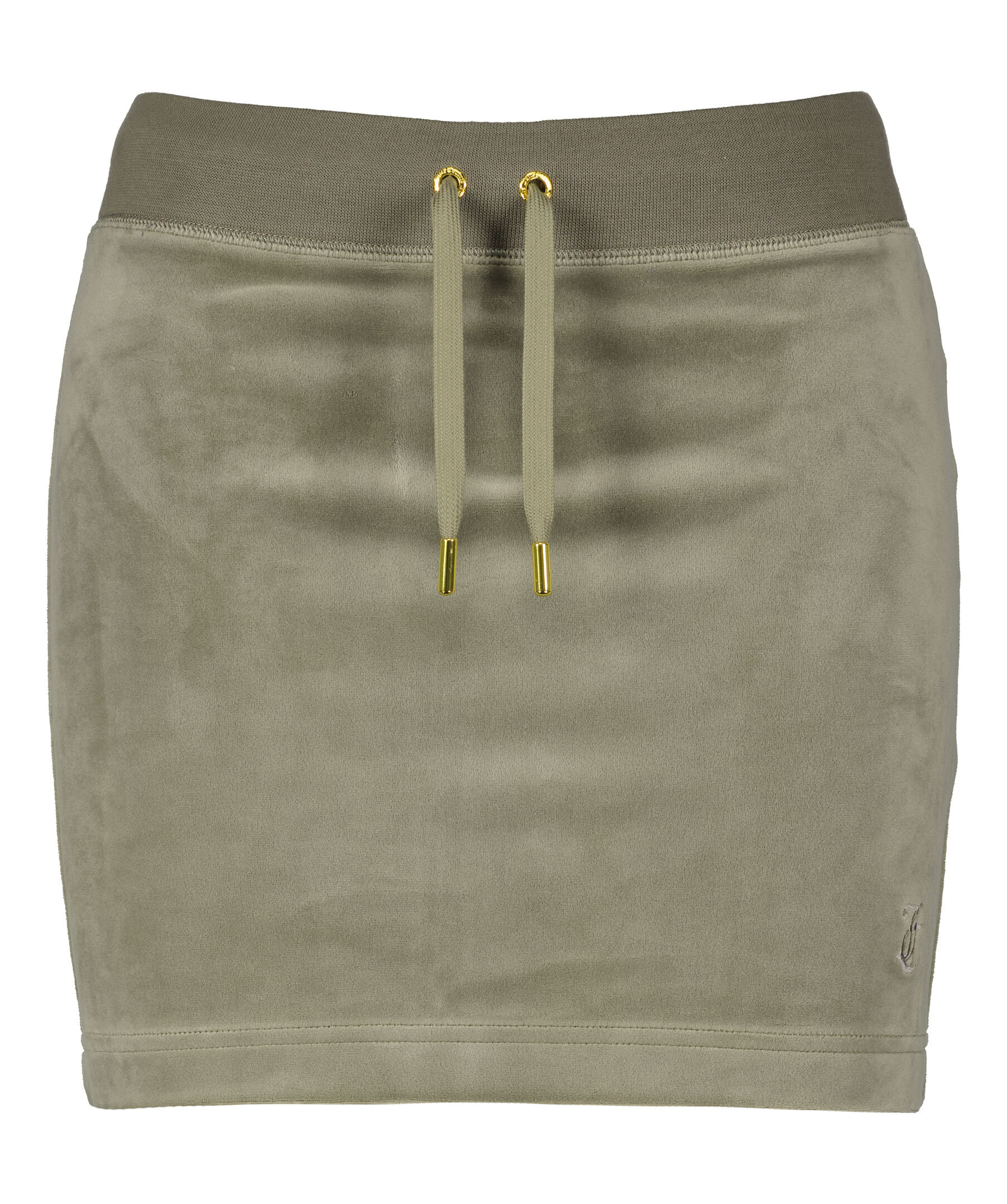 Olivgrön minikjol i velour från Juicy Couture. Bred ribbstickadmudd i midjan med dragsko. Kjolen slutar mitt på låret.