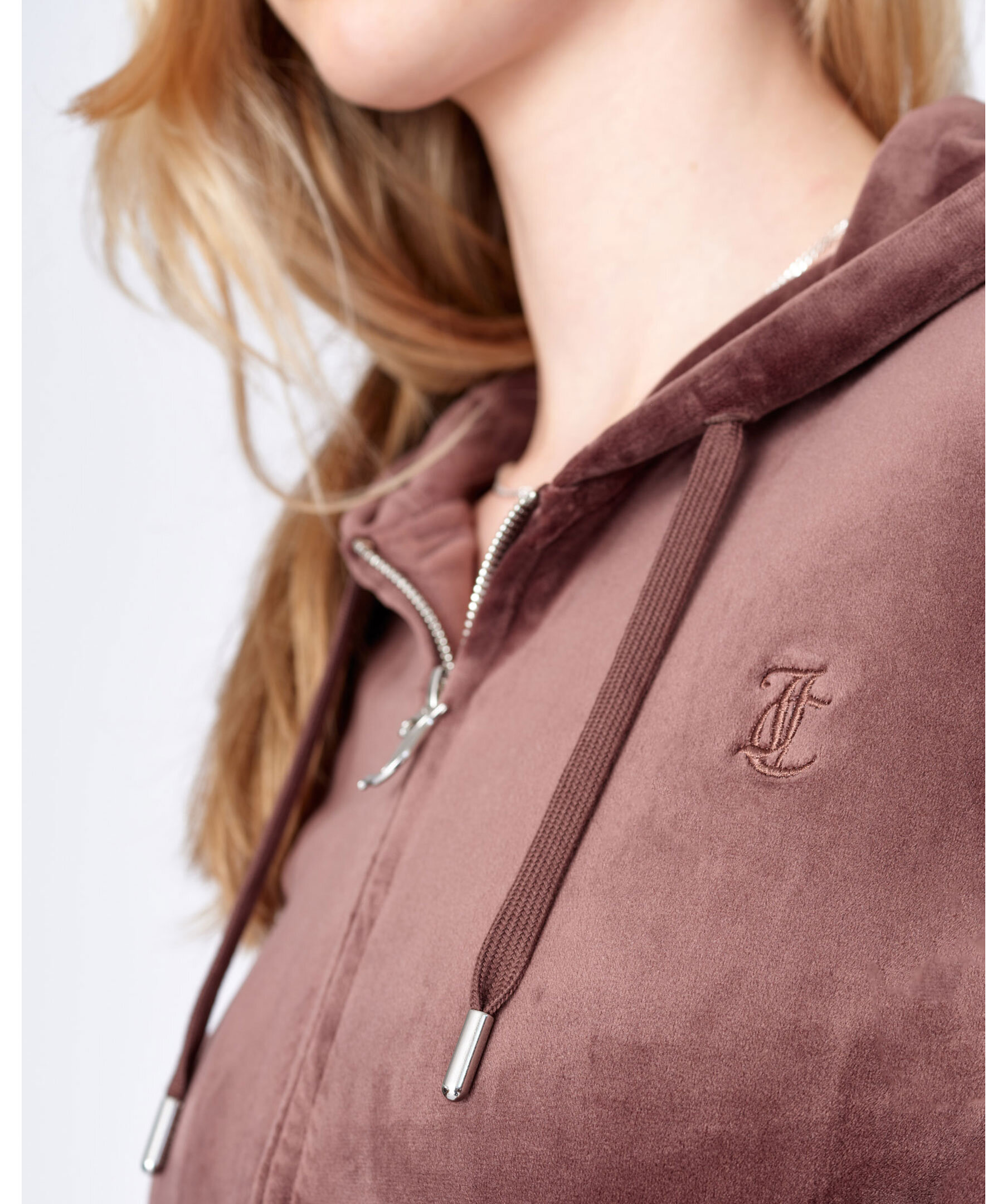 Brun hoodie med dragkedja fram i velour från Juicy Couture. Bred mudd i plaggslut och i ärmslut, broderad logotyp i ton-i-ton på bröstet på vänster sida. Snörning i luvan och fickor fram.