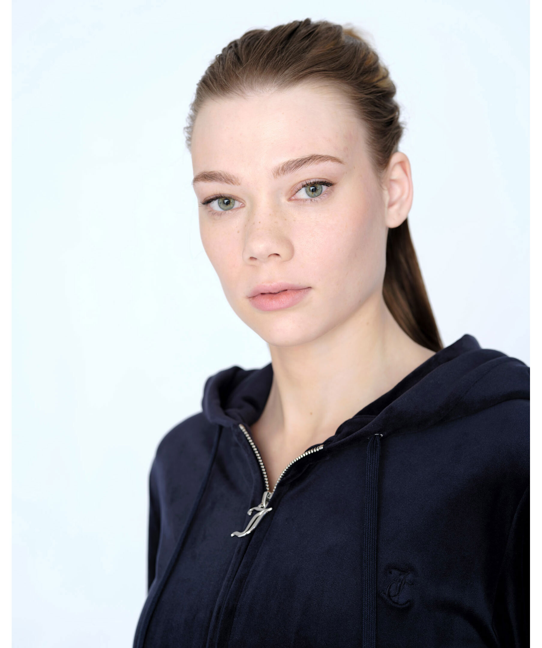 Velour hoodie med dragkedja fram i färgen Night Sky från Juicy Couture. Bred mudd i plaggslut och i ärmslut, broderad logotyp i ton-i-ton på bröstet på vänster sida. Snörning i luvan och fickor fram.