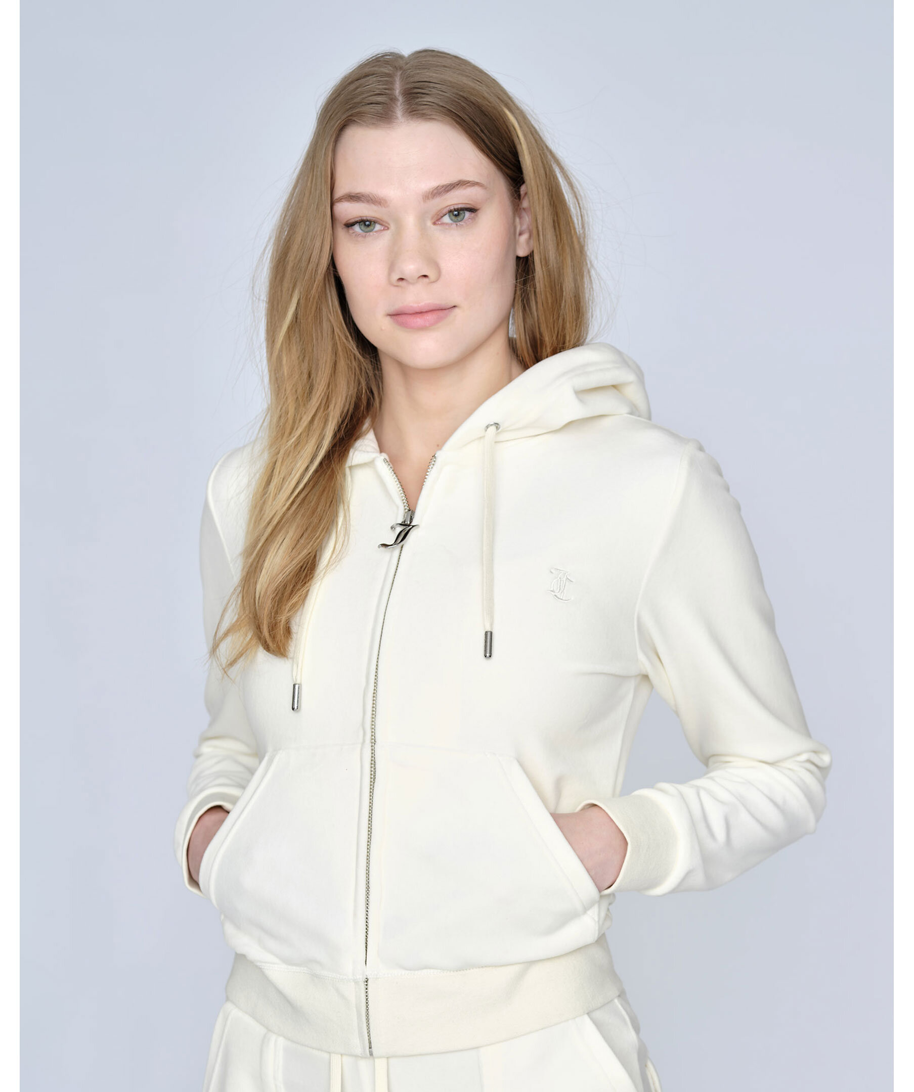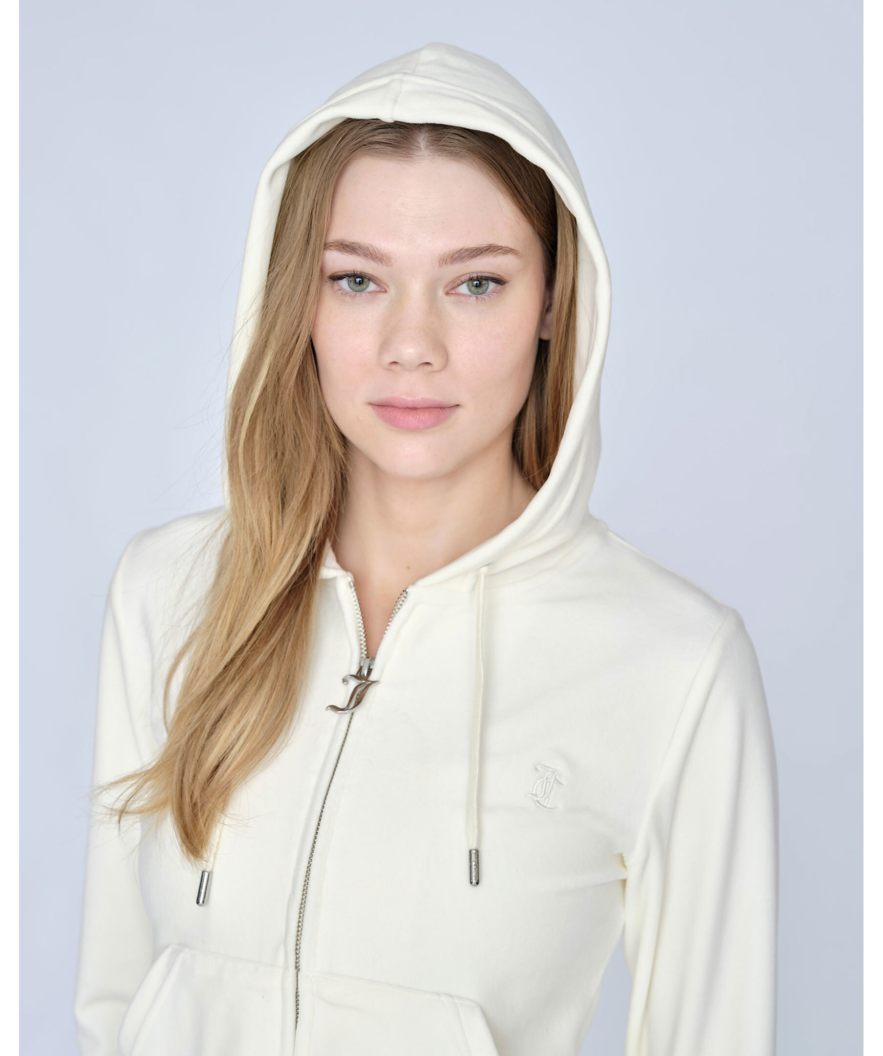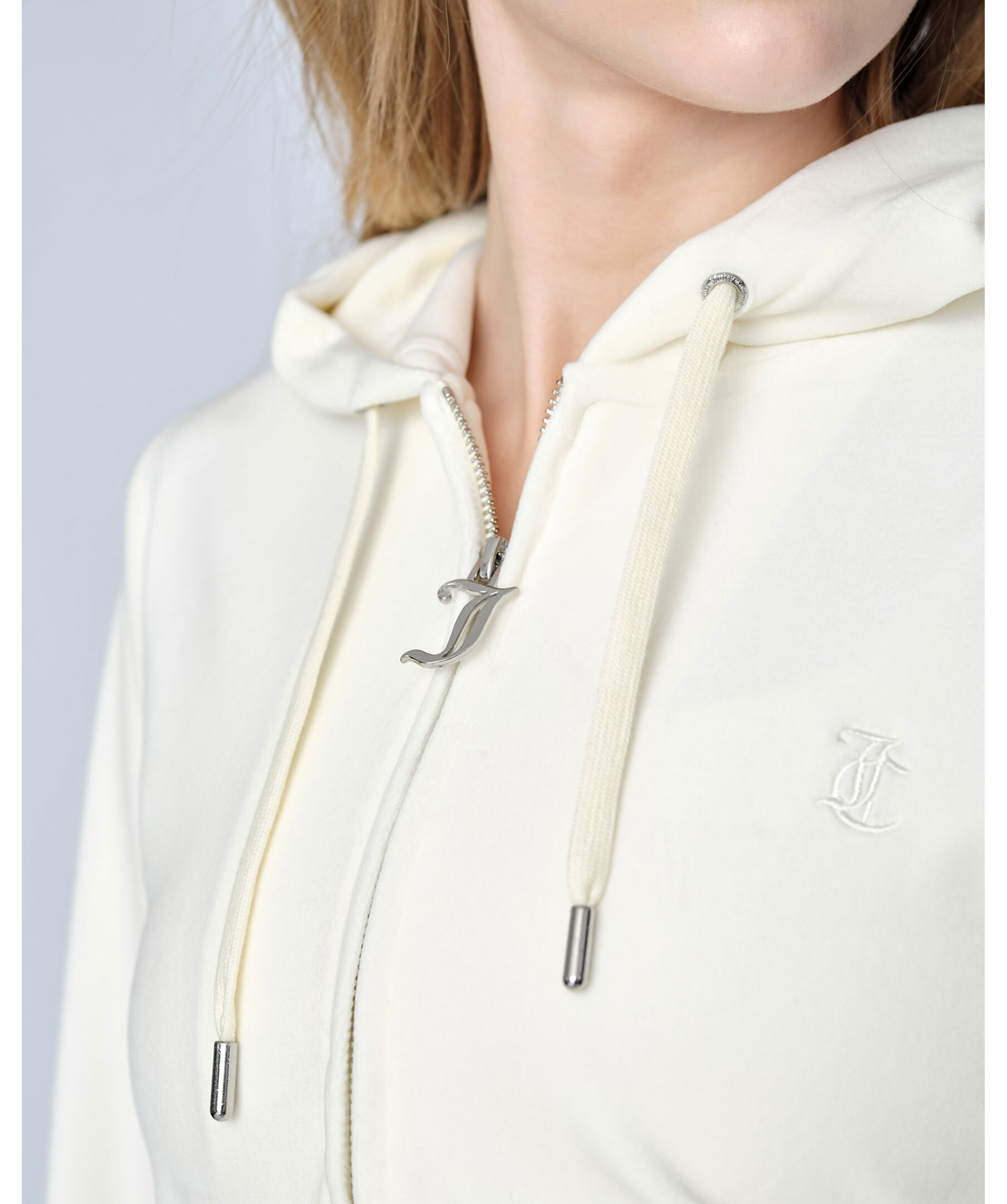 Krämvit hoodie med dragkedja fram i velour från Juicy Couture. Bred mudd i plaggslut och i ärmslut, broderad logotyp i ton-i-ton på bröstet på vänster sida. Snörning i luvan och fickor fram.