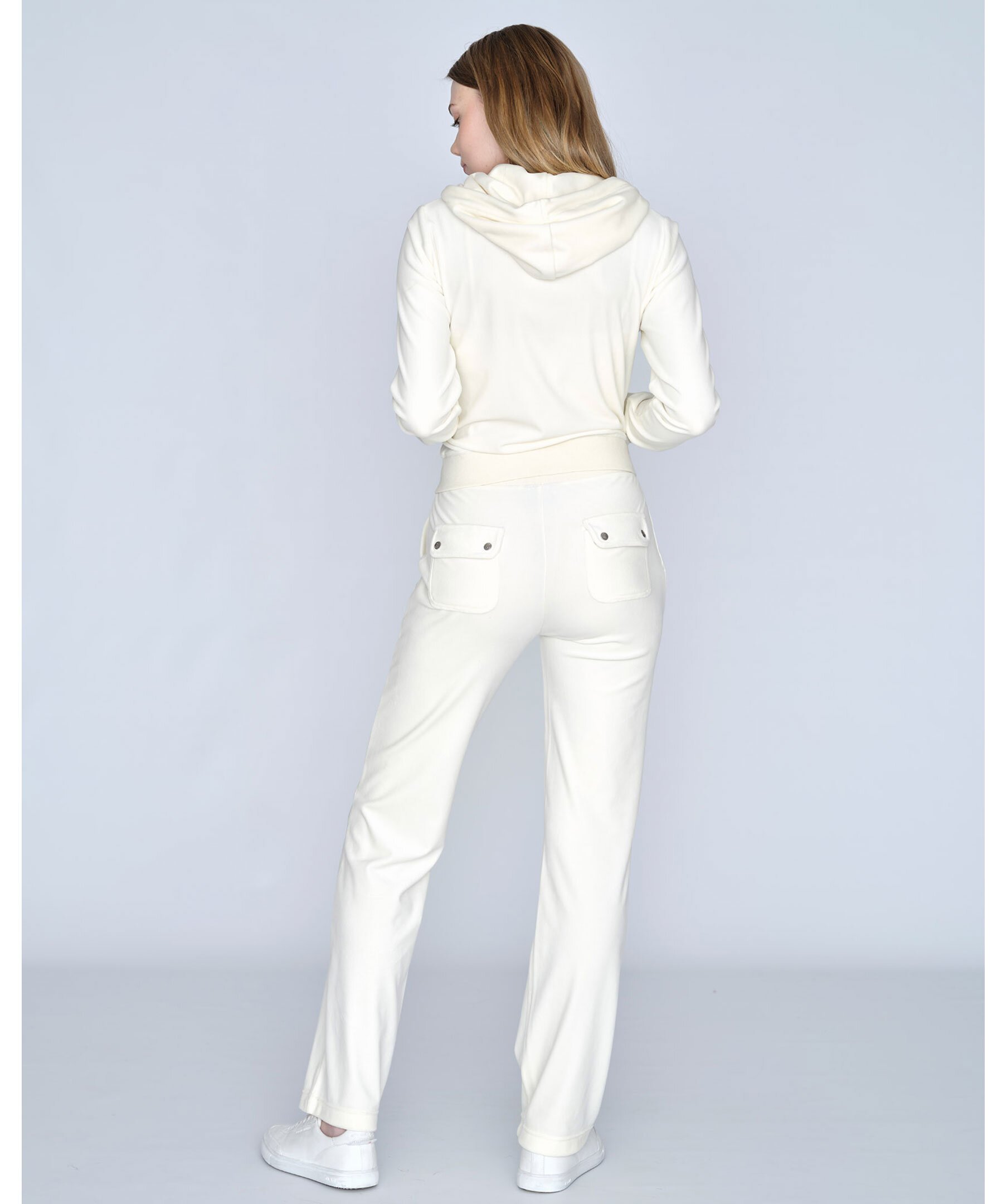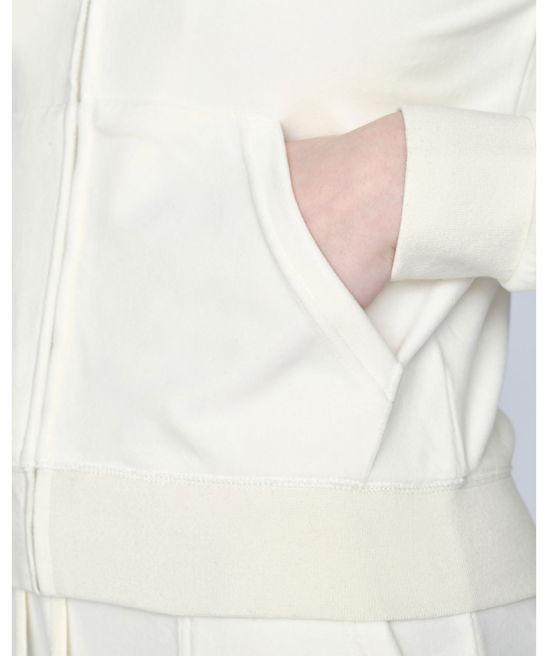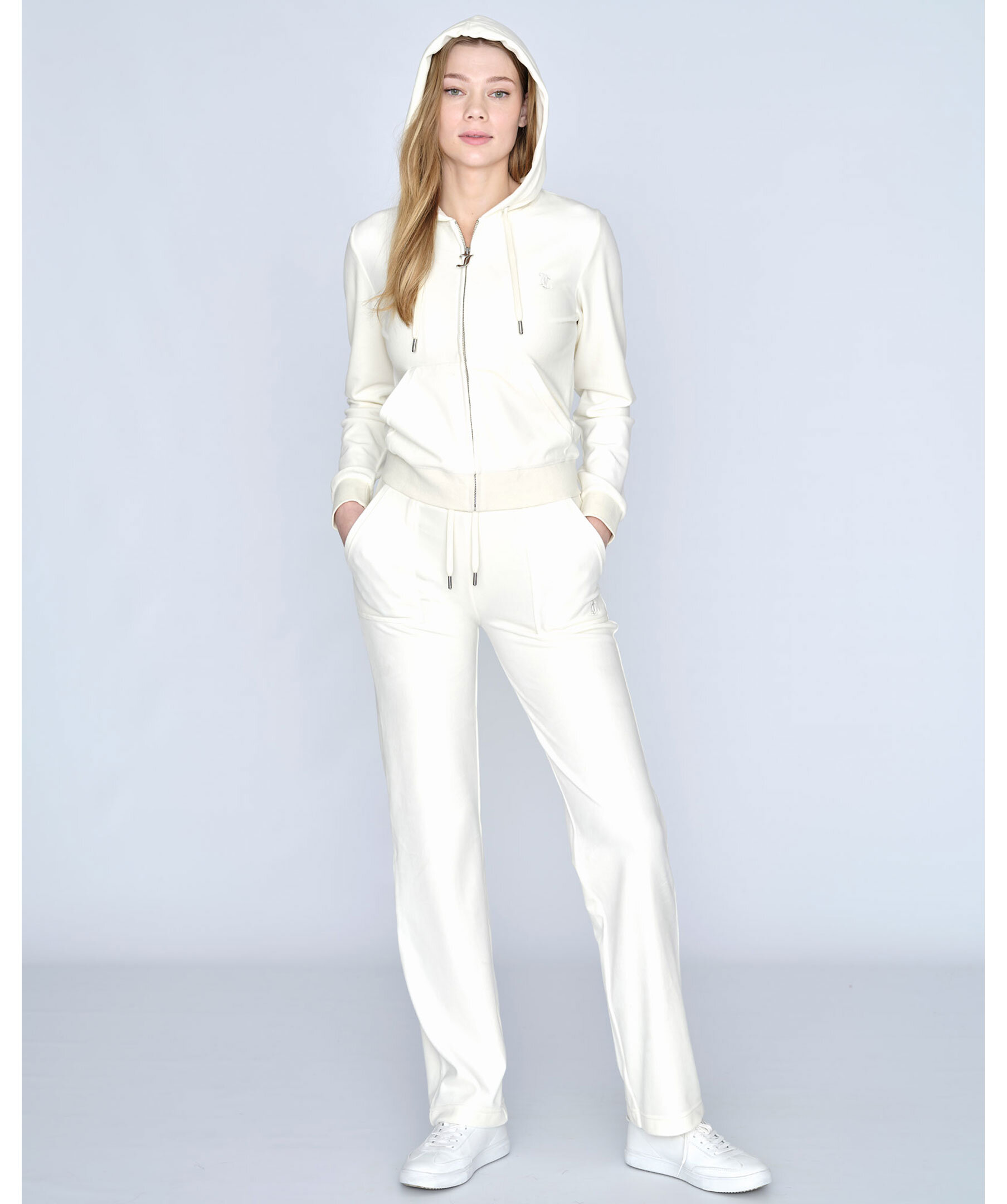 Krämvit hoodie med dragkedja fram i velour från Juicy Couture. Bred mudd i plaggslut och i ärmslut, broderad logotyp i ton-i-ton på bröstet på vänster sida. Snörning i luvan och fickor fram.