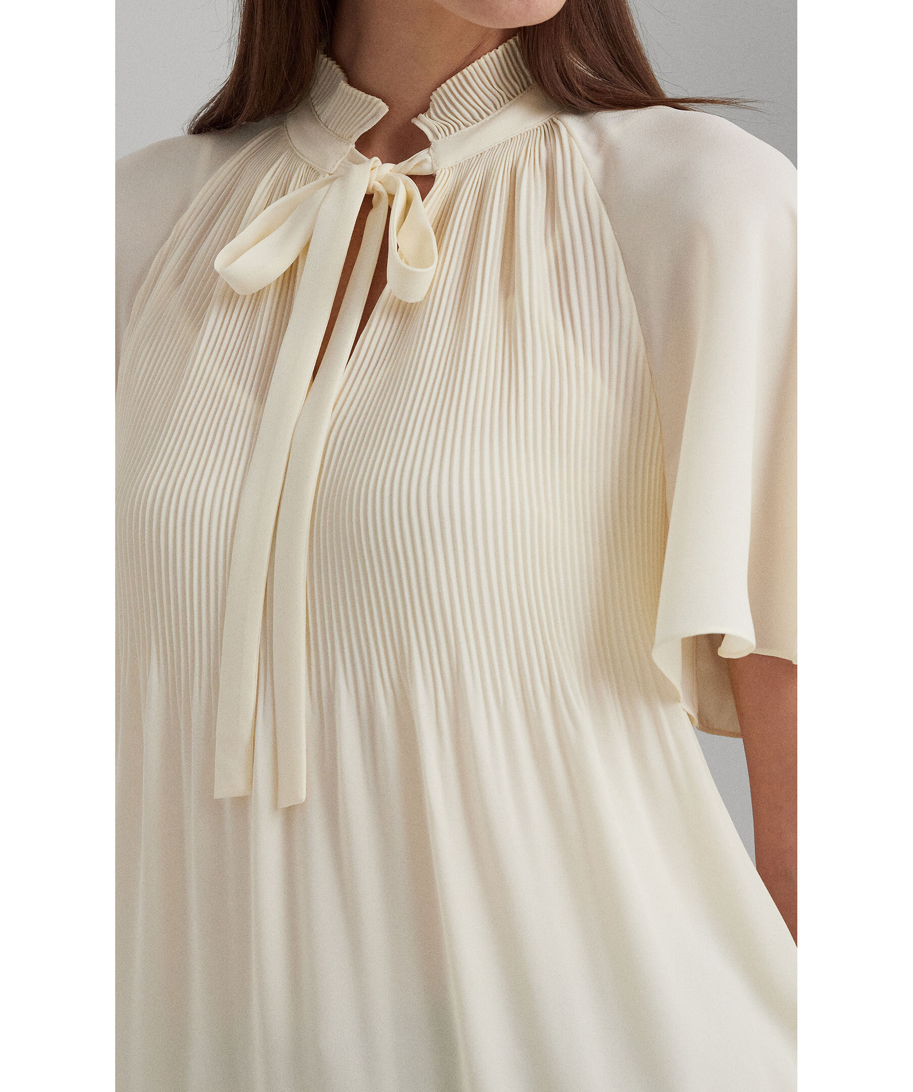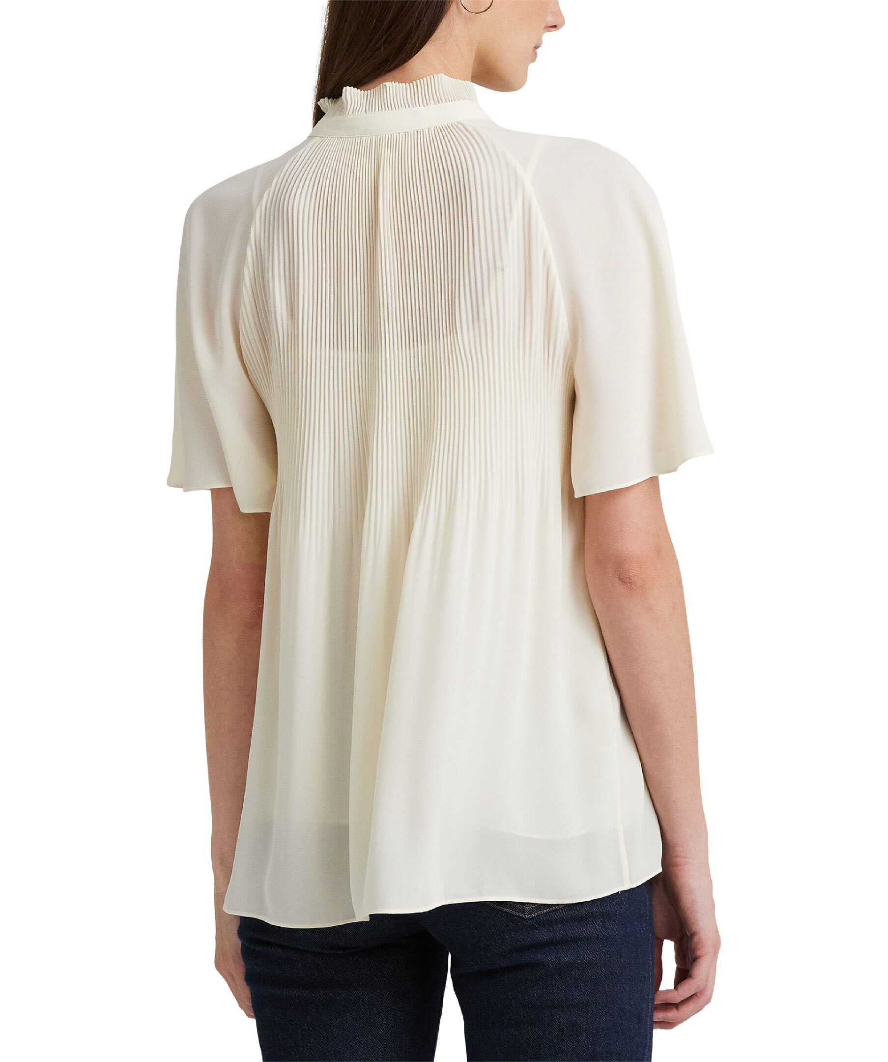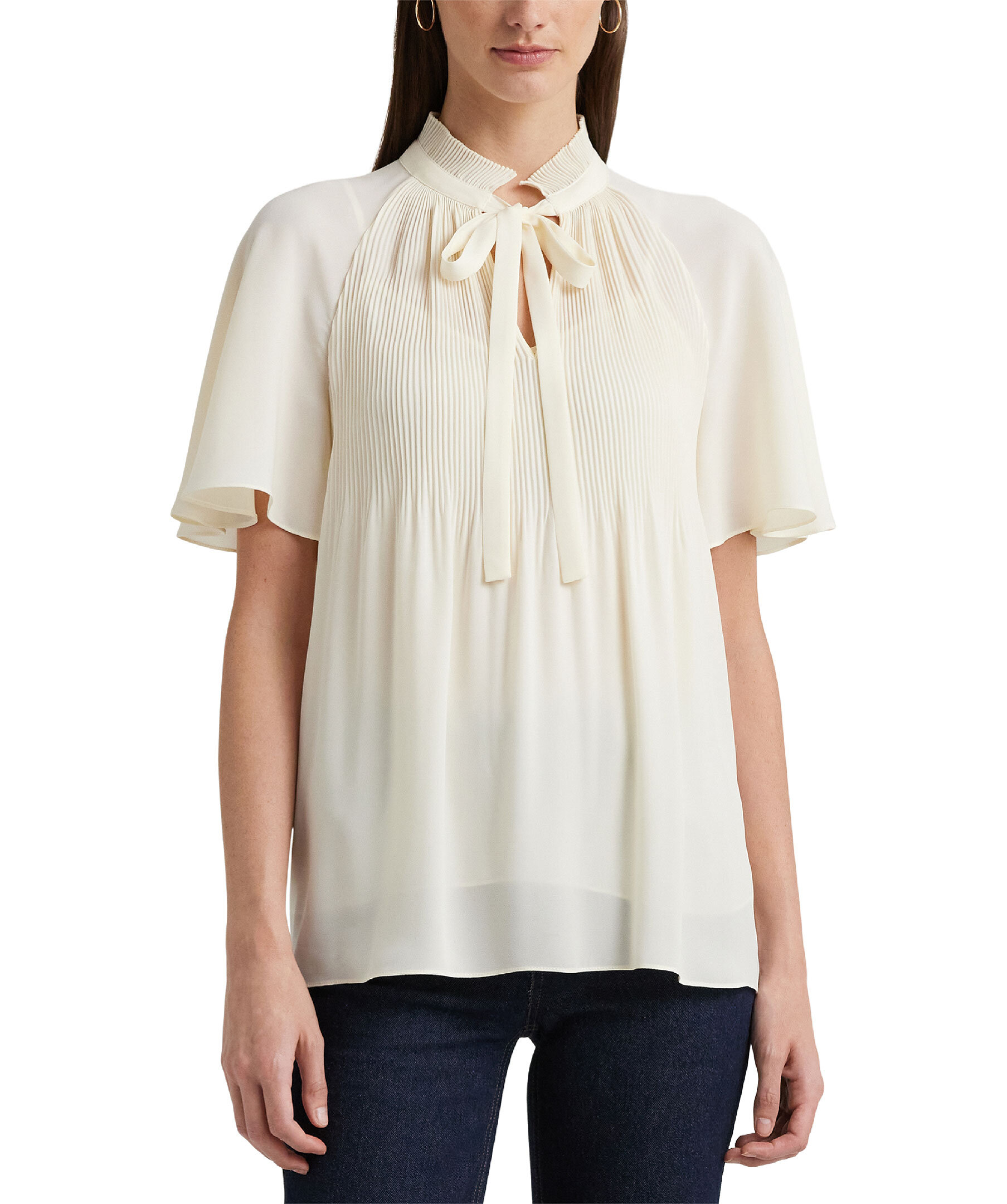 Krämvit blus från Lauren Ralph Lauren. Skuren för en luftig, avslappnad siluett och kännetecknas av fladderärmar och Sunray-plisserad bandkrage med självband. Tillverkad med semi-transparent georgette, kommer den med ett camisole-foder för opacitet.