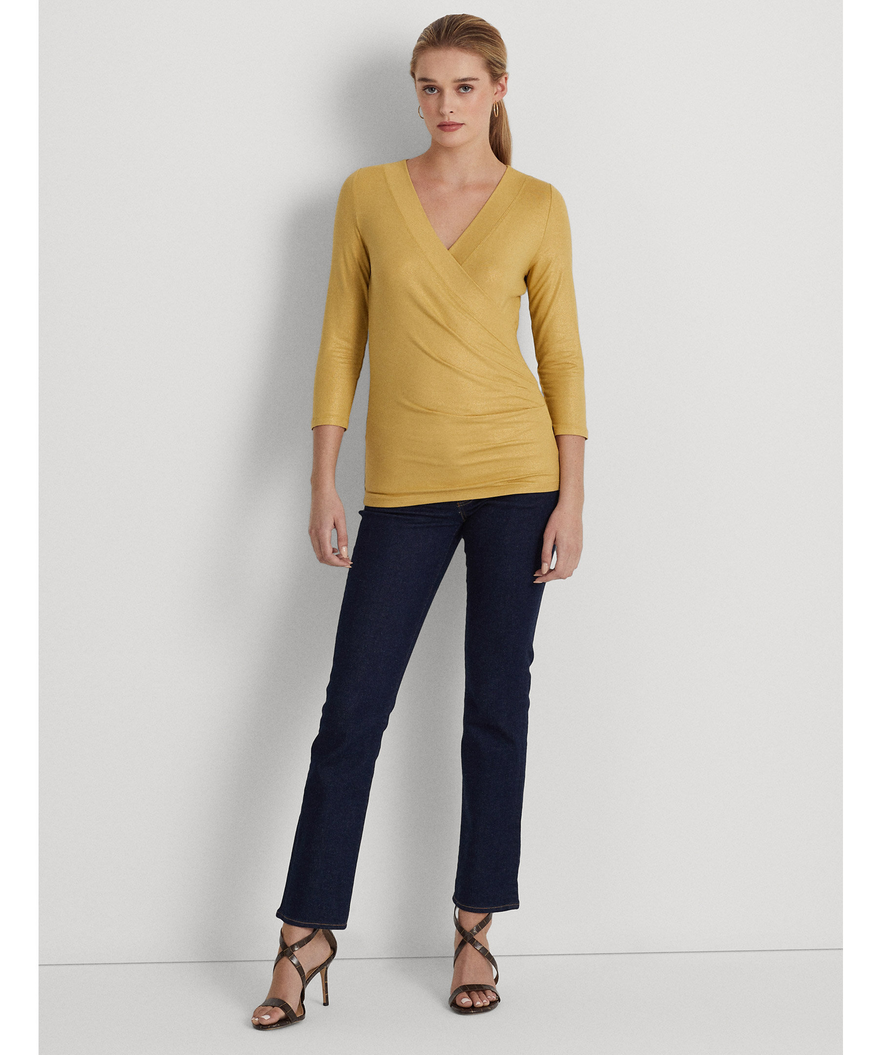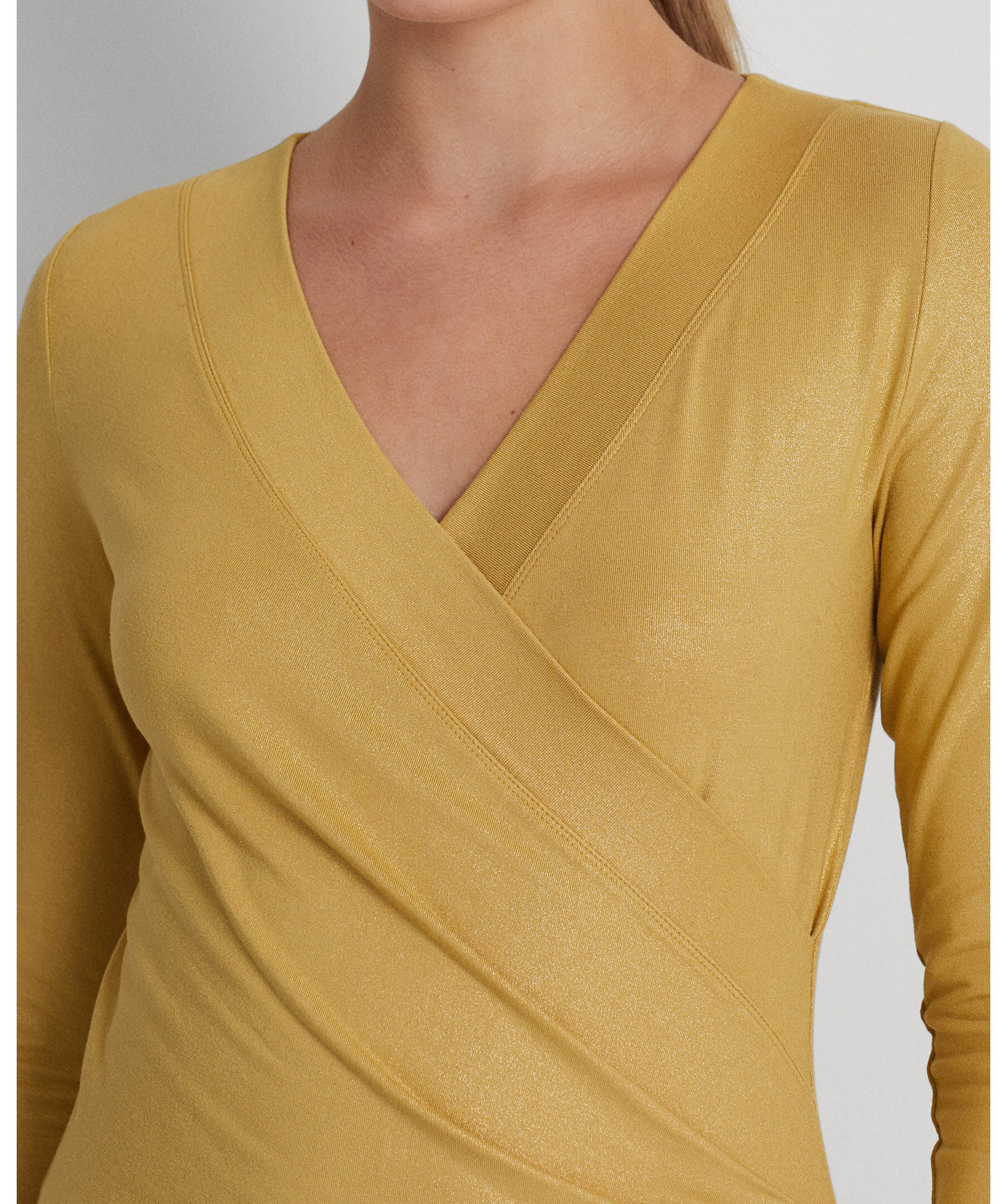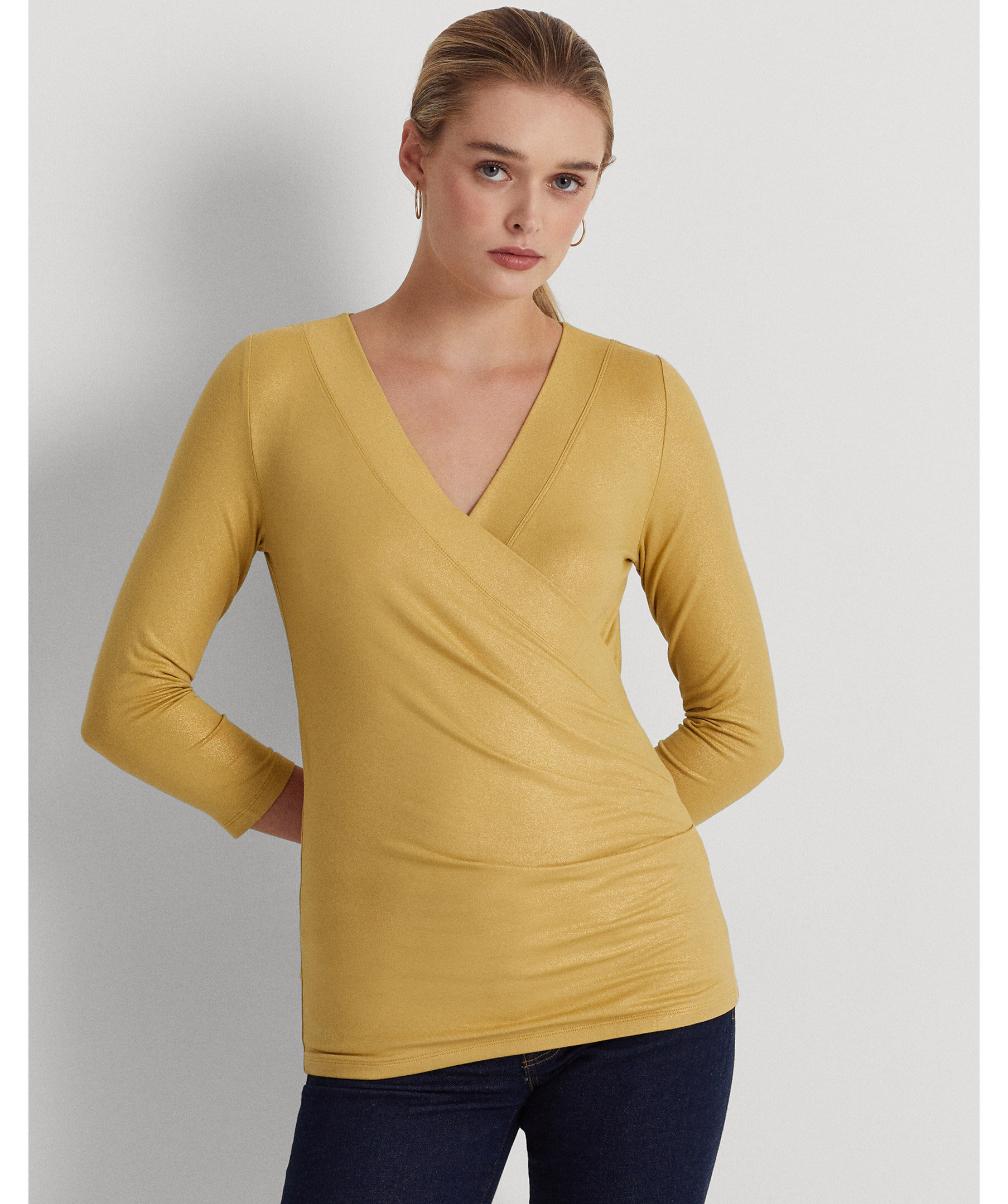 Guldfärgad, skimrig topp med trekvartsärm i en smal passform från Lauren Ralph Lauren. Tillverkad i stretchig viskos. V-ringad hals med en dekorativ omlott skurning.