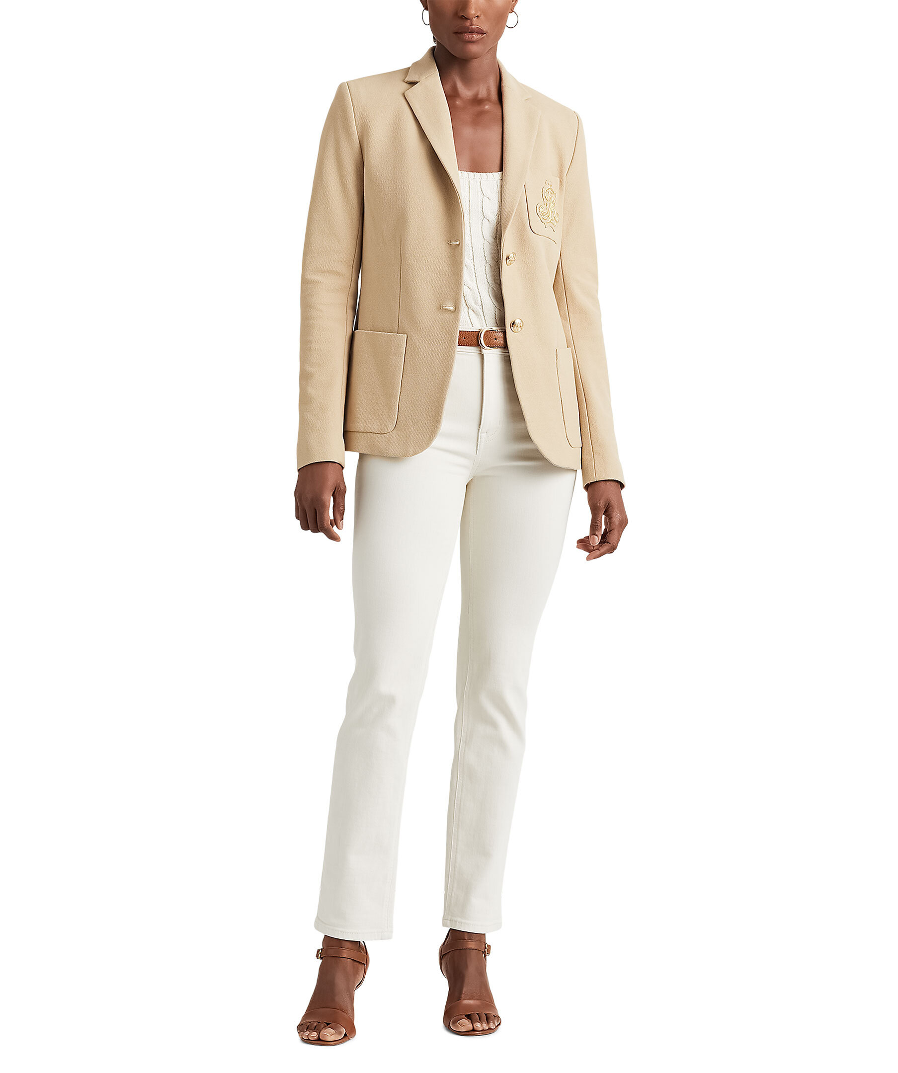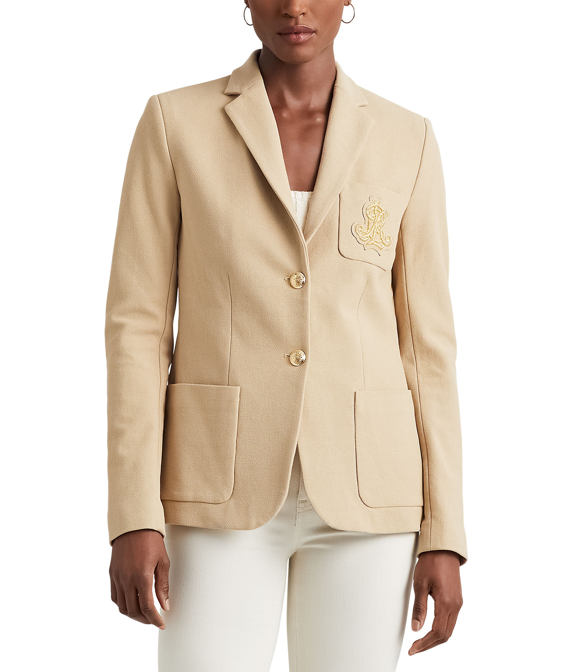 Beige kavaj från Lauren Ralph Lauren. Guldfärgade knappar i metall. Bröstficka på vänster sida med guldfärgat broderi, två fickor framtill. Sprund baktill.