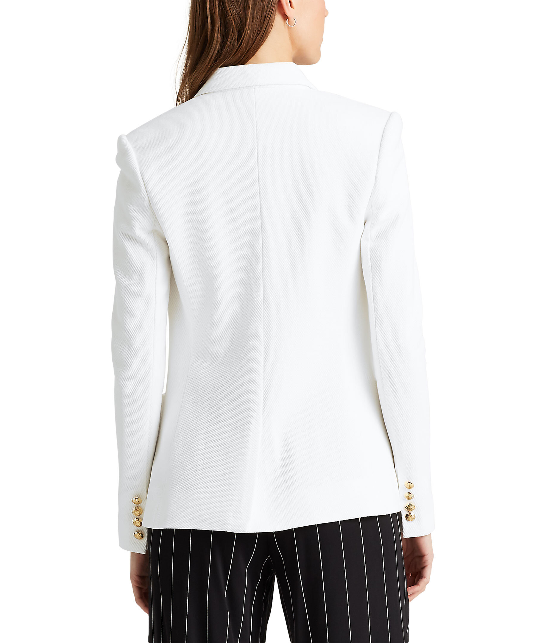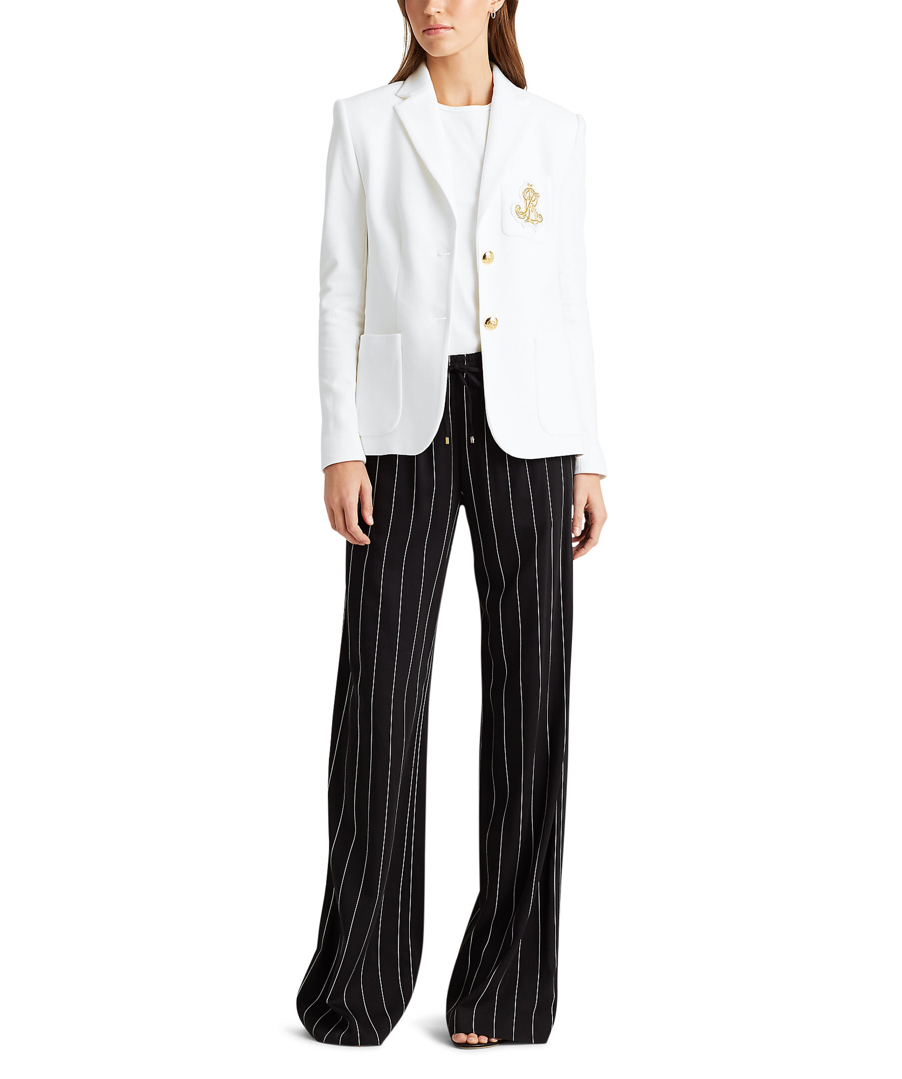 Vit jacquardvävd blazer från Lauren Ralph Lauren. Gjord i en blandning av bomull och elastan. Blazern har en smal passform, trubbiga slag, två framfickor och en liten bröstficka med en vapensköld på utsidan. Stängs med eleganta guldfärgade knappar framtill.