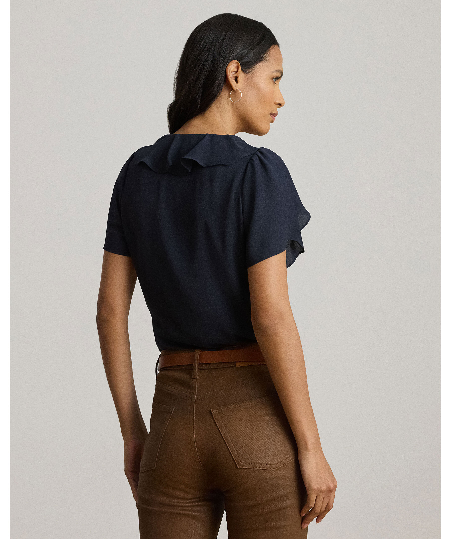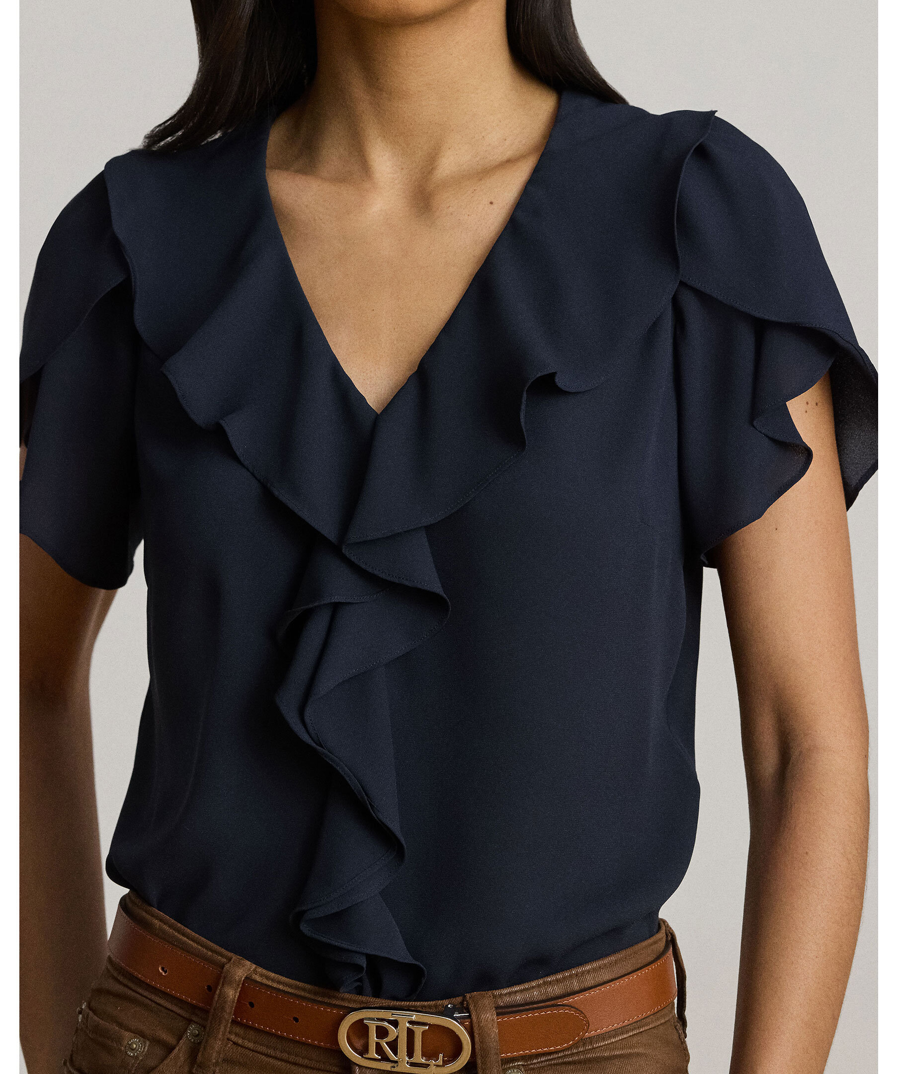 Marinblå, romantisk blus från Lauren Ralph Lauren. Gjord i luftig georgette med volangkantad V-ringning och korta tulpanärmar. Volangdetaljer framtill och en avslappnad passform ger ett mjukt, feminint uttryck.