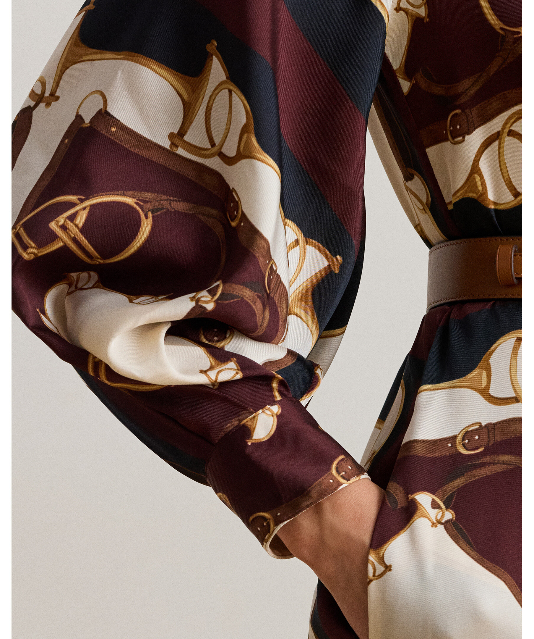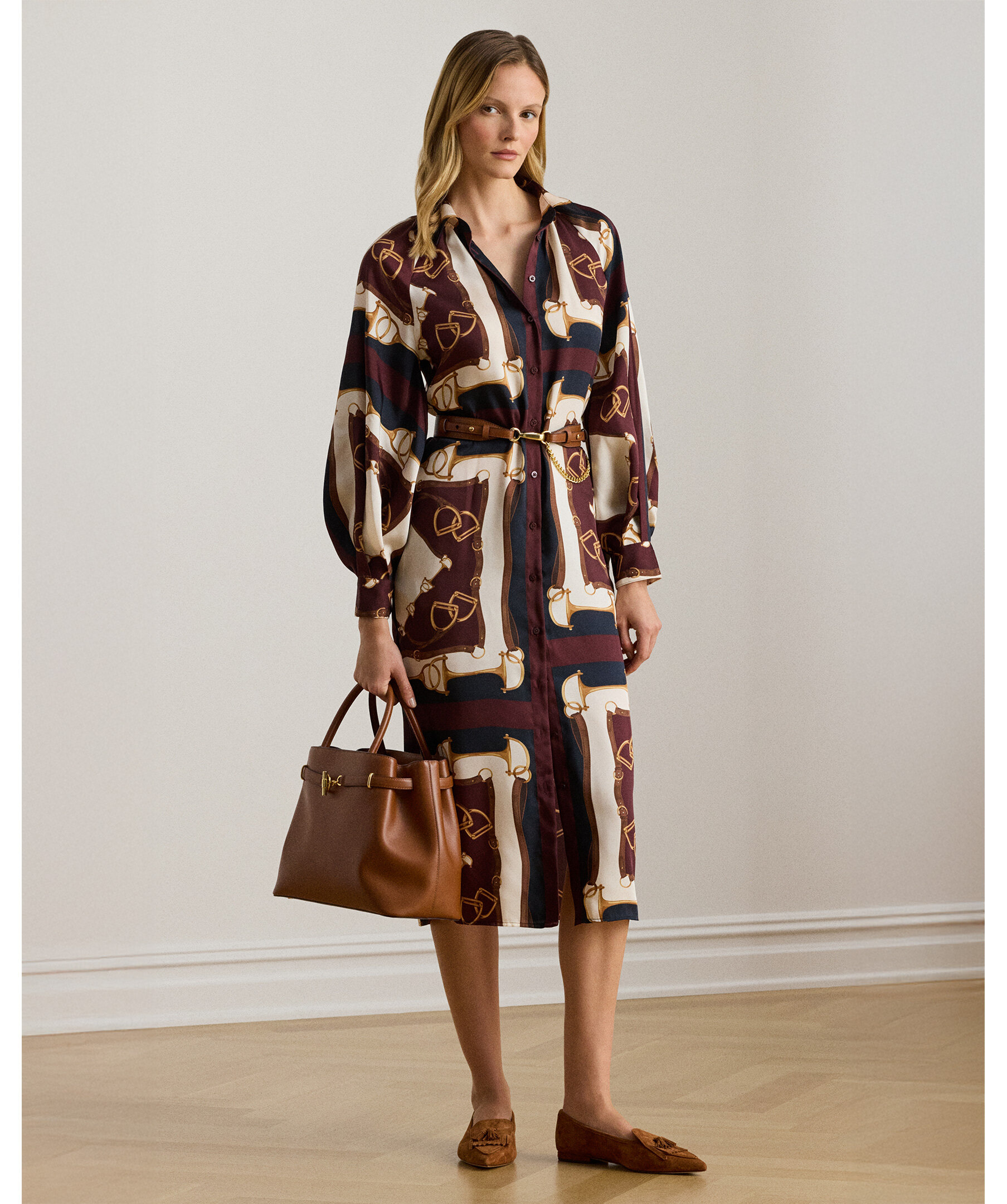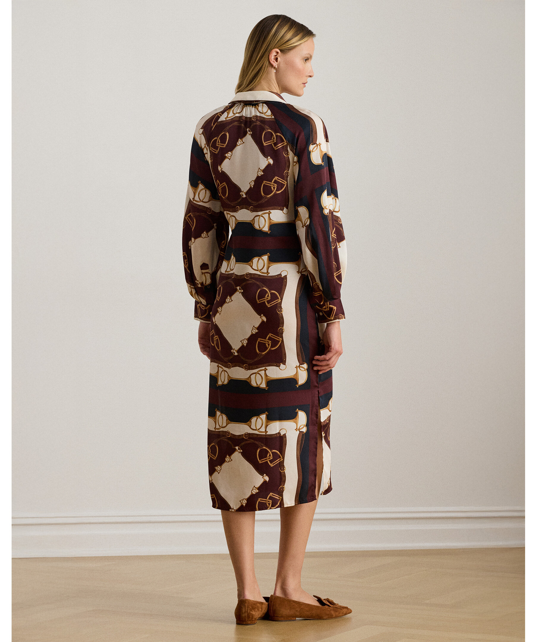 Midi-klänning i twill med equestrian-inspirerat print från Lauren Ralph Lauren. Klänningen har en klassisk skjortdesign med krage och knappslå fram, långa puffade raglanärmar som ger en elegant silhuett och ett midilängdigt fall som når under knät för en stilfull look. Det sofistikerade printet i marinblått och cream ger en tidlös, dressad känsla med subtilt sportig Ralph Lauren-estetik.