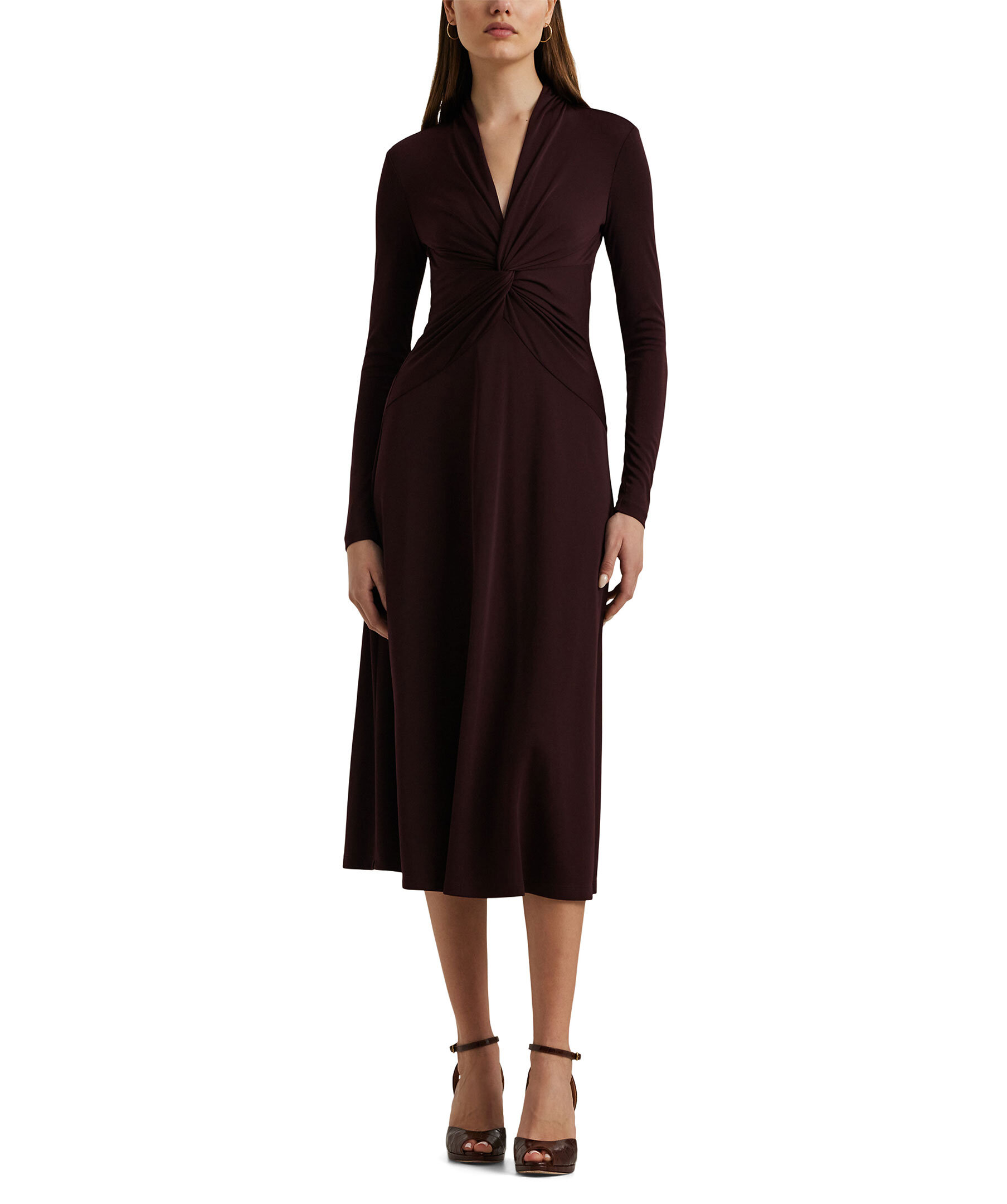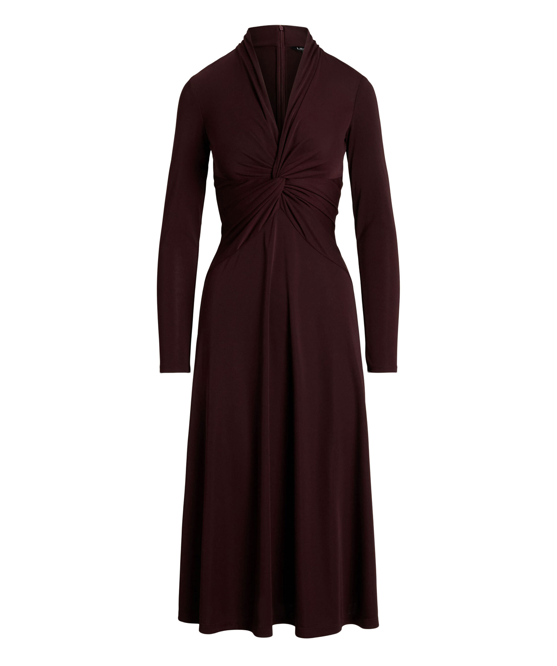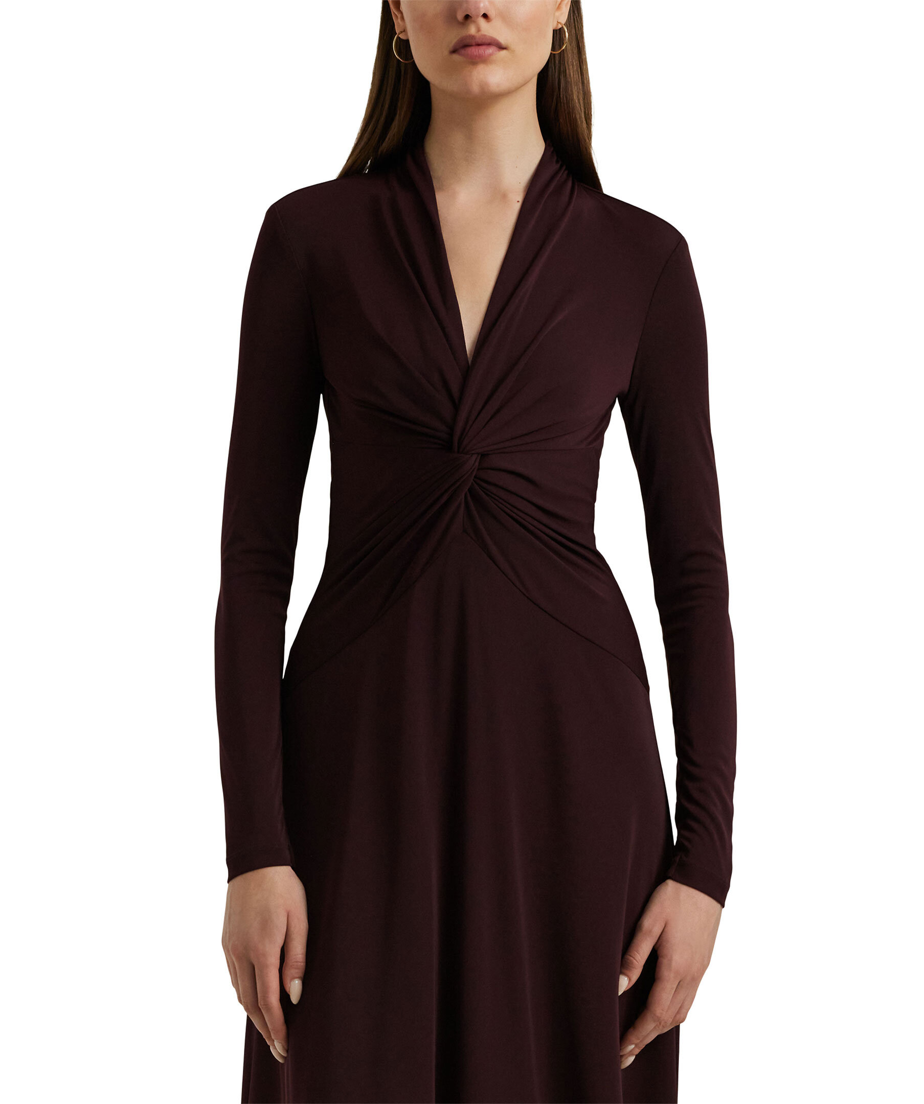 Vinröd figursydd långärmad klänning från Lauren Ralph Lauren. Tvist detalj framtill som framhäver klänningens form. Den är tillverkad av jerseymaterial med stretch för en mjuk känsla och enkel rörelsefrihet. V-ringad hals. Dold dragkedja baktill. Modellen är 178cm lång och har på sig strl 36.
