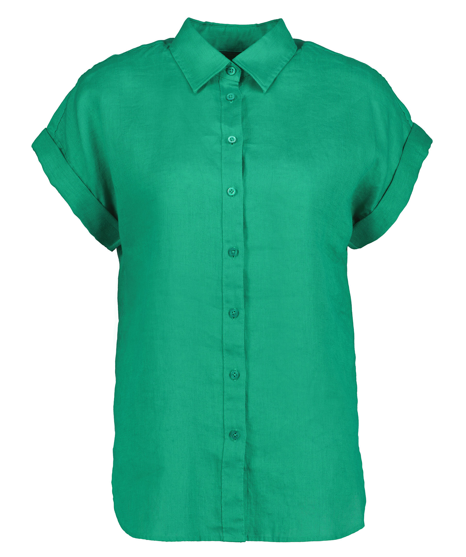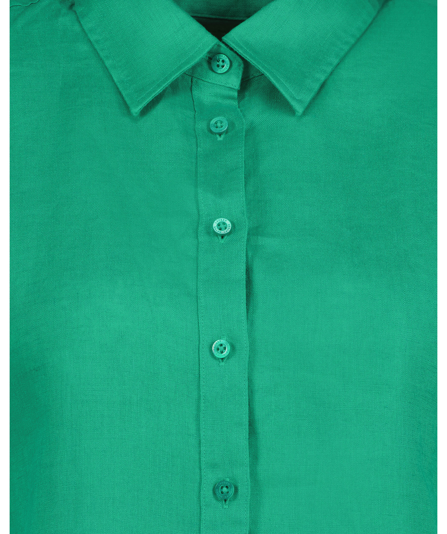 Grön, kortärmad skjorta i linne från Lauren Ralph Lauren. Klassisk krage, gröna knappar fram och spetsig krage. Upprullade ärmar och avslappnad passform. Tillverkad i 100% linne.