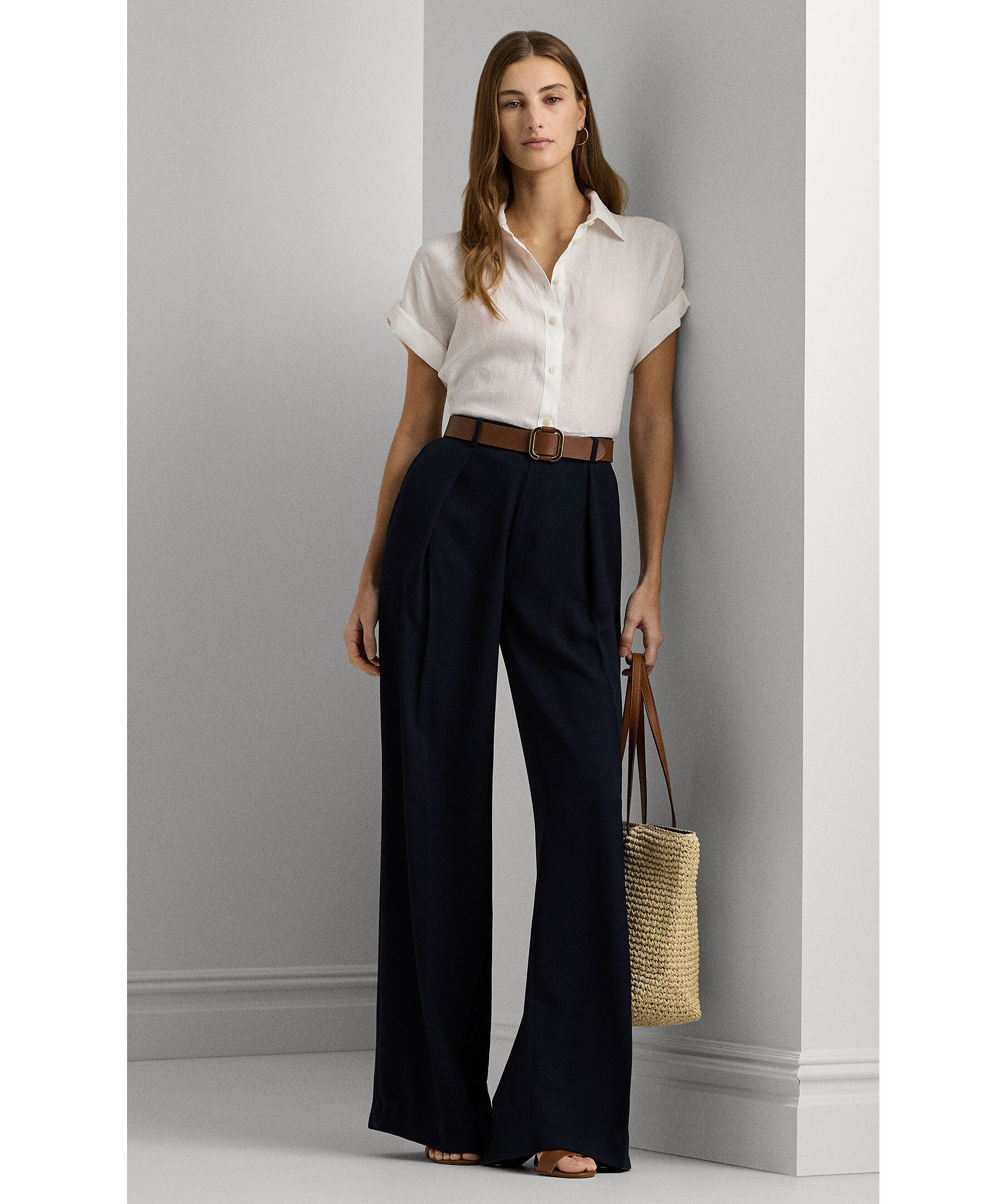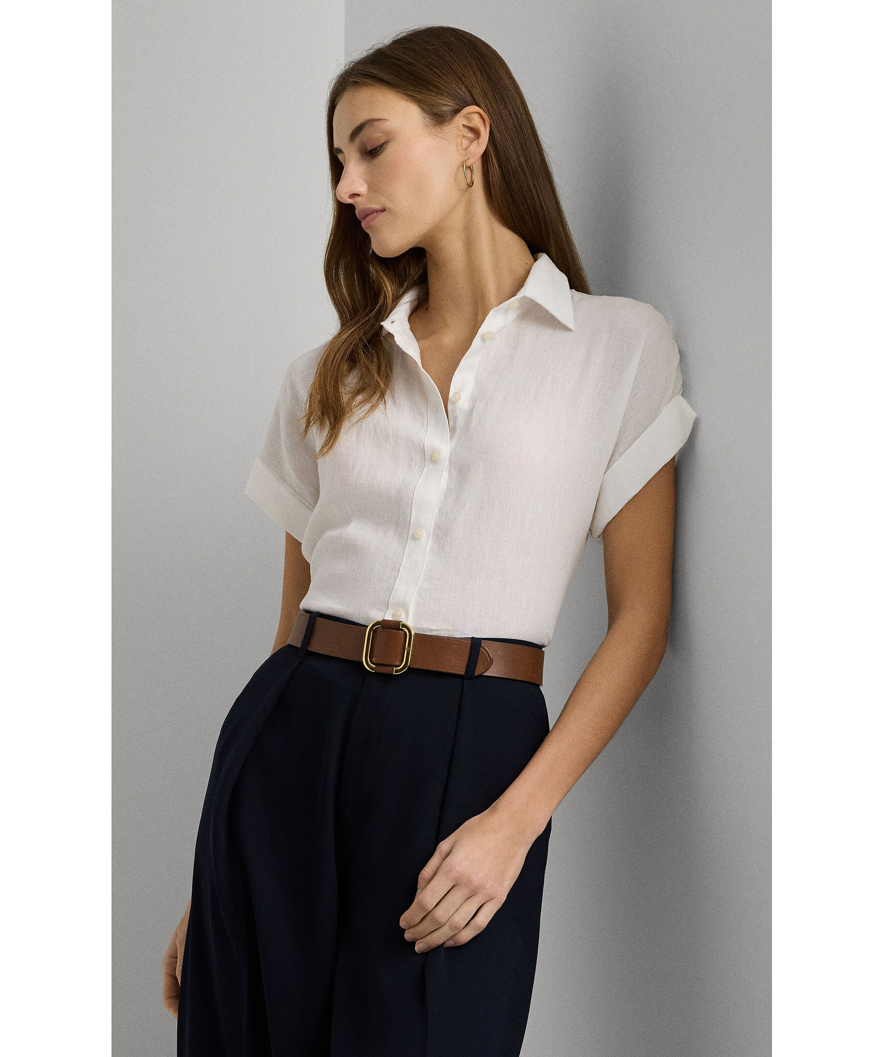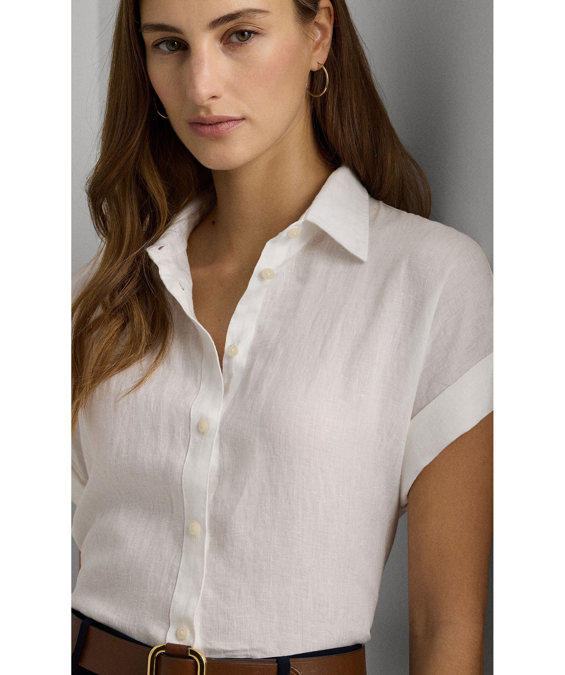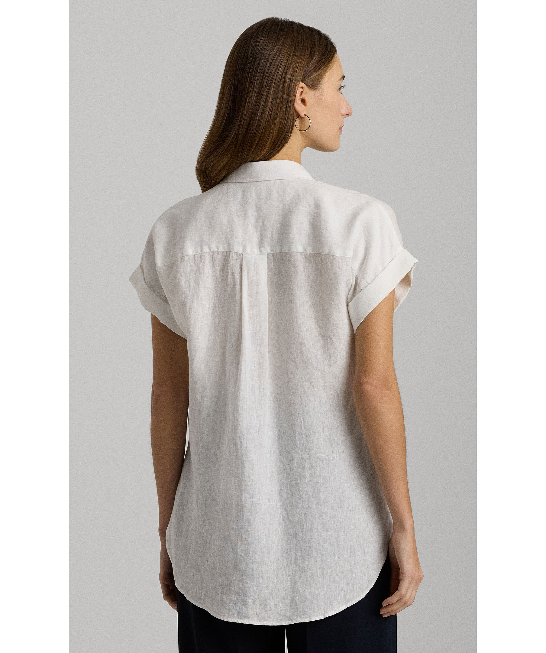 Vit linneblus med korta dolmanärmar och upprullade ärmslut från Lauren Ralph Lauren. Tillverkad av luftigt linne och har en avslappnad passform som är perfekt för både formella och avslappnade tillfällen. Blusen har en klassisk skjortkrage och knäppning framtill.
