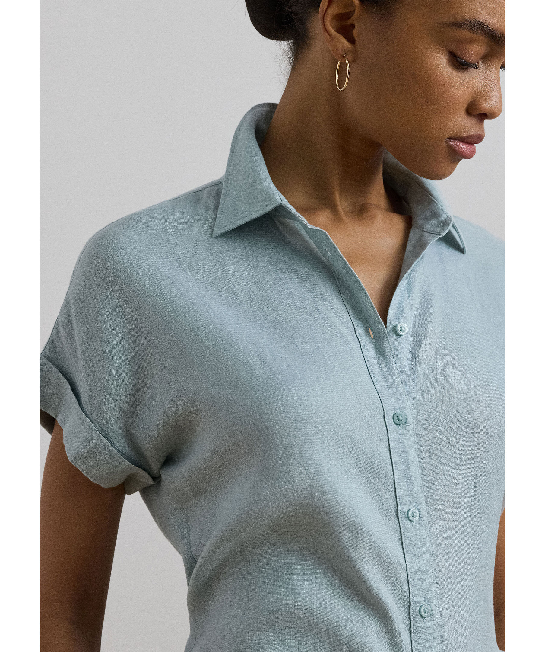 Ljusblå, kortärmad skjorta i linne från Lauren Ralph Lauren. Klassisk krage, knappar fram och spetsig krage. Upprullade ärmar och avslappnad passform. Tillverkad i 100% linne.