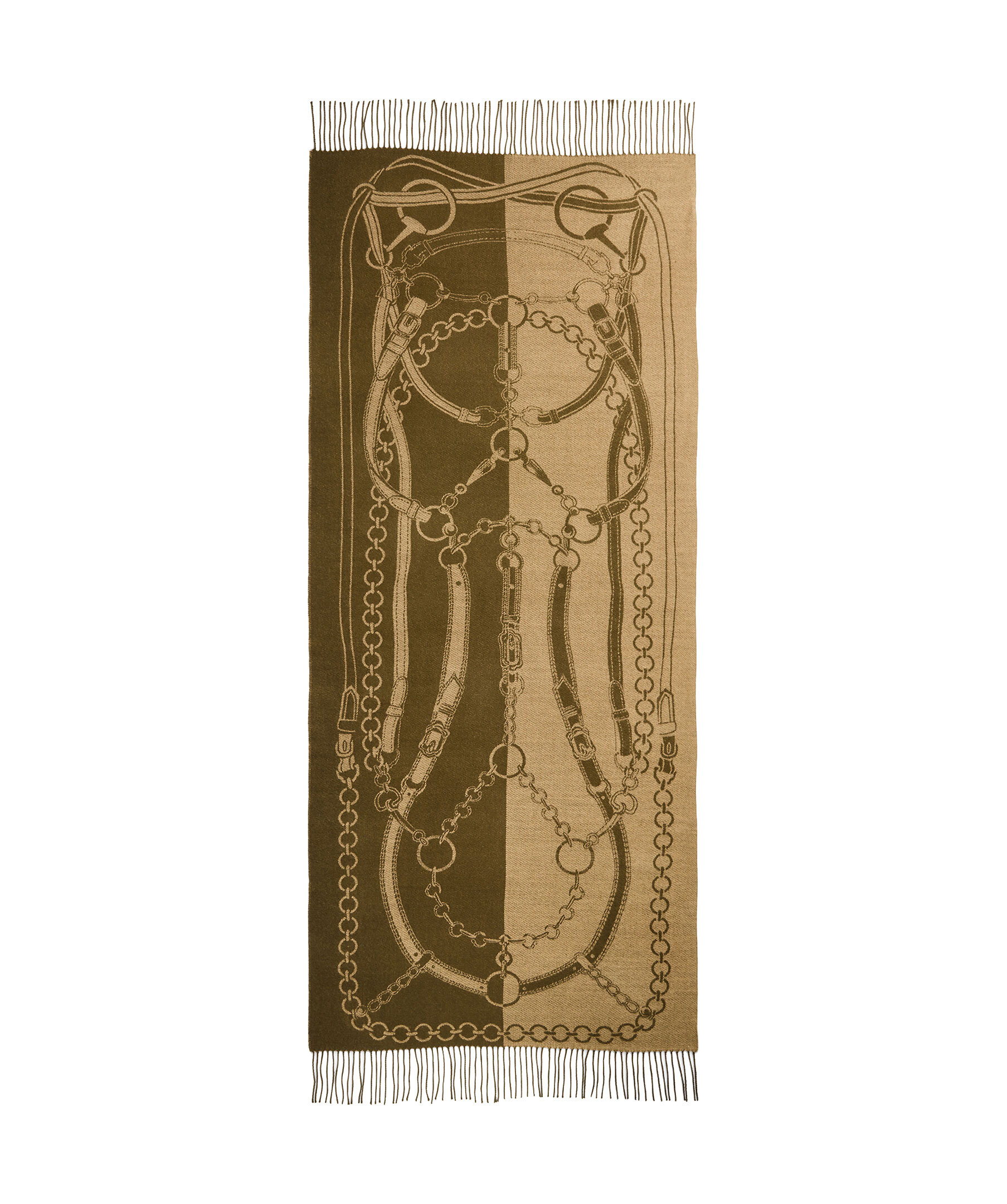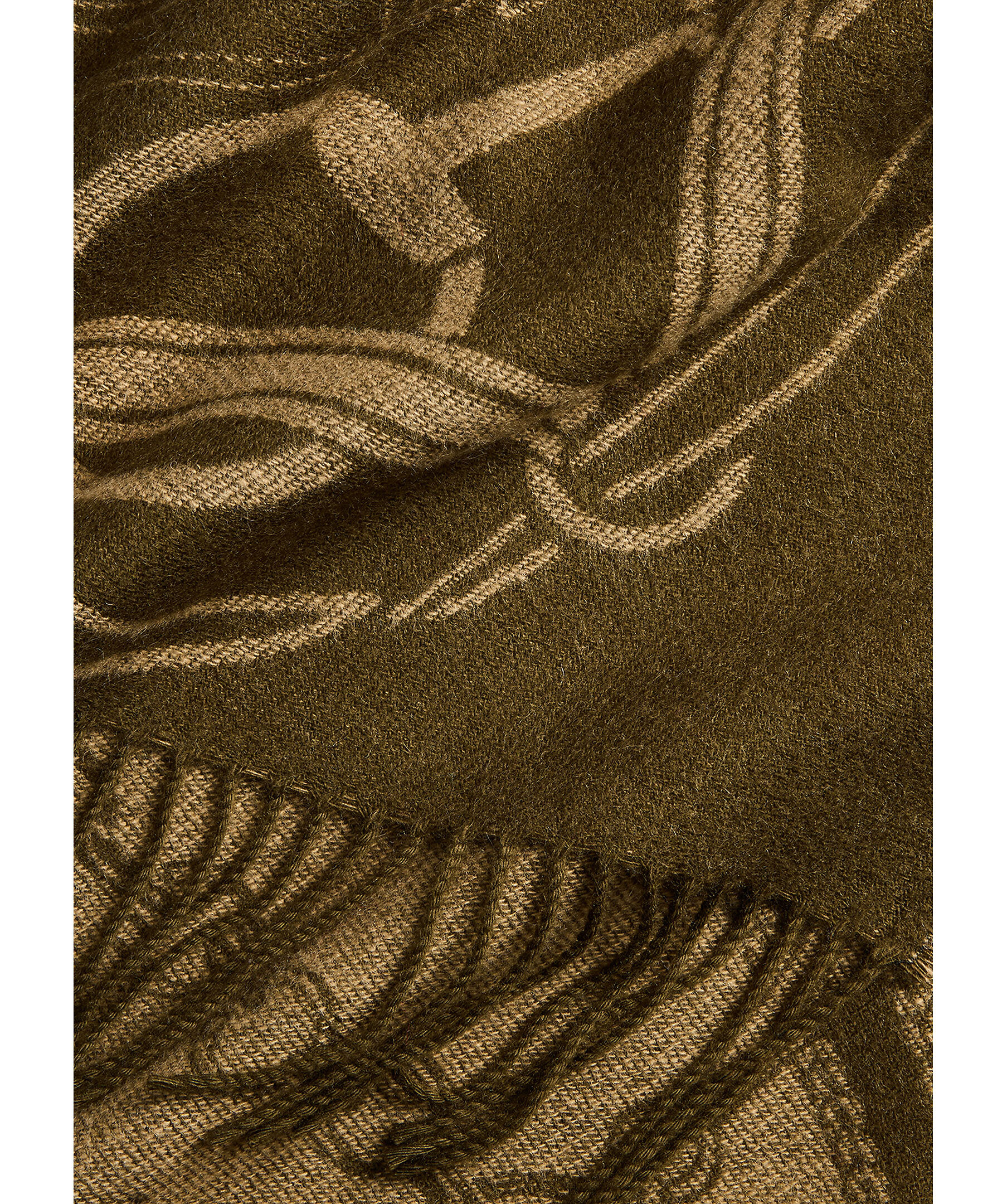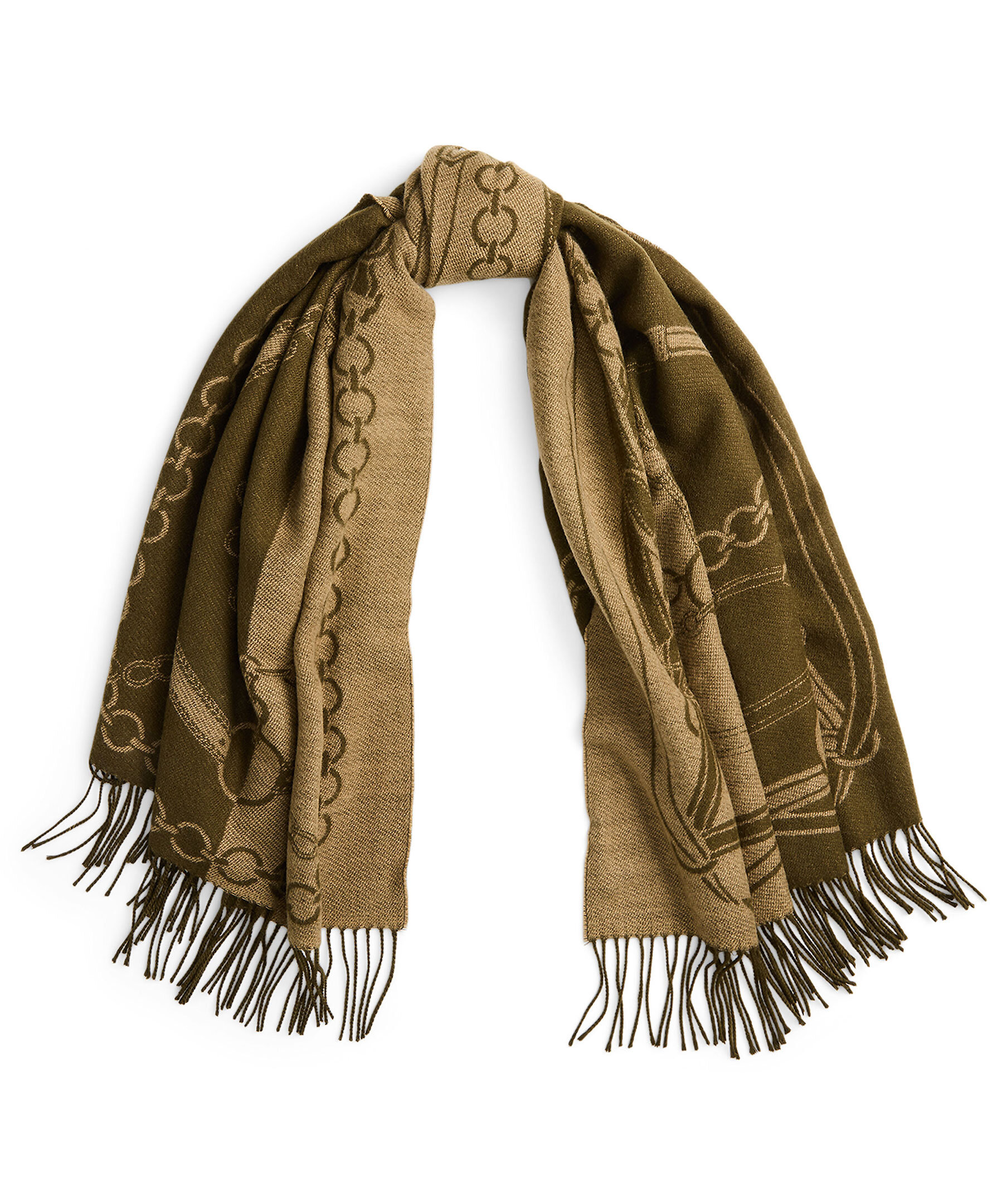 Olivgrön halsduk från Ralph Lauren. Halsduken har ett tränsinspirerat mönster utöver hela halsduken. Fransar i båda ändar. Tillverkad av en ullblandning.