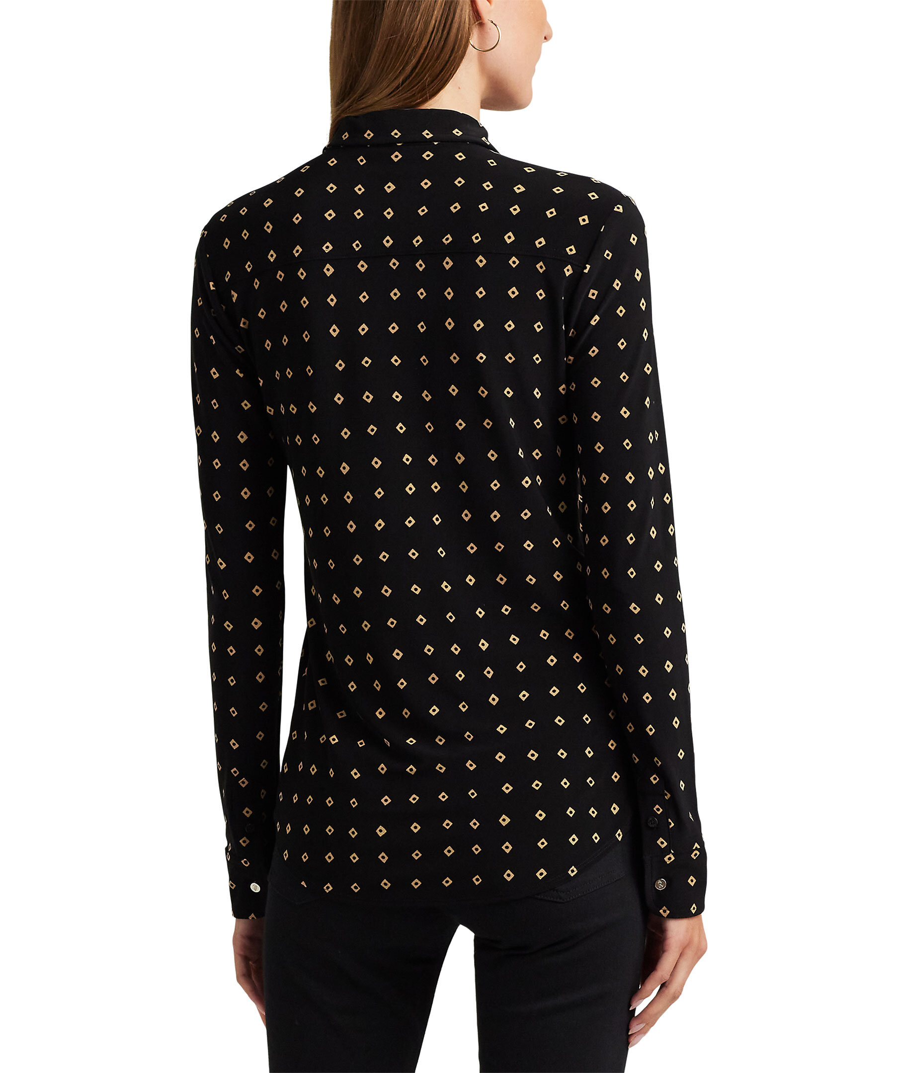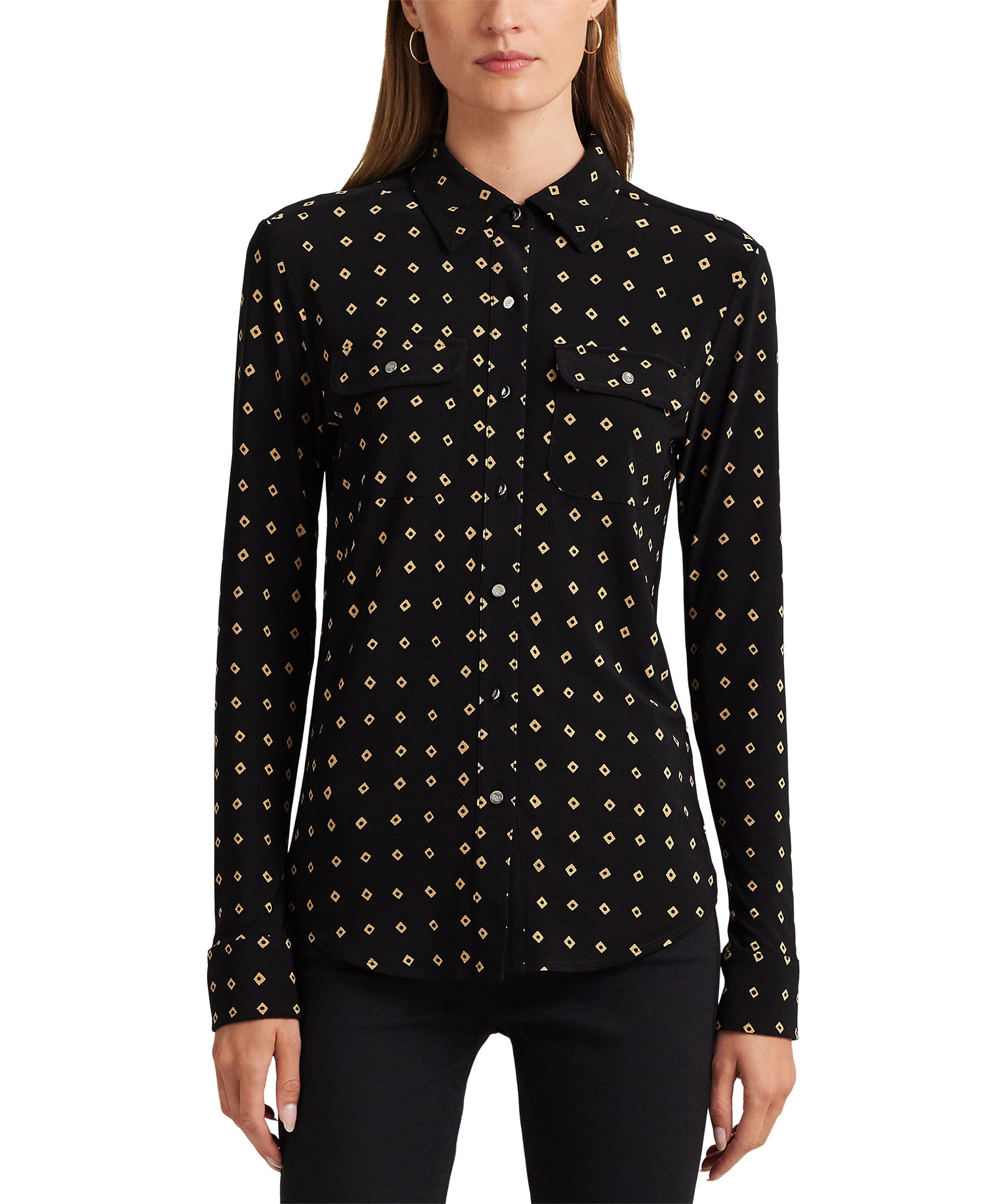 Svart mönstrad skjorta från Lauren Ralph Lauren. Uppdaterad för säsongen med ett snyggt geometriskt tryck, denna raffinerade skjorta är tillverkad av stretch-infunderad jersey för en mjuk hand. "LRL"-graverade knappar ger en signatur Lauren Ralph Lauren-finish. Rak modell. Designad för att slå i den nedre höften. Två bröstfickor med knäppning med flikar. "LRL"-graverade knappar. Bakre ok. Skjortsvansfåll.
