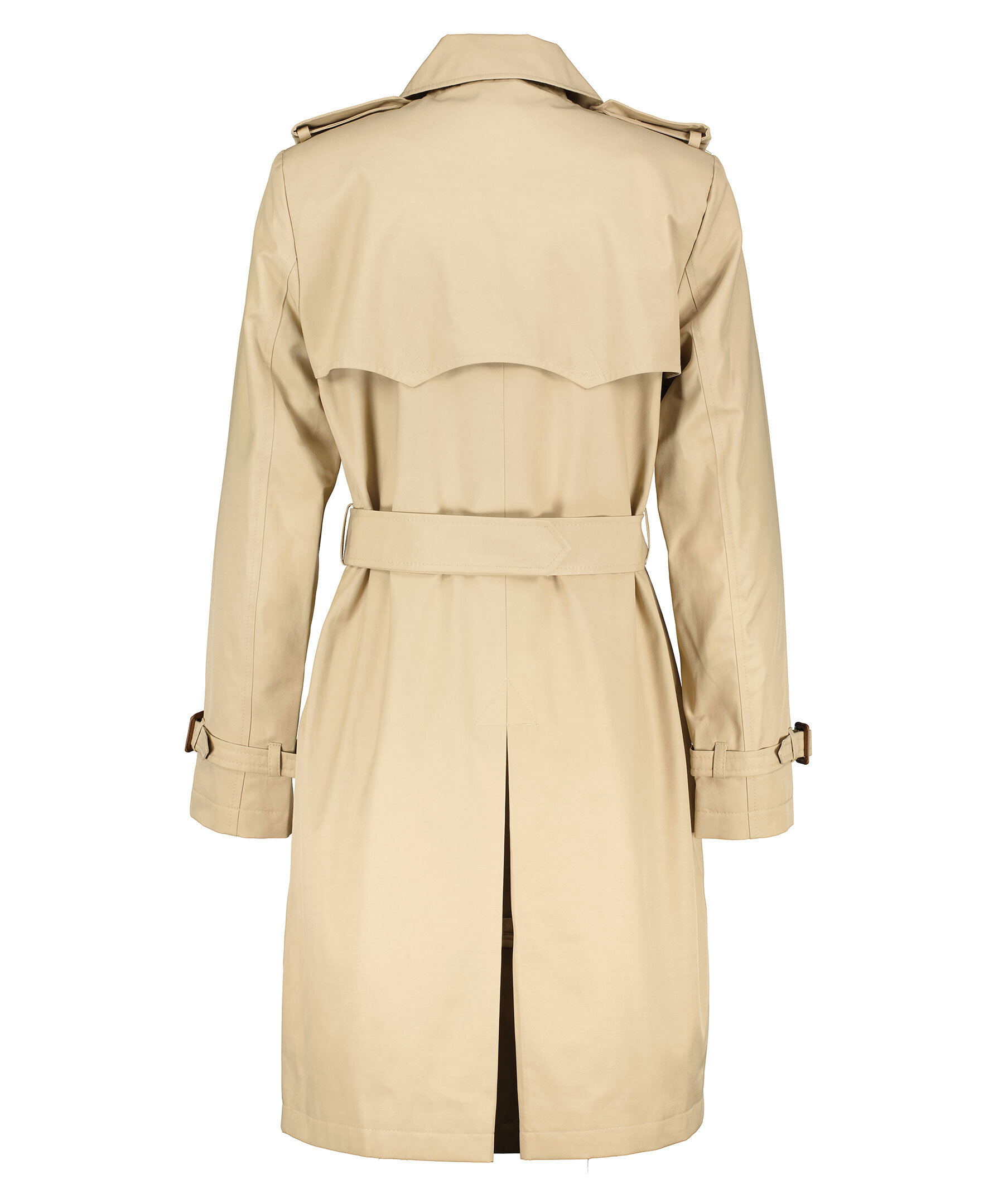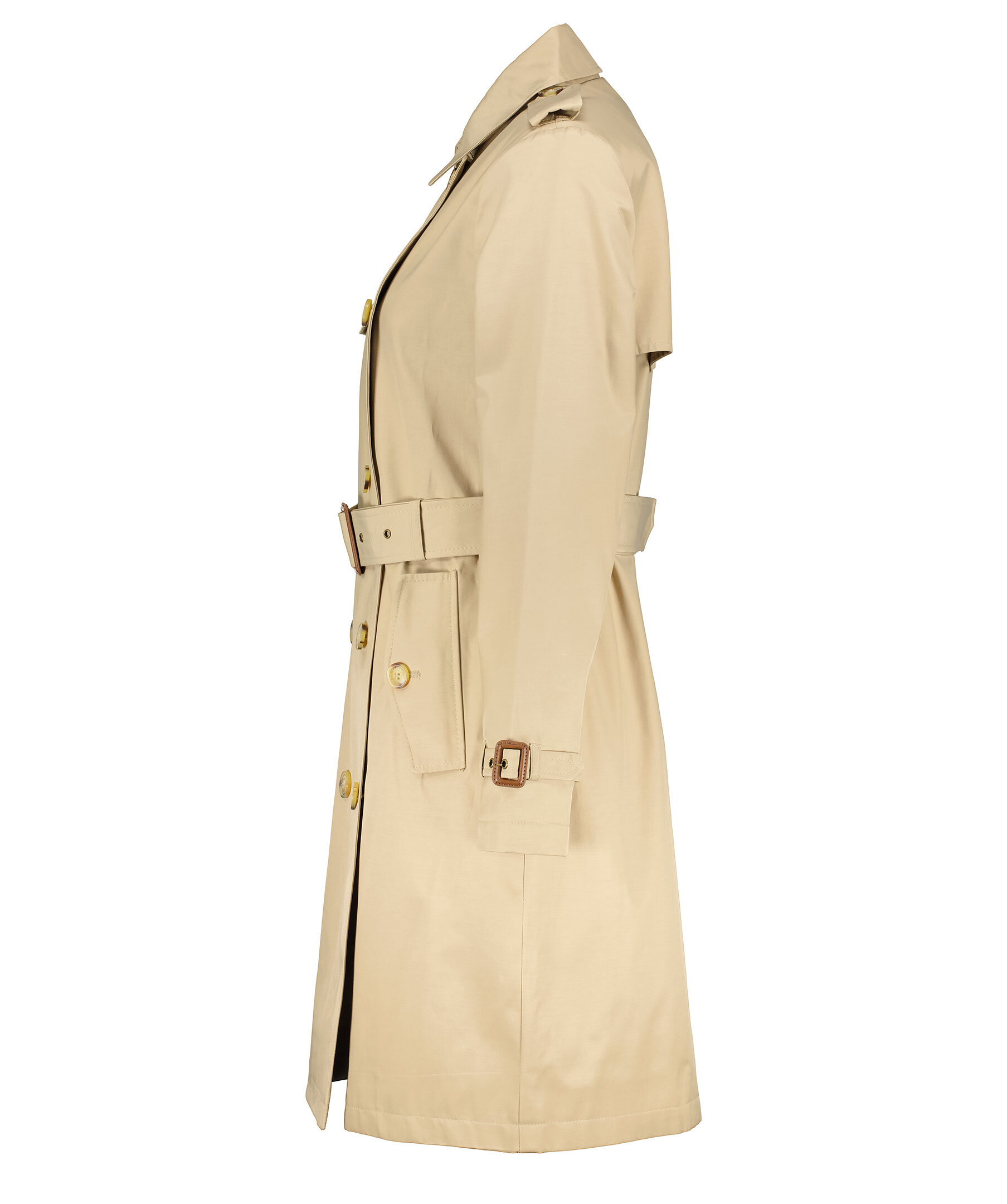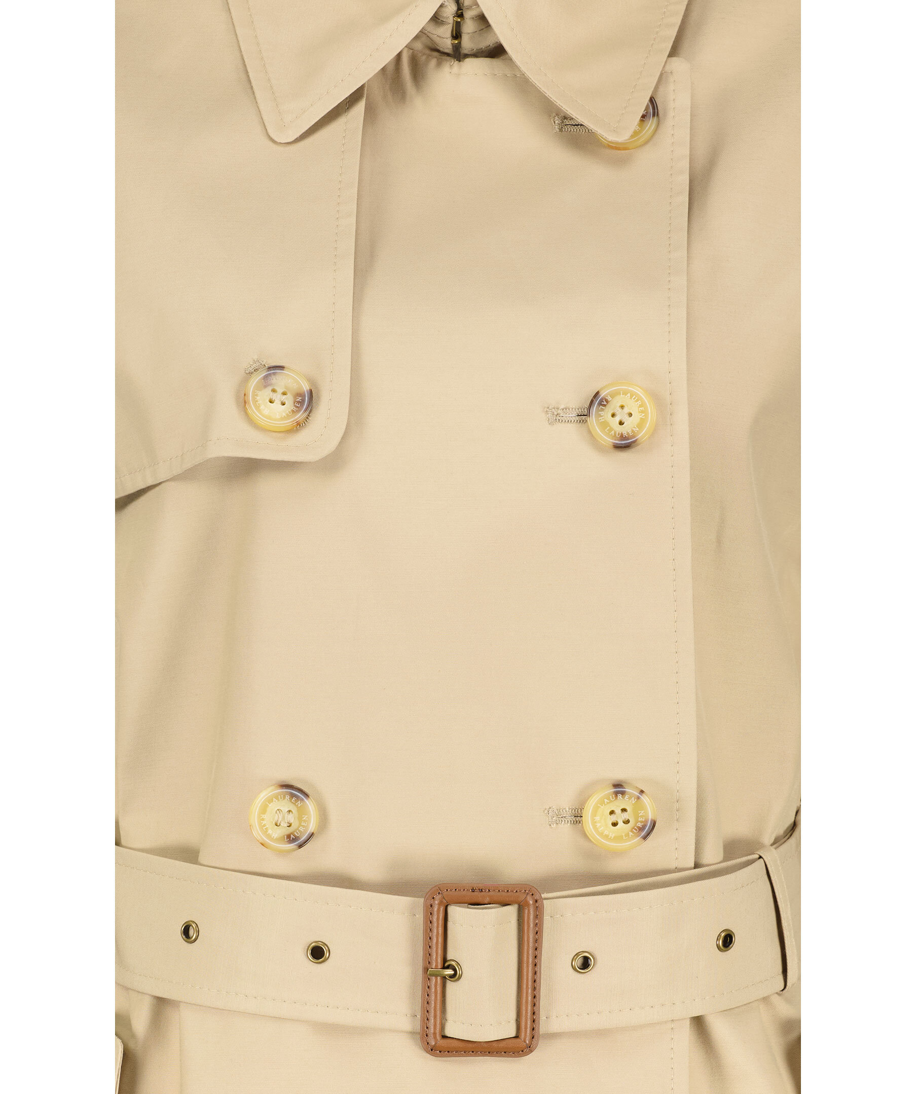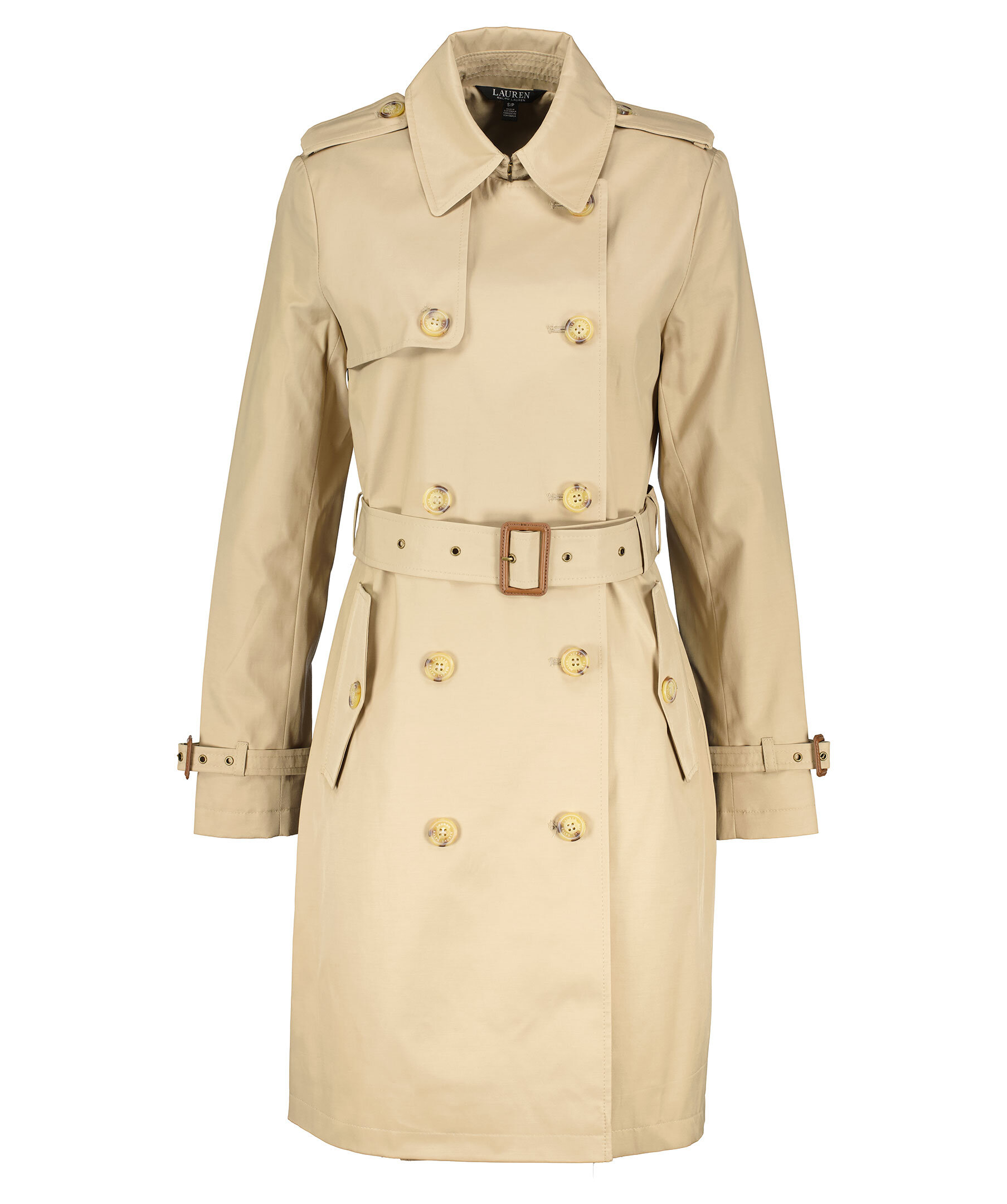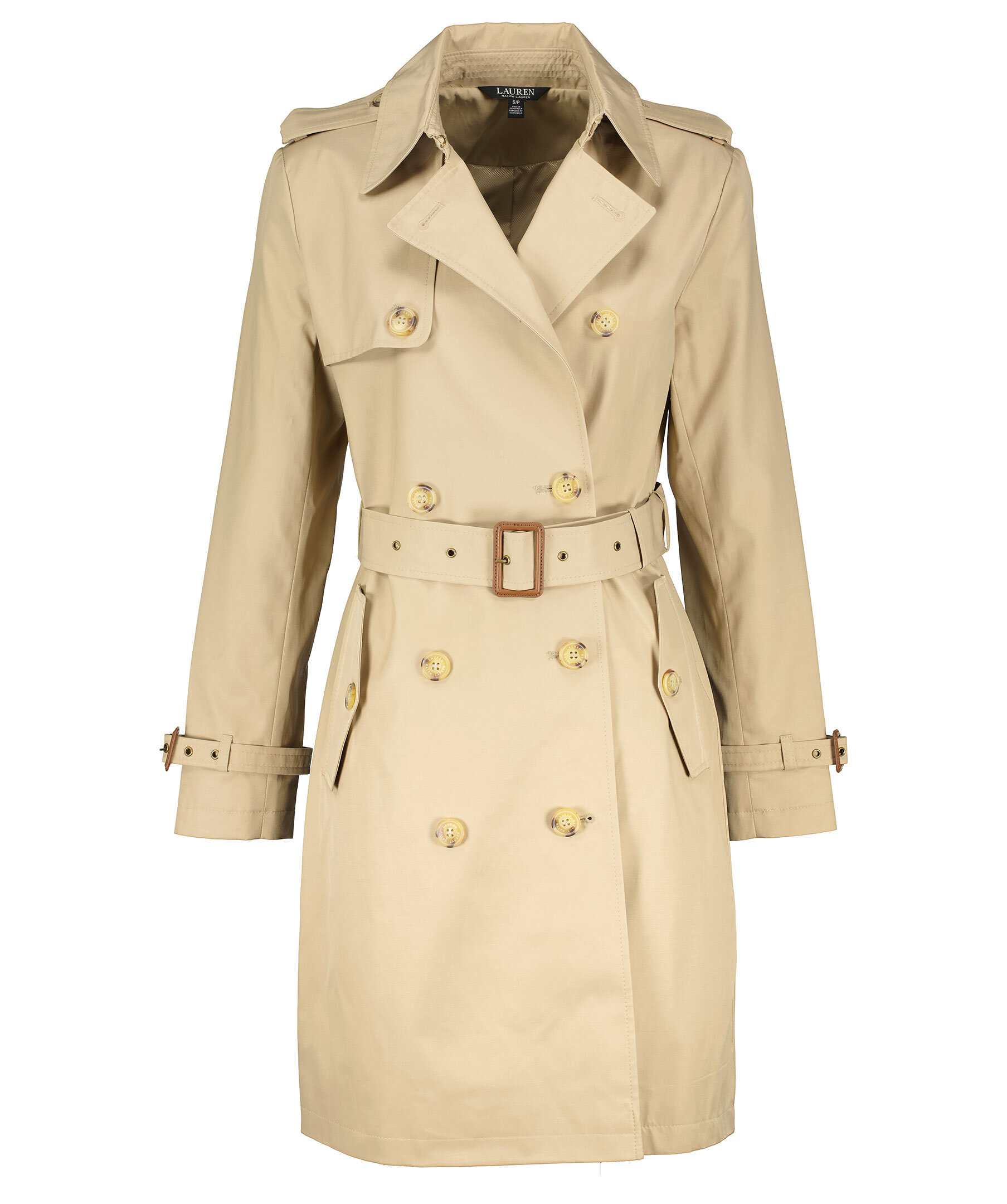 Beige trenchcoat i en lätt figursydd modell från Lauren Ralph Lauren. Spetsig krage och dubbel knäppning med sköldpaddsmönstrade knappar. Spänne med knapp på båda axlarna, justerbart, avtagbart bälte i midjan och spänne i ärmslut med knapp. Öppna framfickor i sidorna och slutar strax innan knät. I storlek M har trenchcoaten måttet 99cm från axeln till jackslut.