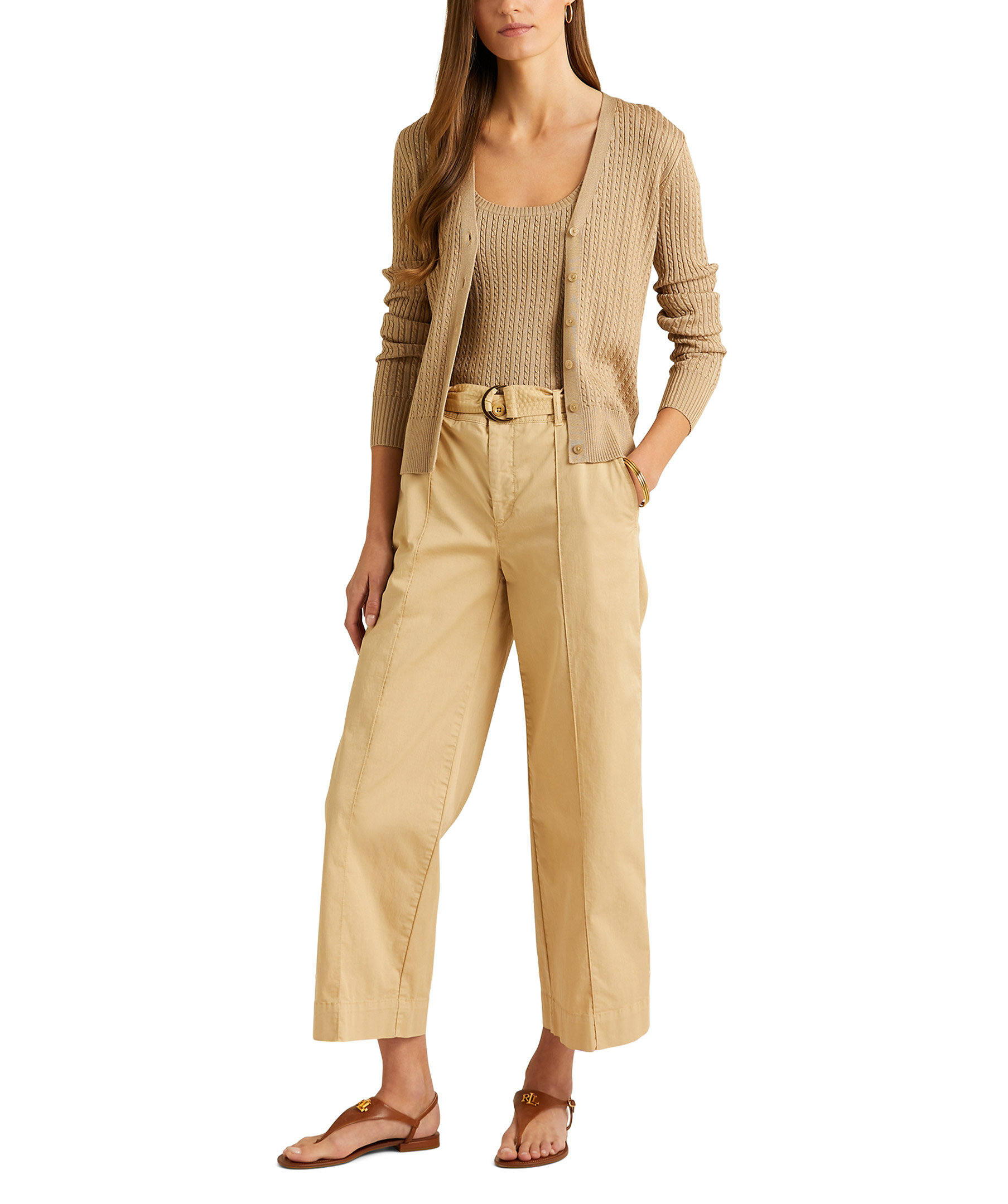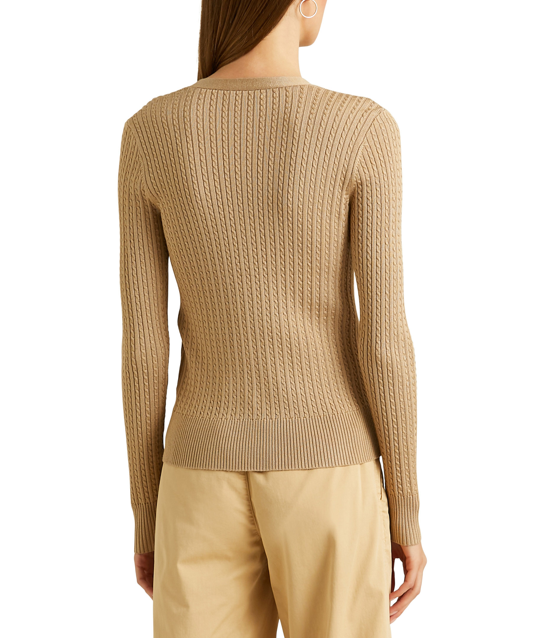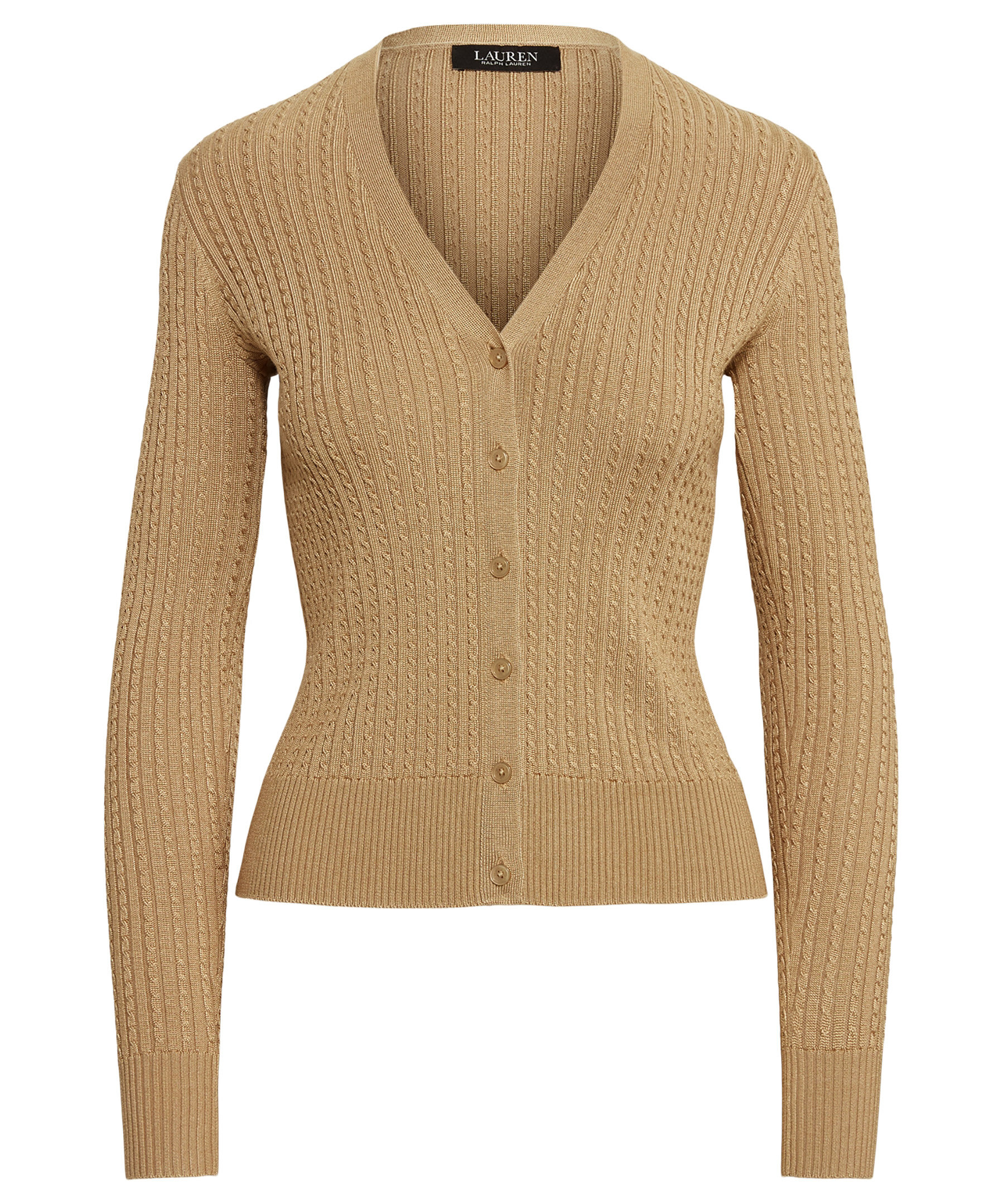 Beige, kabelstickad cardigan med v-ringning från Polo Ralph Lauren. Tillverkad i en viskosblandning. Ribbstickade muddar i halsringning, ärmslut och plaggslut samt beigea knappar fram.
