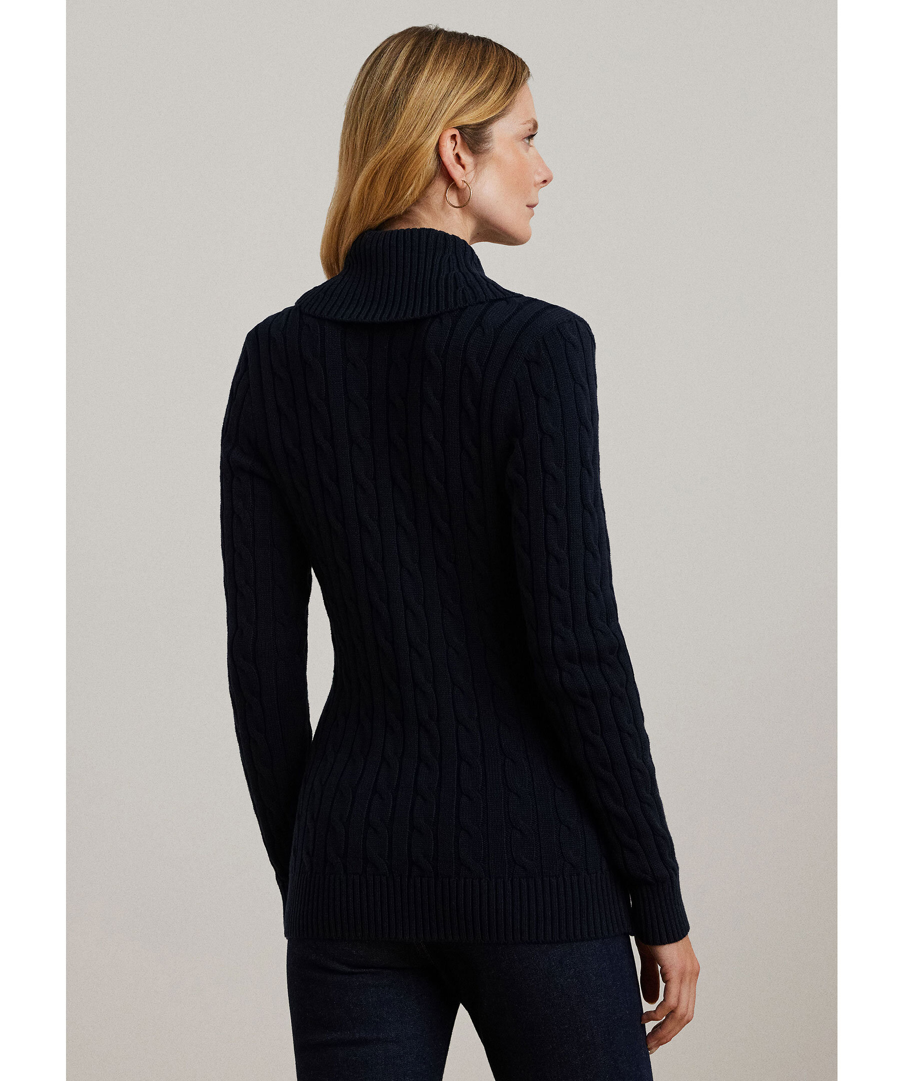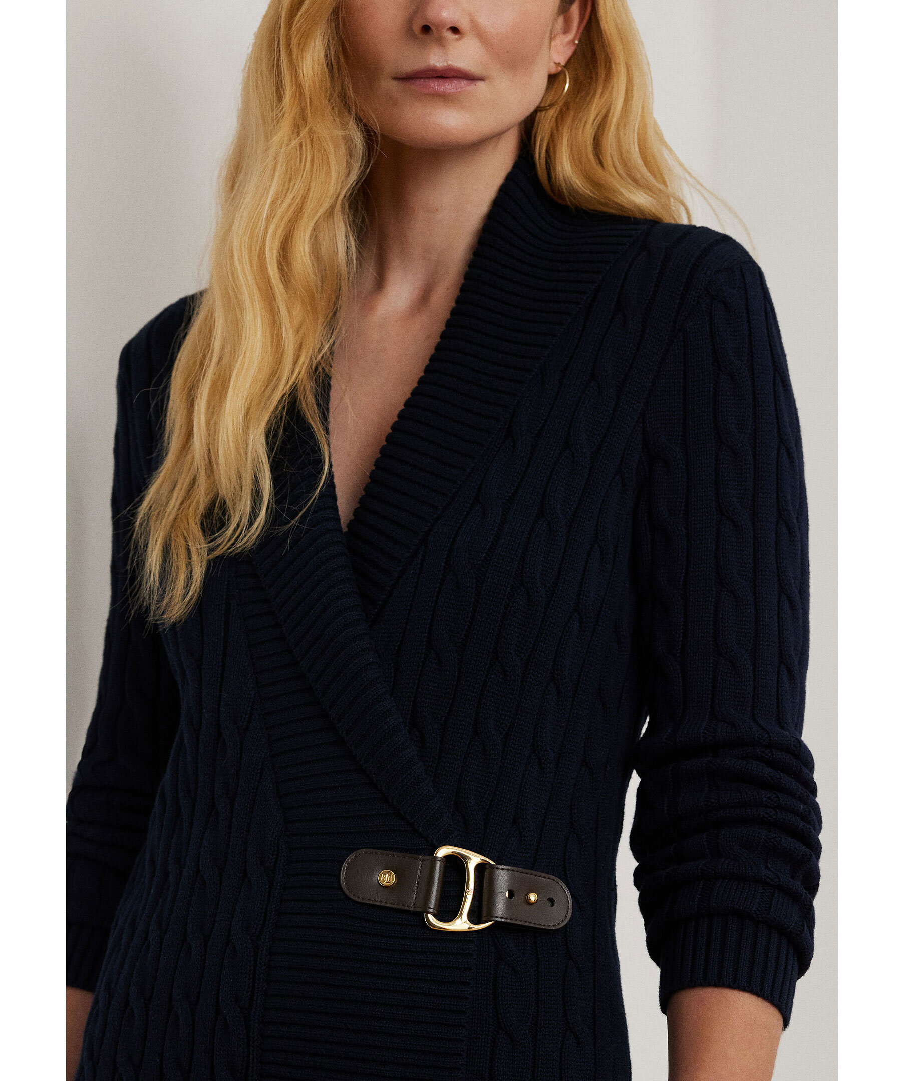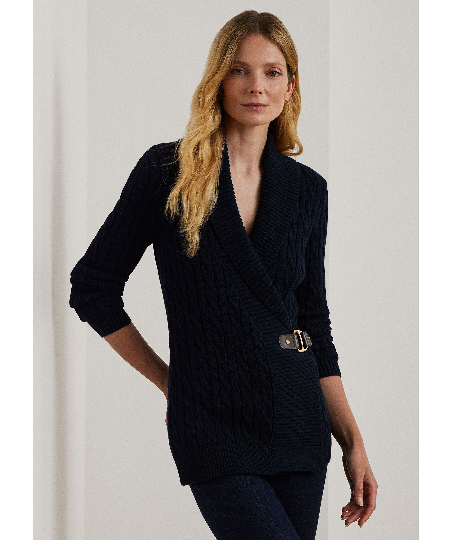 Mörkblå kabelstickad cardigan från Lauren Ralph Lauren. Gjord i mjuk bomull och har en avslappnad passform och slutar vid höften. Ribbstickad krage och mudd vid ärm och plaggslut. Bältspänne vid plaggets mitt.