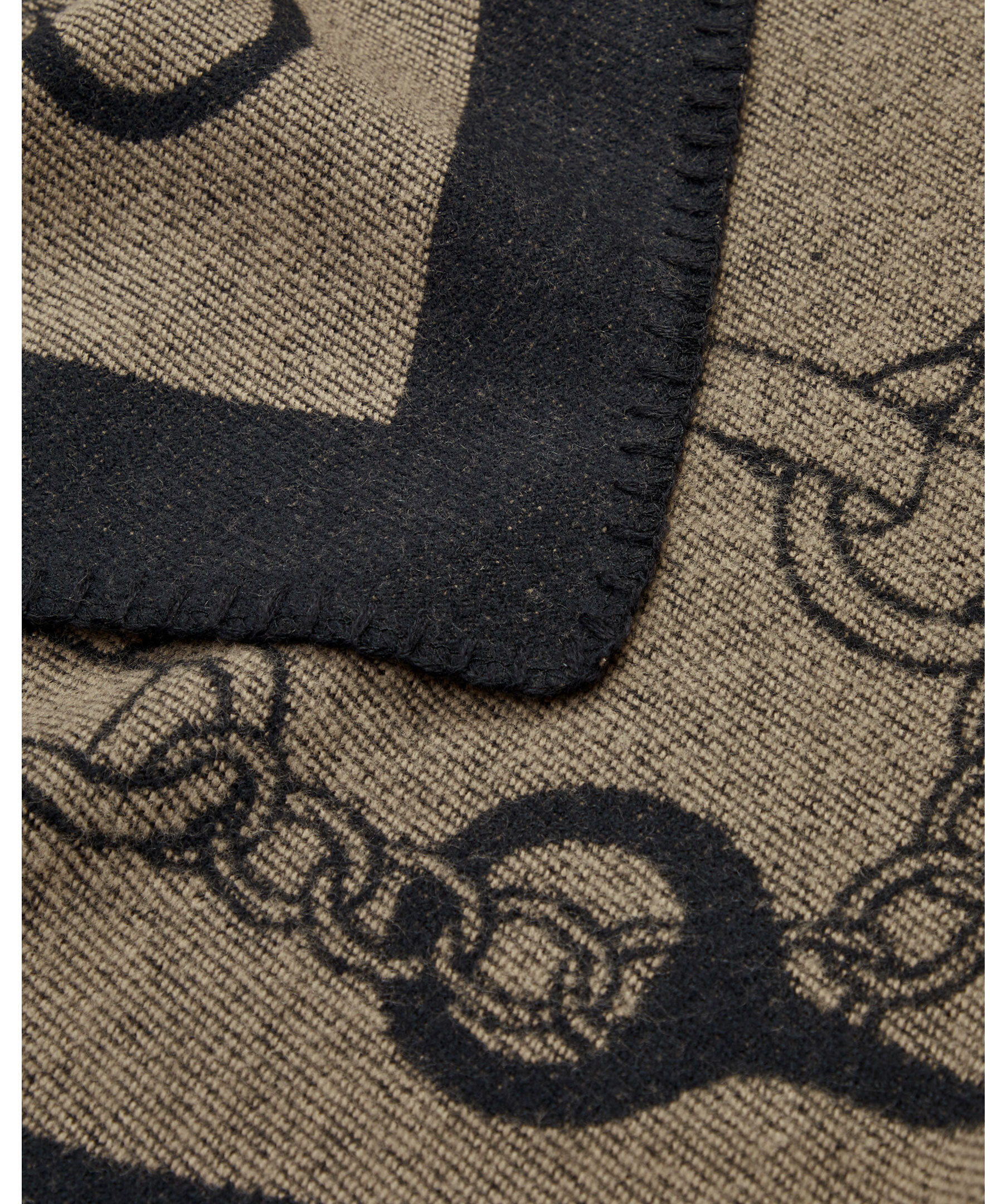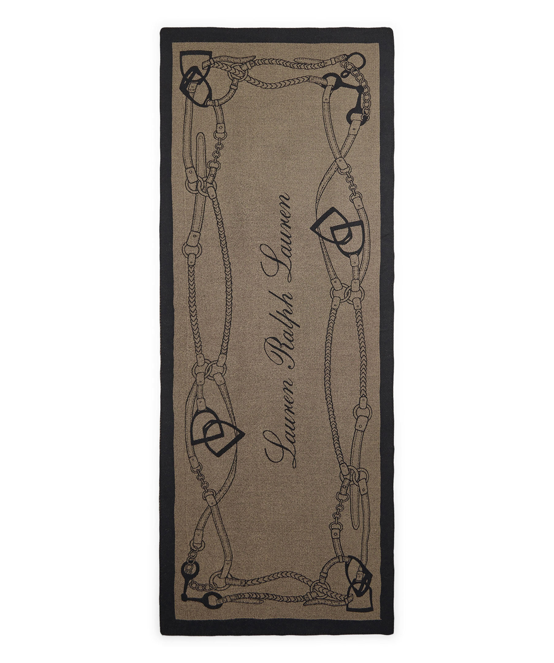Svart och beige mönstrad halsduk från Lauren Ralph Lauren. Finstickad med ett instickat ryttarinspirerat jacquardmotiv och "LRL" jacquardlogga i mitten samt filtsydda ändar. Mått: 210 x 80 cm.