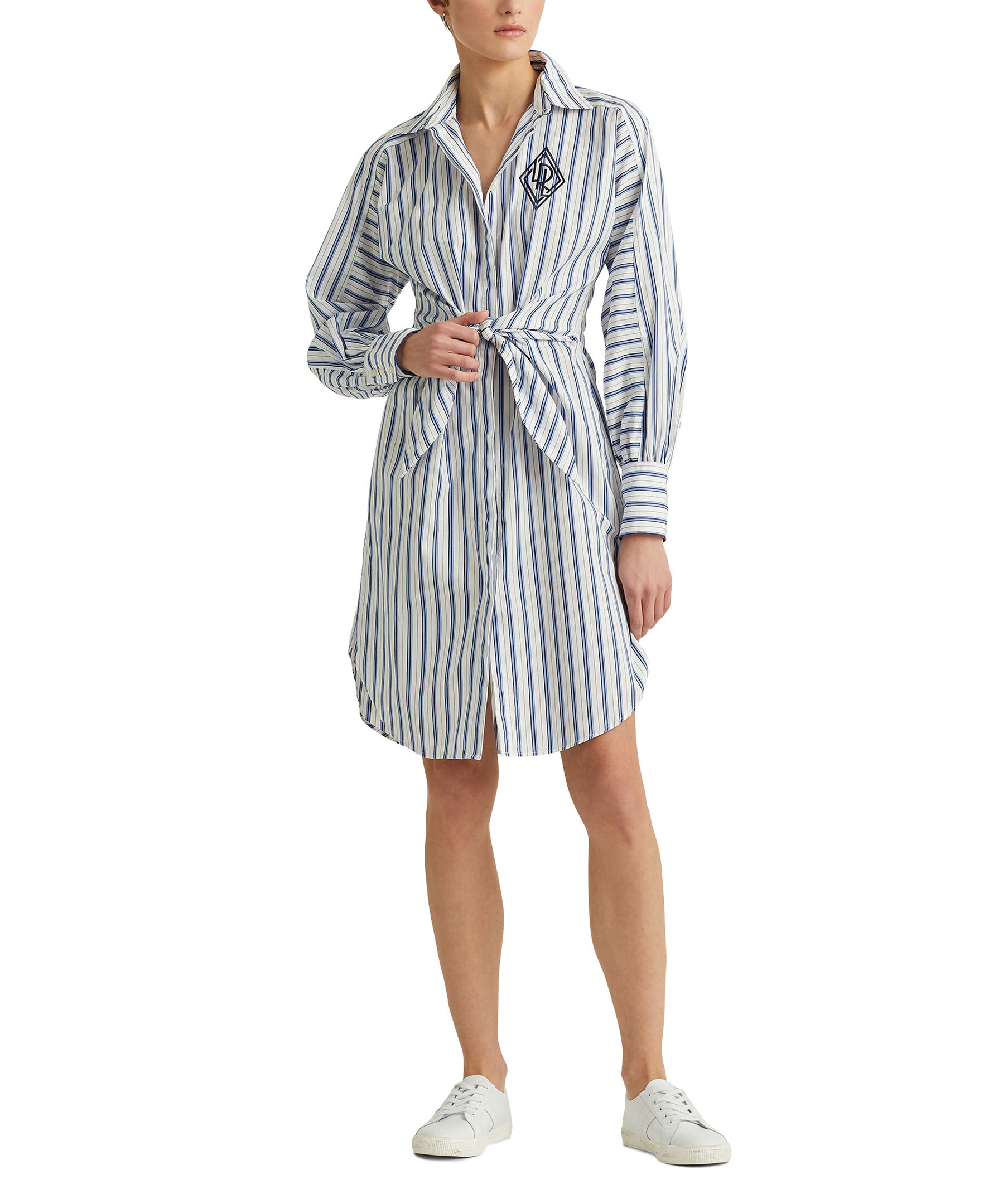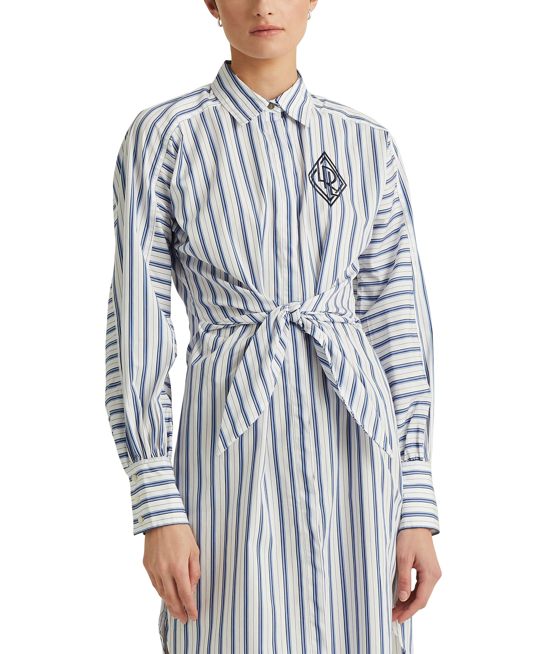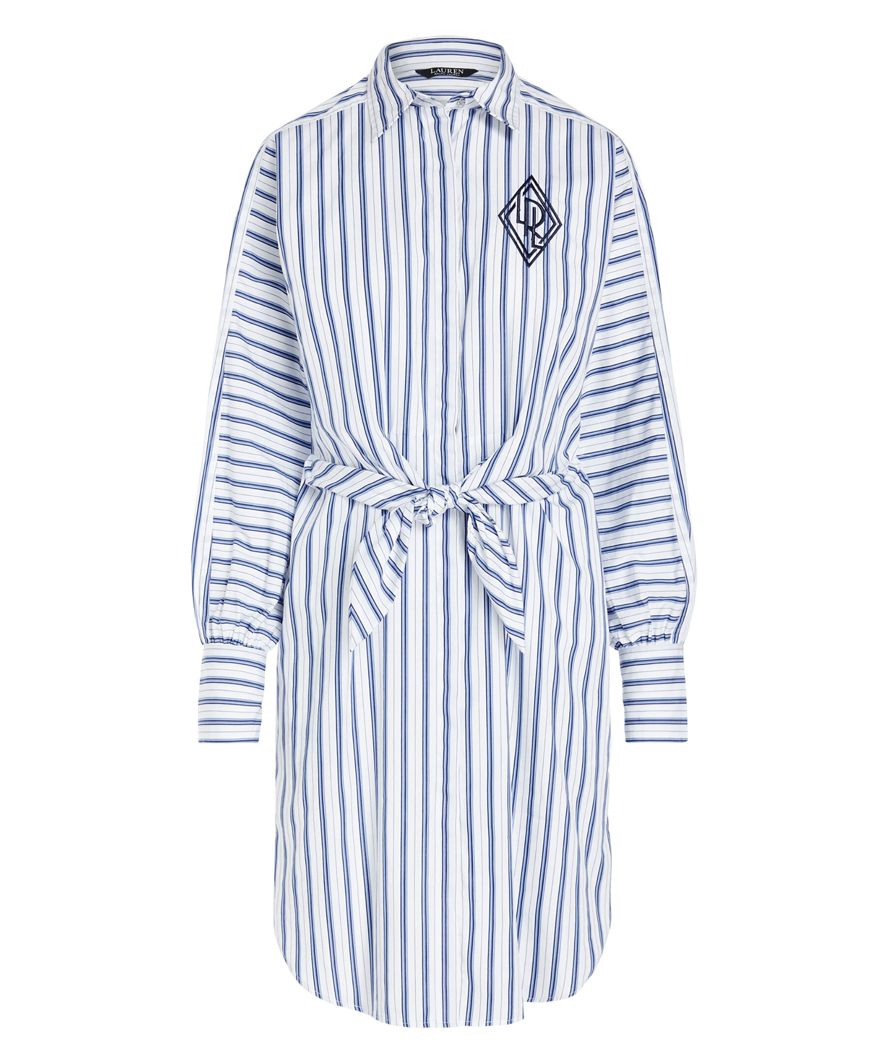 Randig skjortklänning från Lauren Ralph Lauren i vitt och blått. Stängs framtill med dolda knappar. Långa ärmar med manschett och knapp i ärmslut och spetsig krage. Bälte i tyg i midjan som knyts fram och stor, broderad logotyp på vänster sida på bröstet. Tillverkad i bomull.