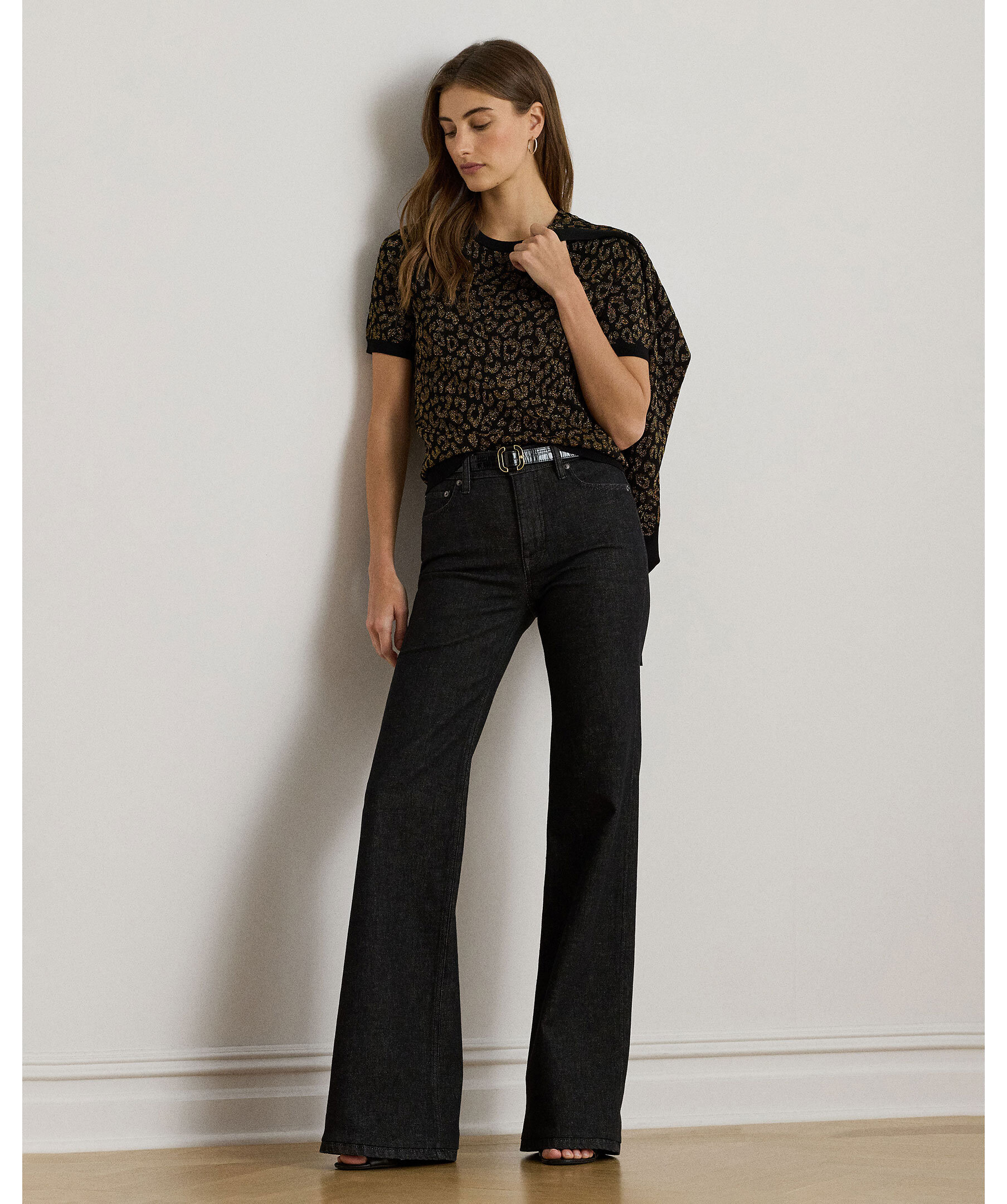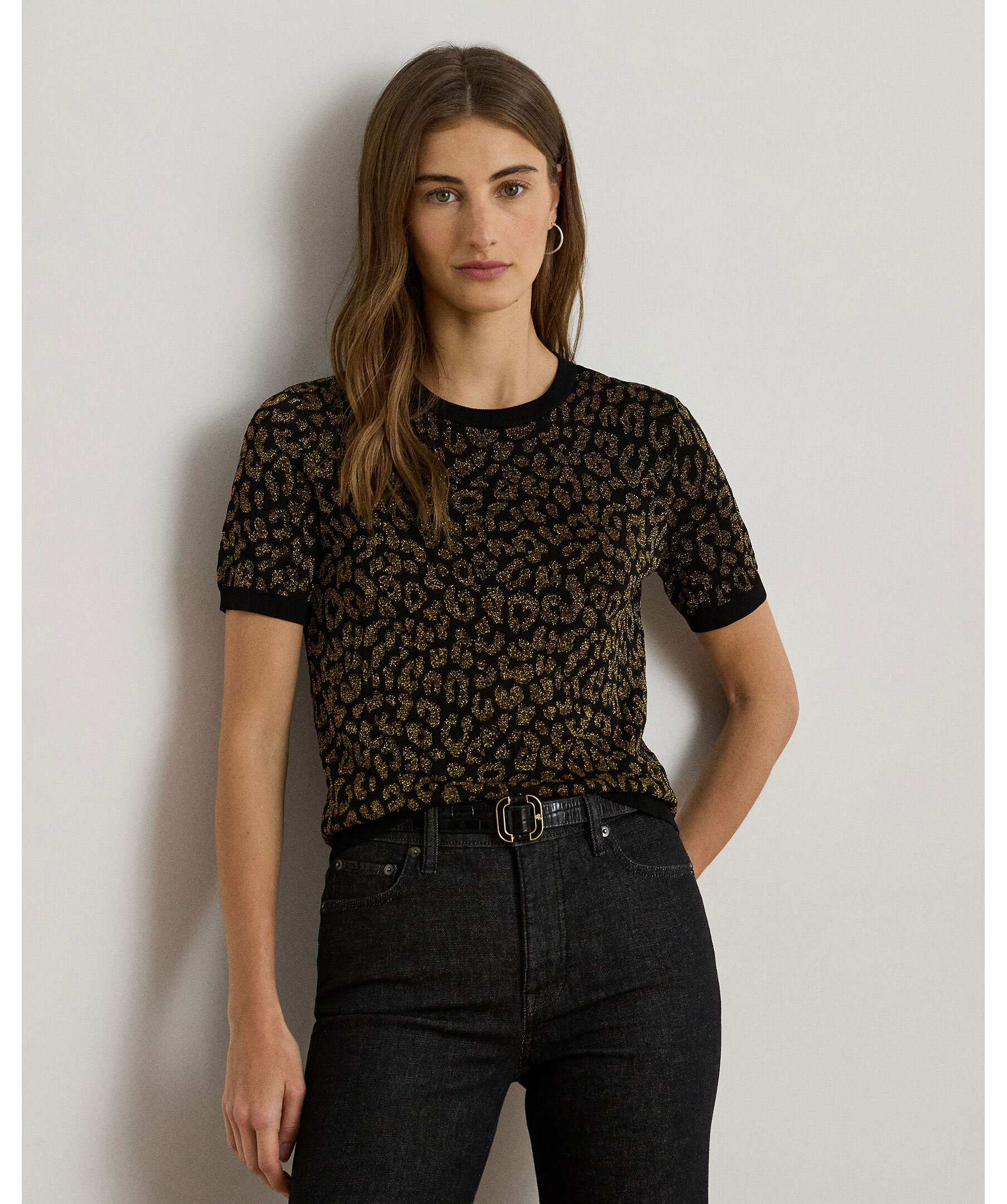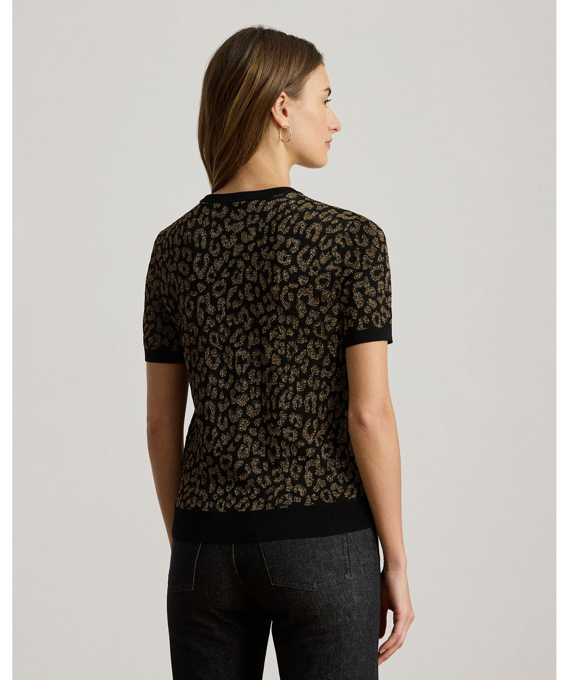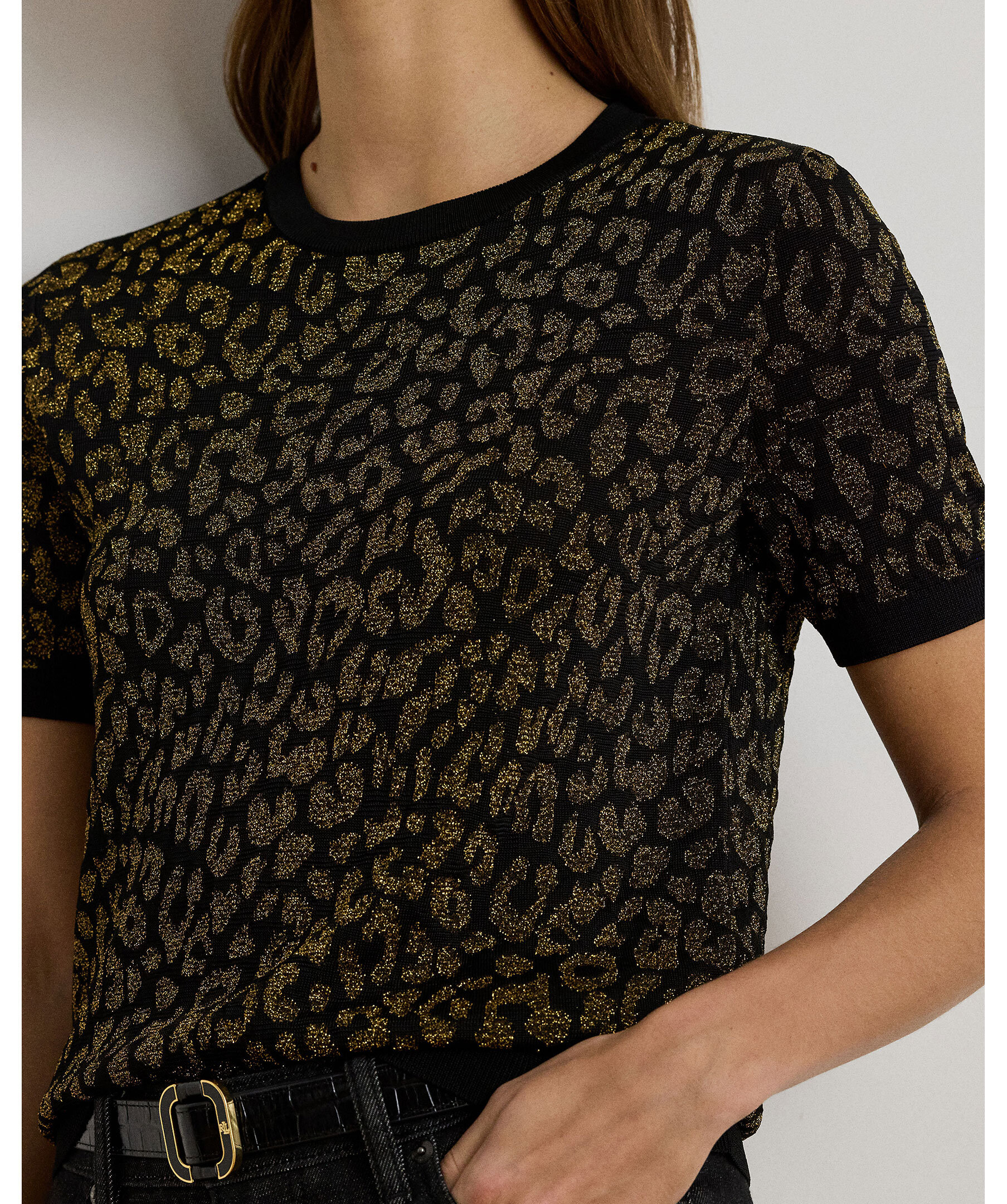 En elegant kortärmad tröja i svart med skimrande “ocelot”-mönster i guldmetallisk ton från Lauren Ralph Lauren. Ribbstickad krage, ärmslut och nederkant ger en sofistikerad finish. Perfekt för att lyfta din outfit med en diskret, glamorös detalj.