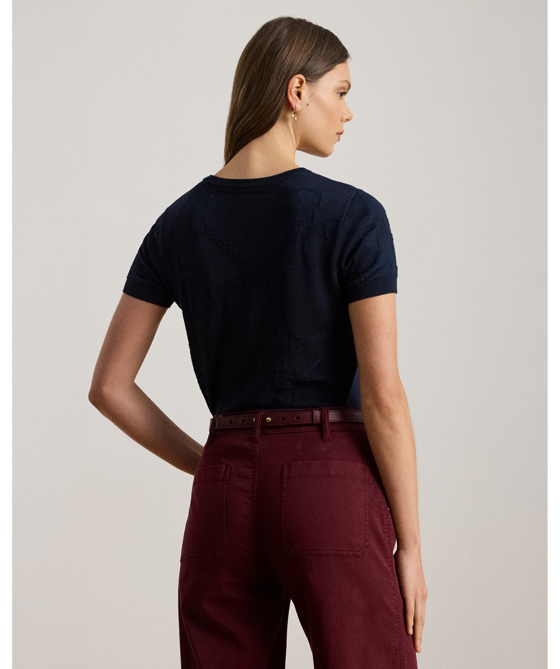 Blå kortärmad jumper från Ralph Lauren i en mjuk bomullsblandning med ett subtilt belting-motiv i texturen -en stilfull detalj som hyllar märkets klassiska och ridinspirerade estetik. Tröjan har en rund halsringning och en relaxed fit som faller bekvämt till höften, vilket gör den perfekt för vardags- och övergångslooks tillsammans med jeans, chinos eller kjol.