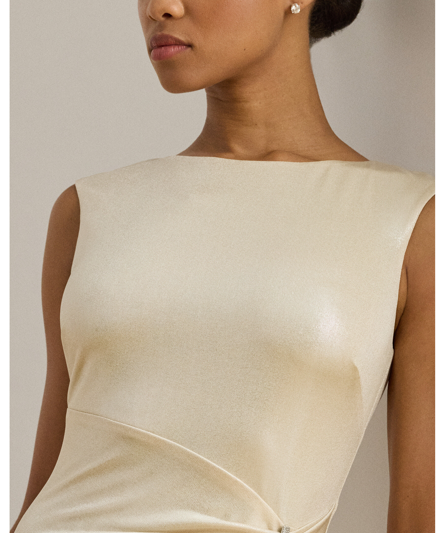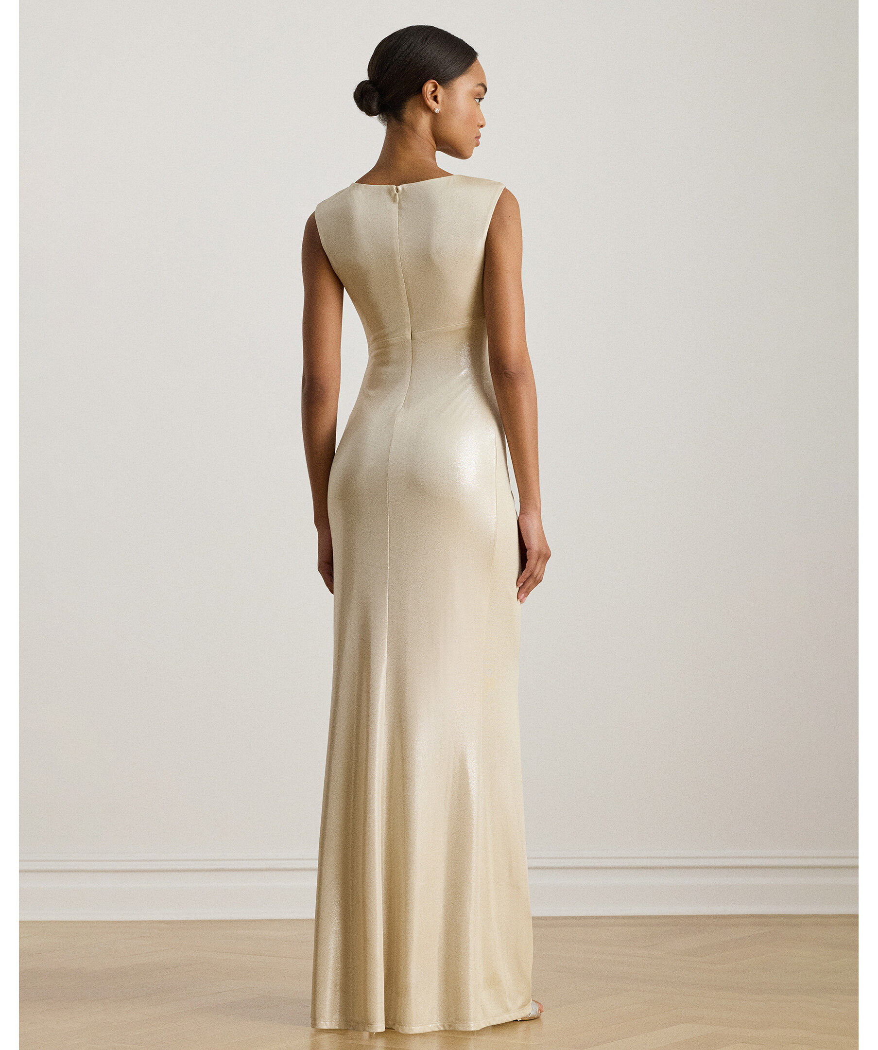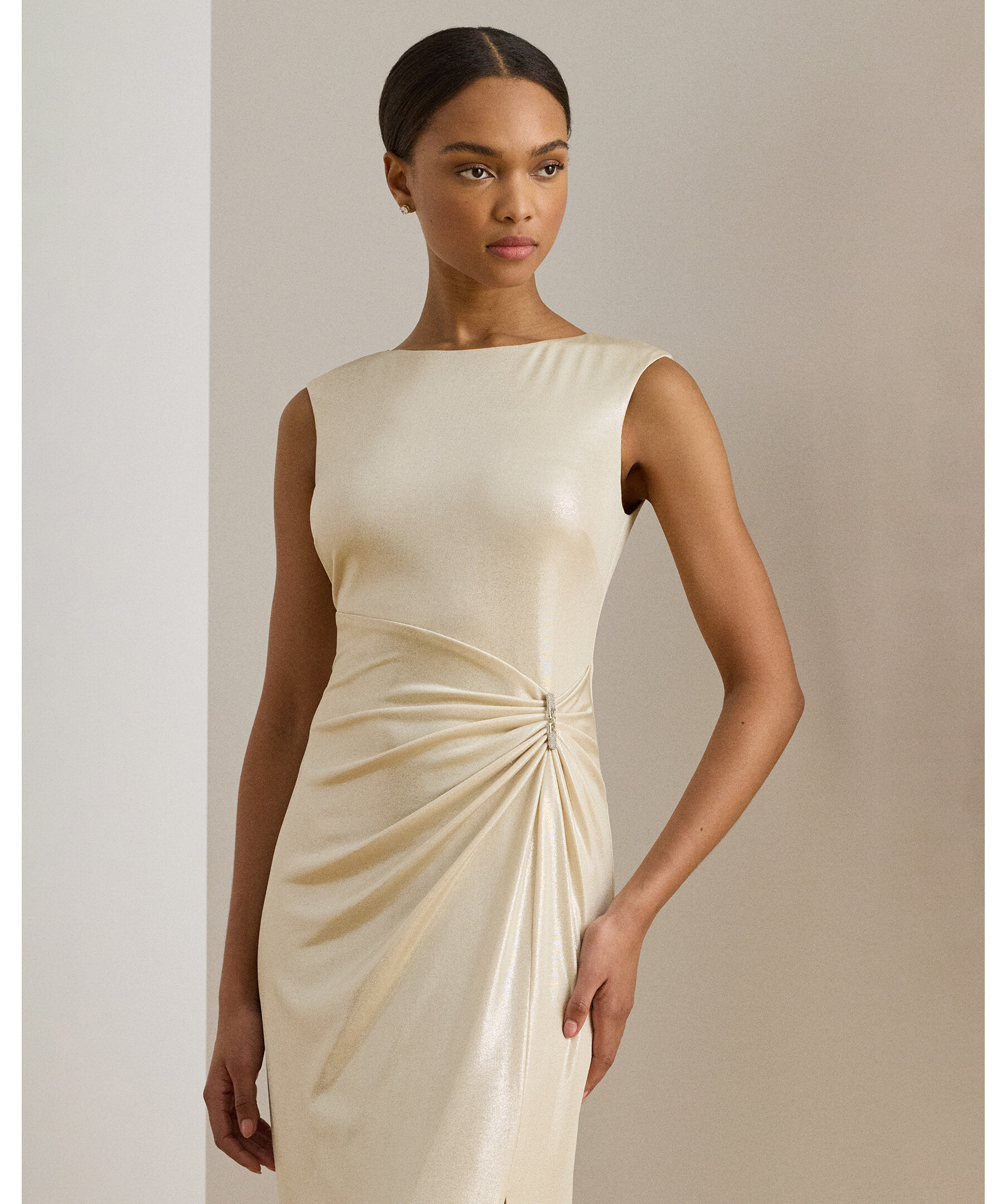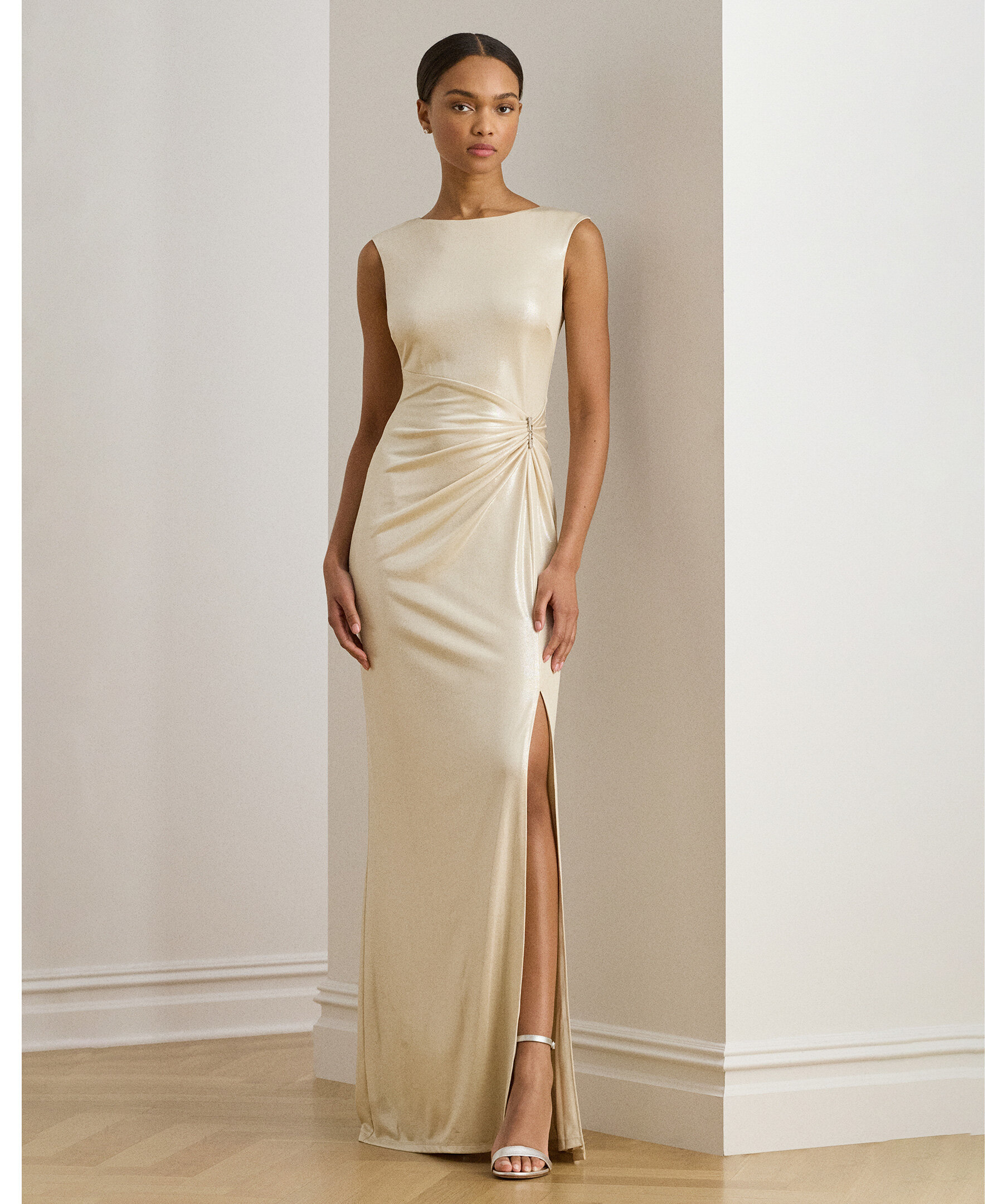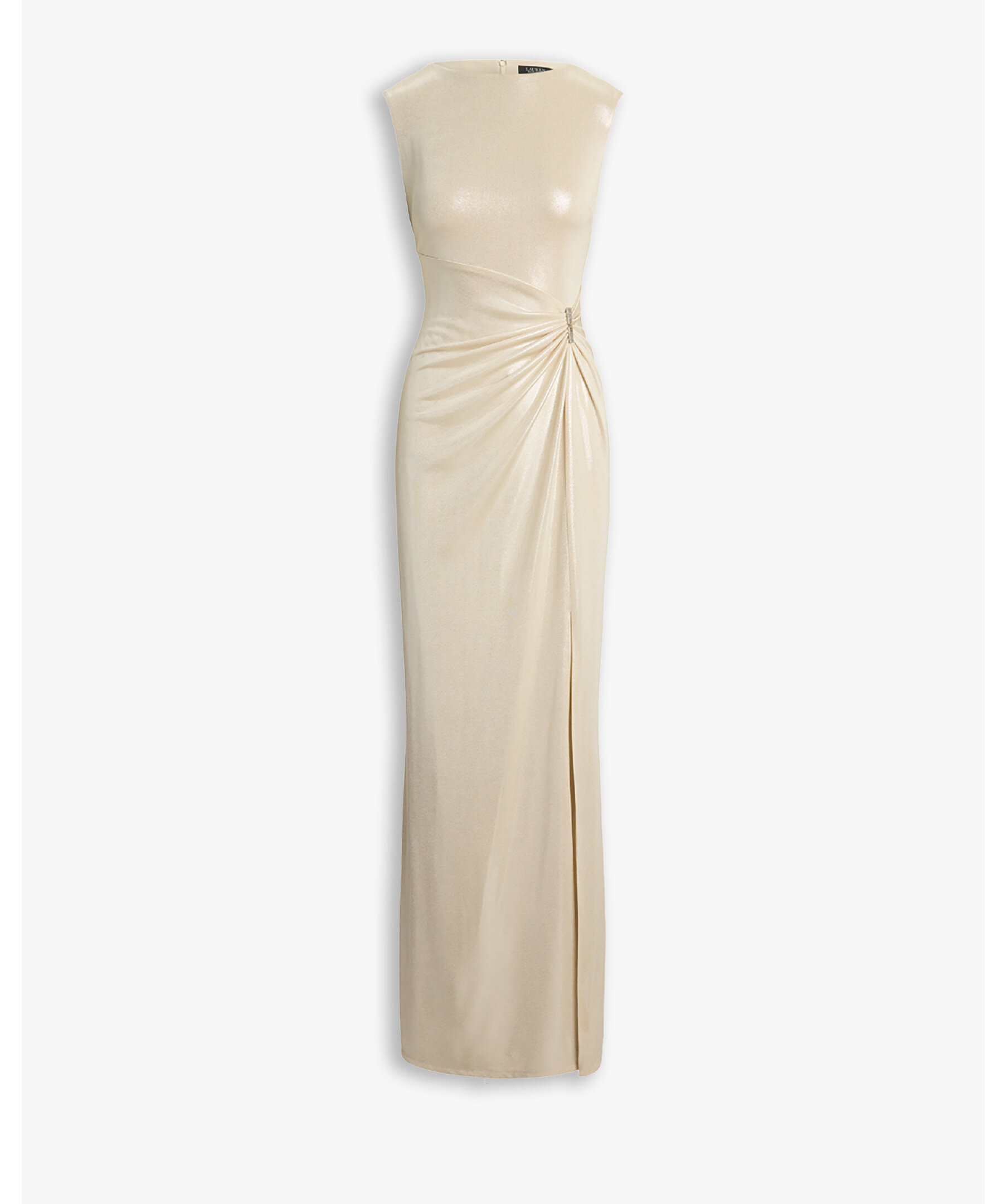 Elegant lång festklänning från Lauren Ralph Lauren i glittrande metallic‑jersey med detaljerade veck och en dekorativ spänne‑detalj i midjan som samlar tyget och ger en figurnära silhuett. Klänningen har slits i kjolen för lätt rörelse och en sofistikerad look perfekt för gala, fest eller kvällsevenemang