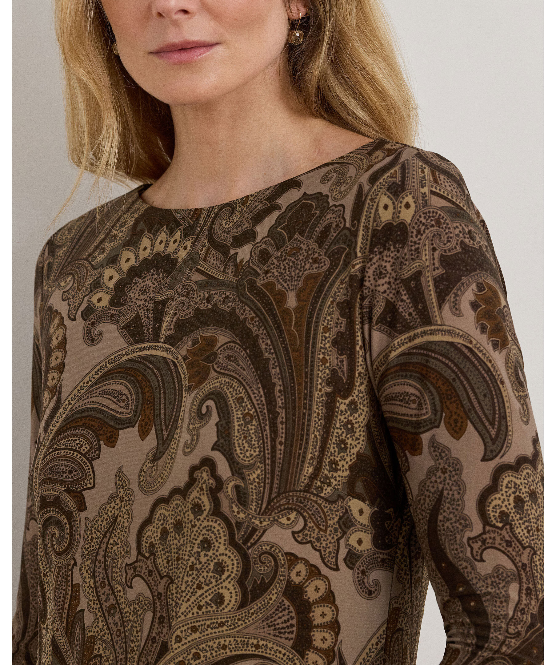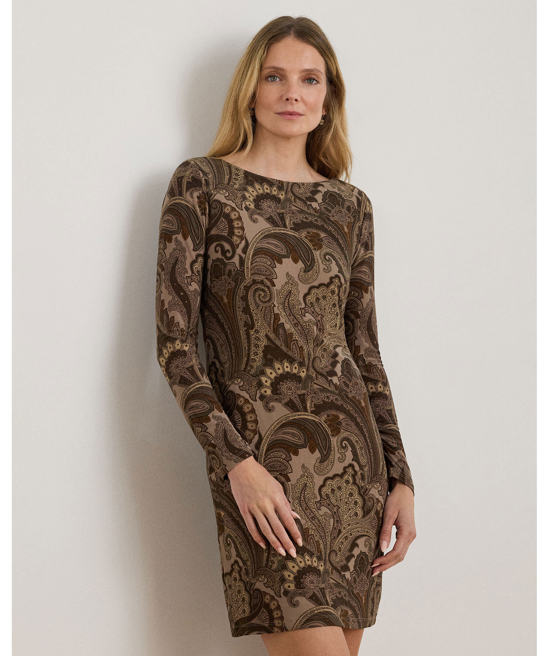Brun, kort bodycon klänning med paisleymönster från Lauren Ralph Lauren. Klänningen har långa ärmar och är tänkt att sluta mitt på låret.
