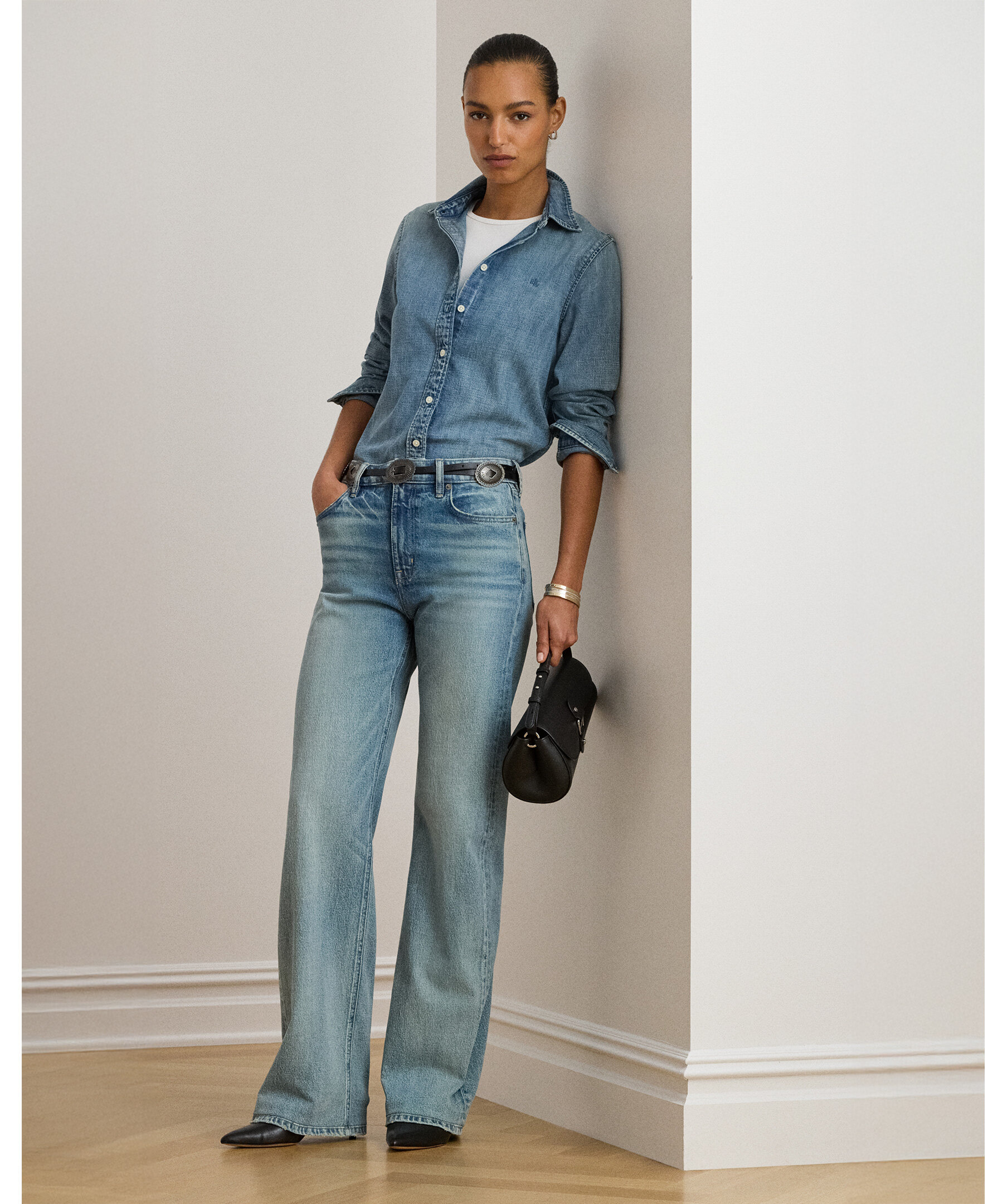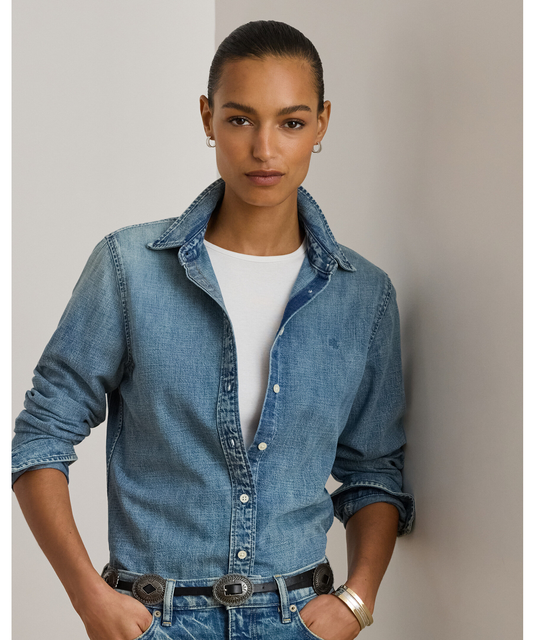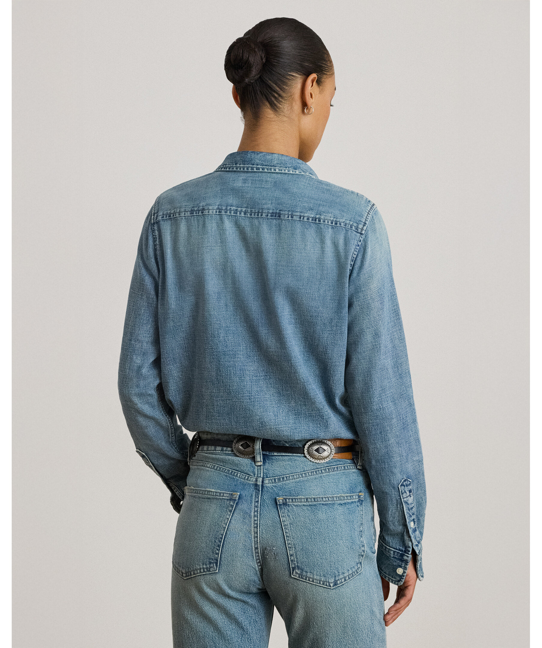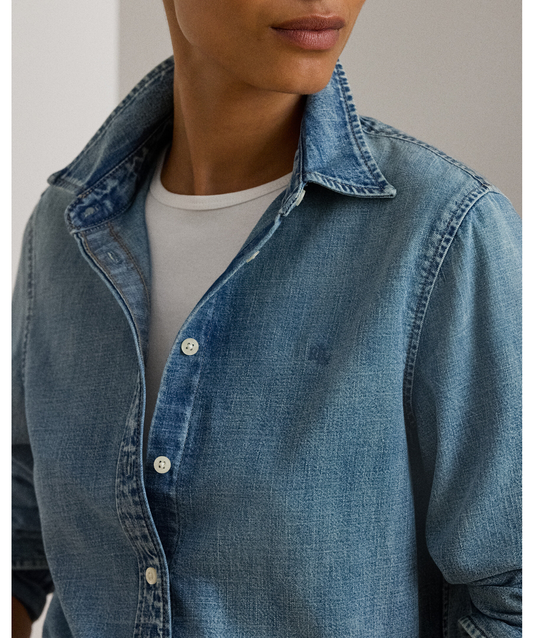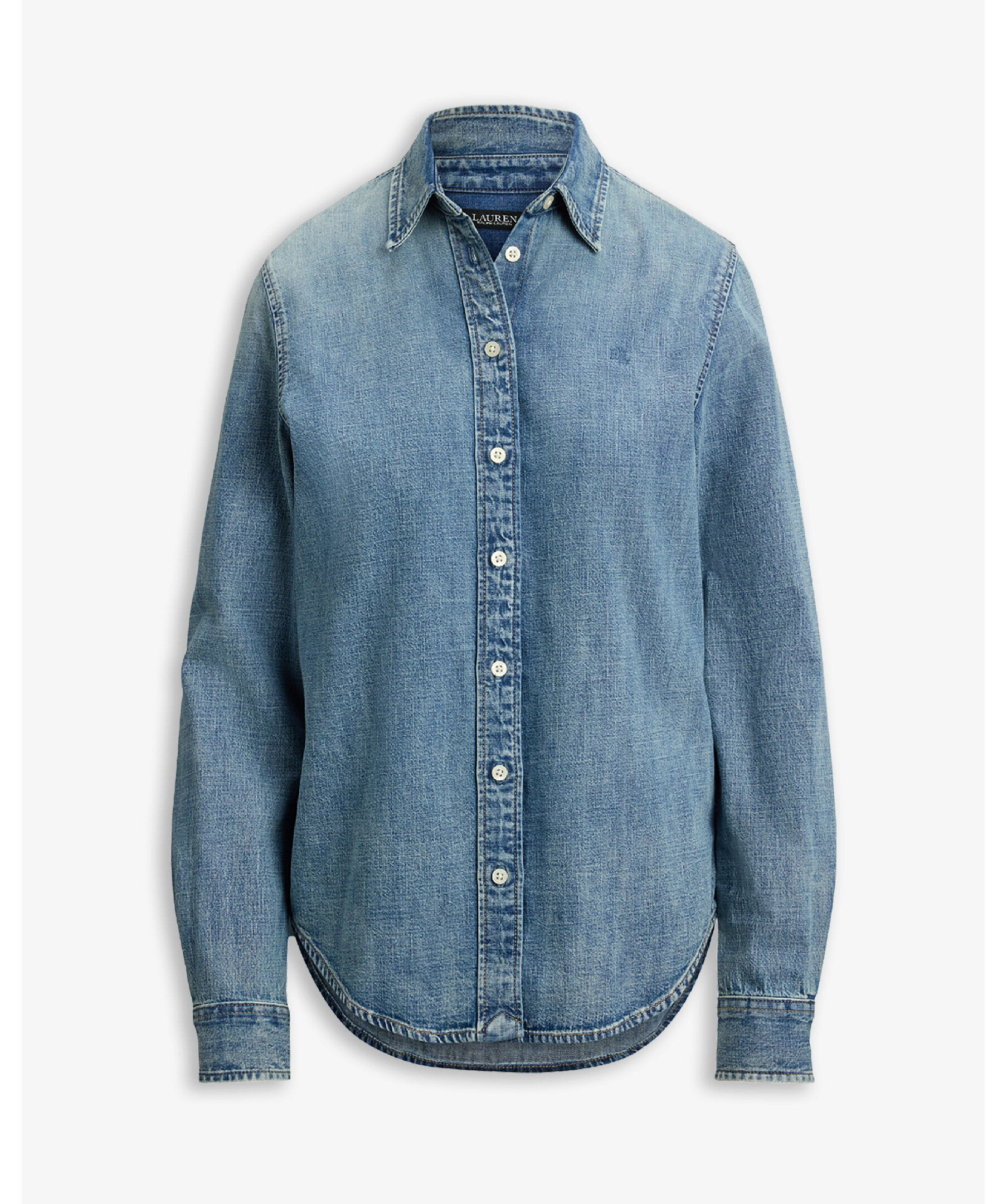 Ljusblå denimskjorta från Lauren Ralph Lauren i klassisk classic fit som faller bekvämt till höften. Den har en rak silhuett med knäppning fram, klassisk skjortkrage, långa ärmar med knäppta manschetter och en subtil LRL‑broderad logga på bröstet för ett diskret, elegant Ralph Lauren‑uttryck.