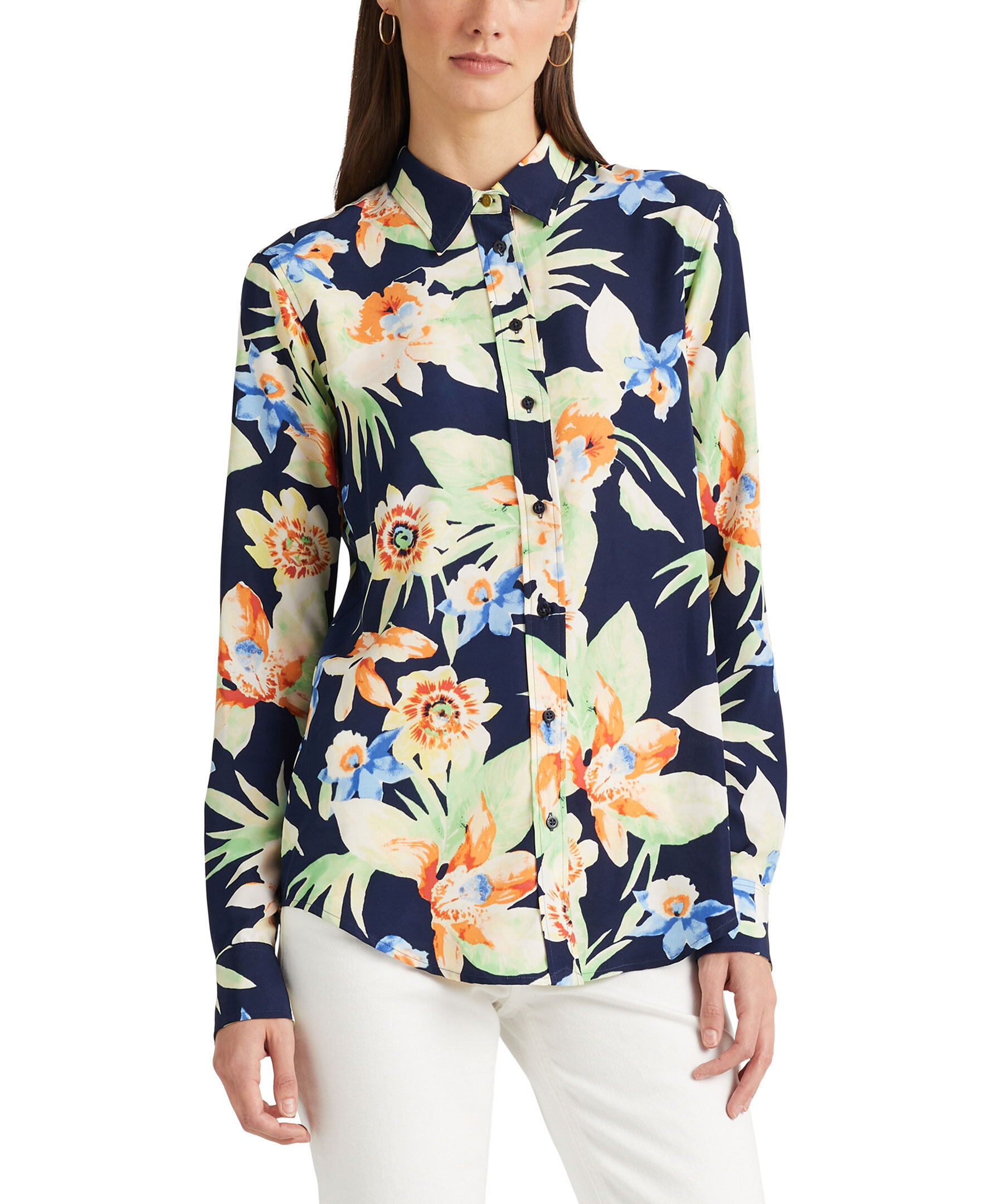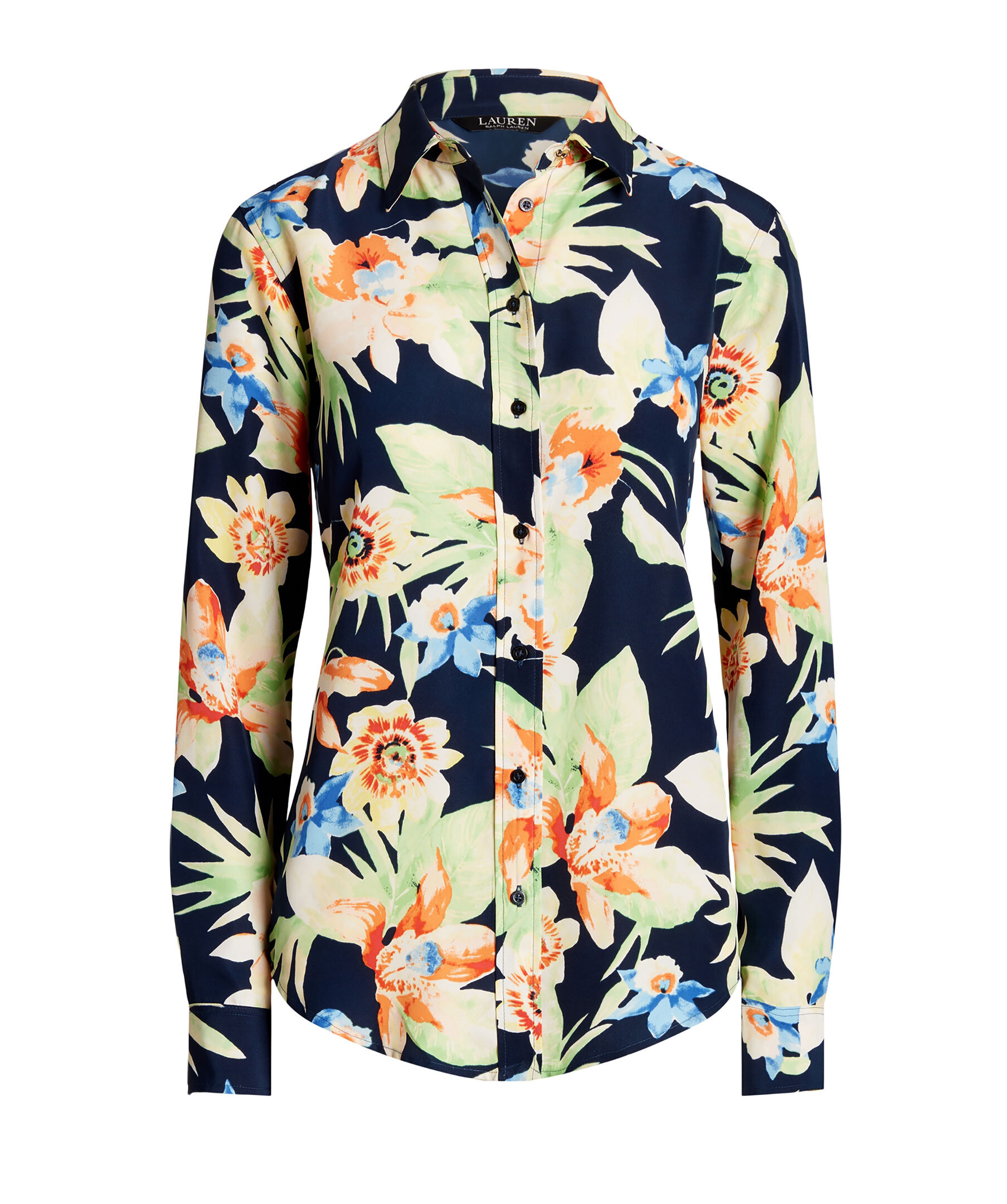 Mörkblå, multifärgad mönstrad skjorta från Lauren Ralph Lauren. Spetsig krage och enkla manschetter vid ärmslut med guldfärgade knappar med monogram.