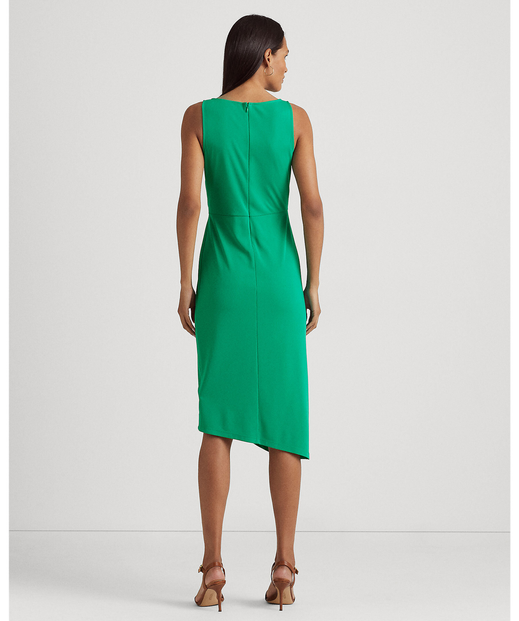 Grön klänning från Lauren Ralph Lauren. Båtringning. Dekorativ knut framtill på klänningen. Snedskuren kjol med omlottmodell. Dragkedja i ryggen.