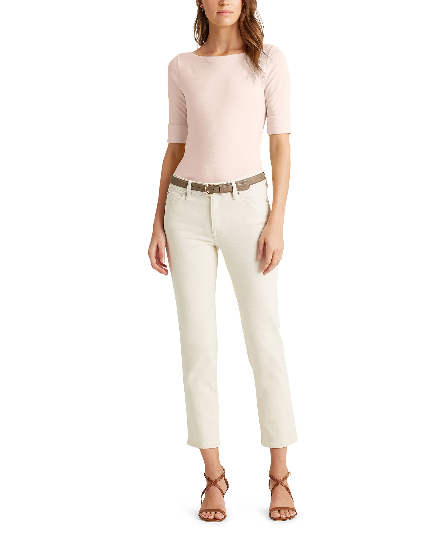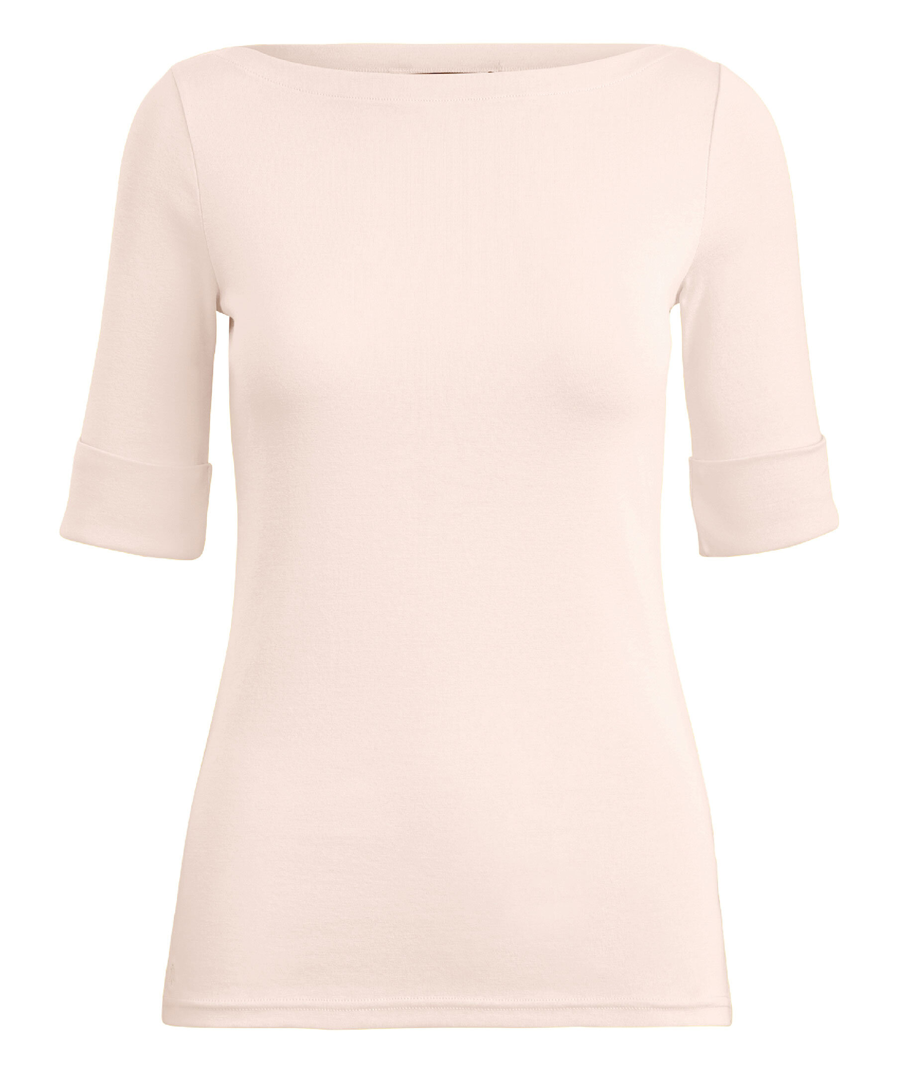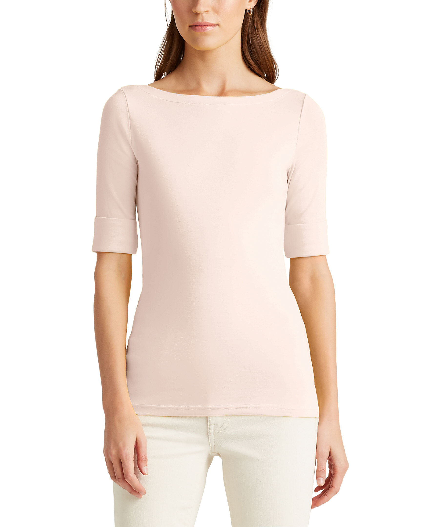Ljusrosa topp i smal passform från Lauren Ralph Lauren. Tillverkad i stretchig bomull. Halvlånga ärmar, båthalsringning och slitsar i sidorna.