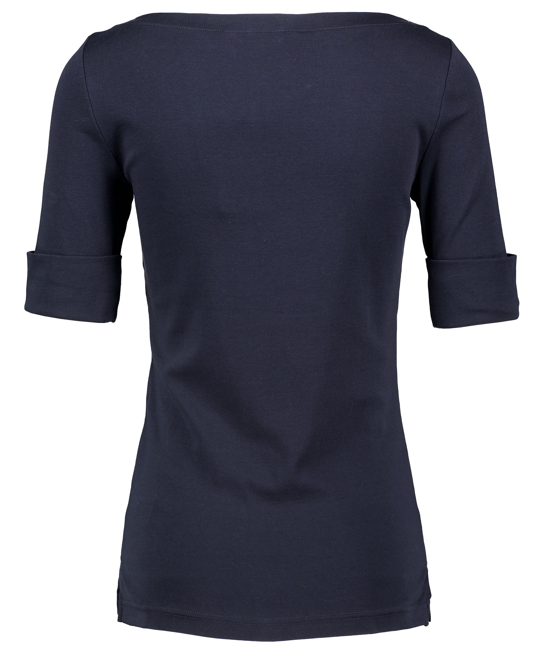 Marinblå topp från Lauren Ralph Lauren. Tillverkad i bomullsmix. Halvlånga ärmar, båtringning.