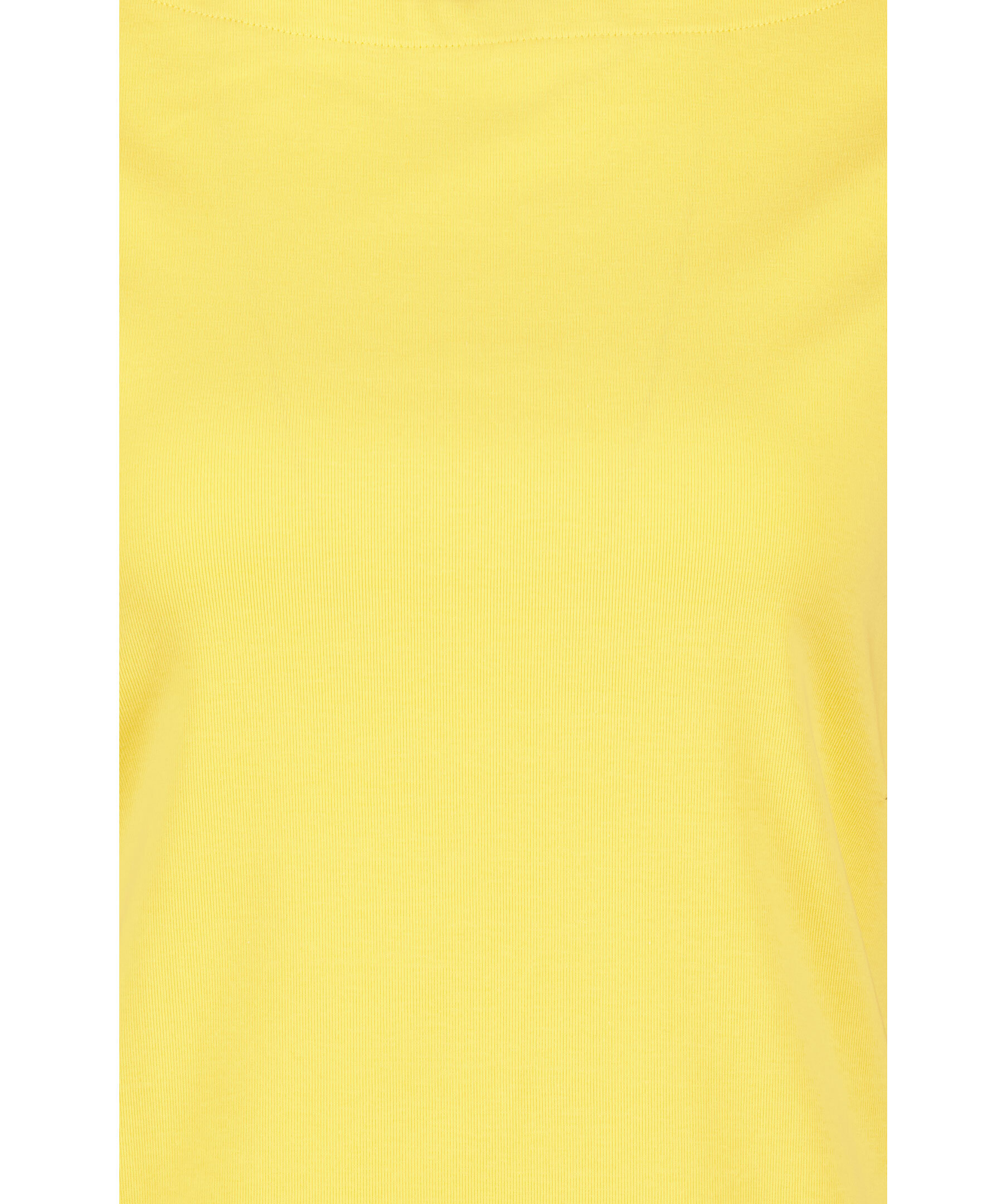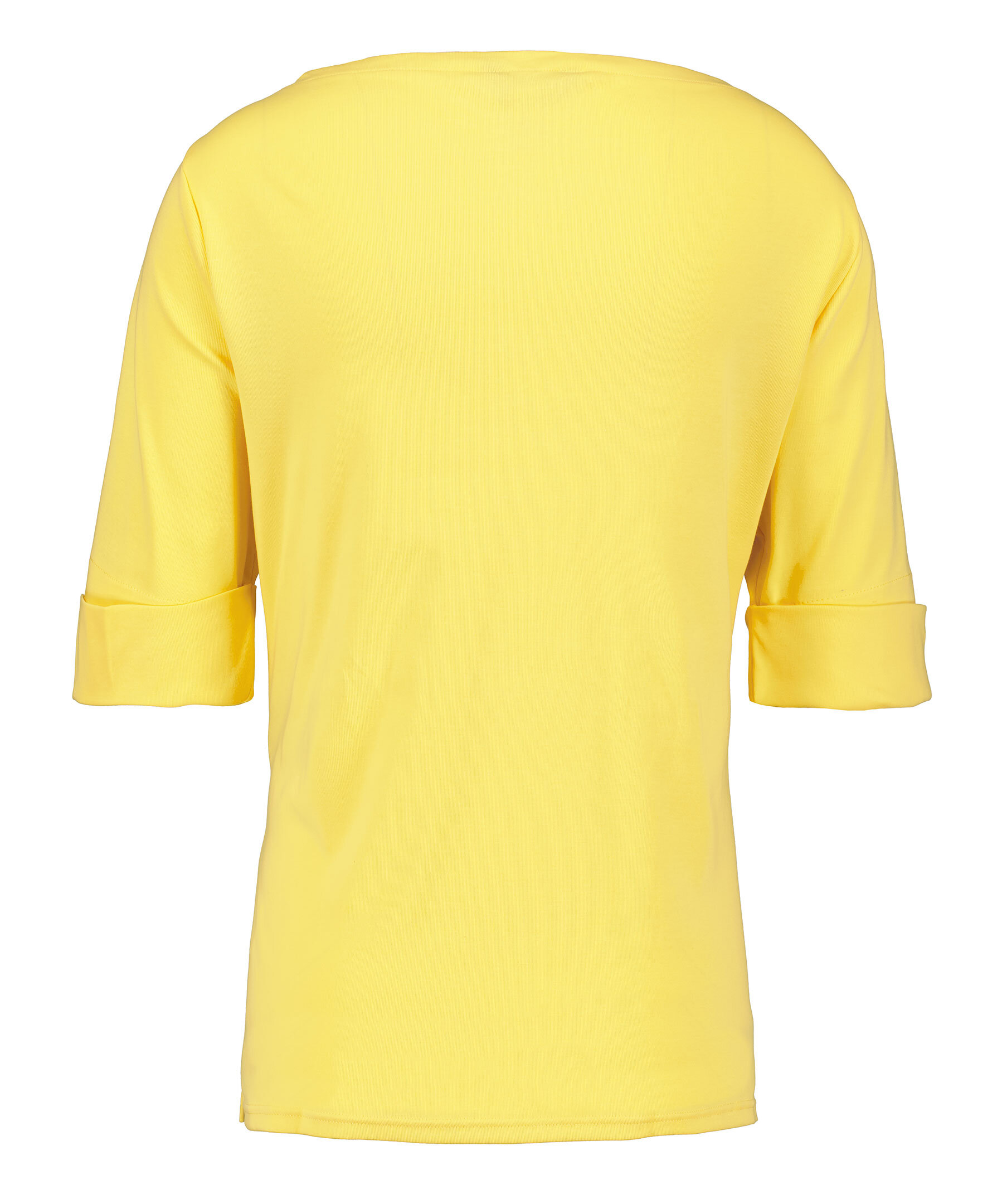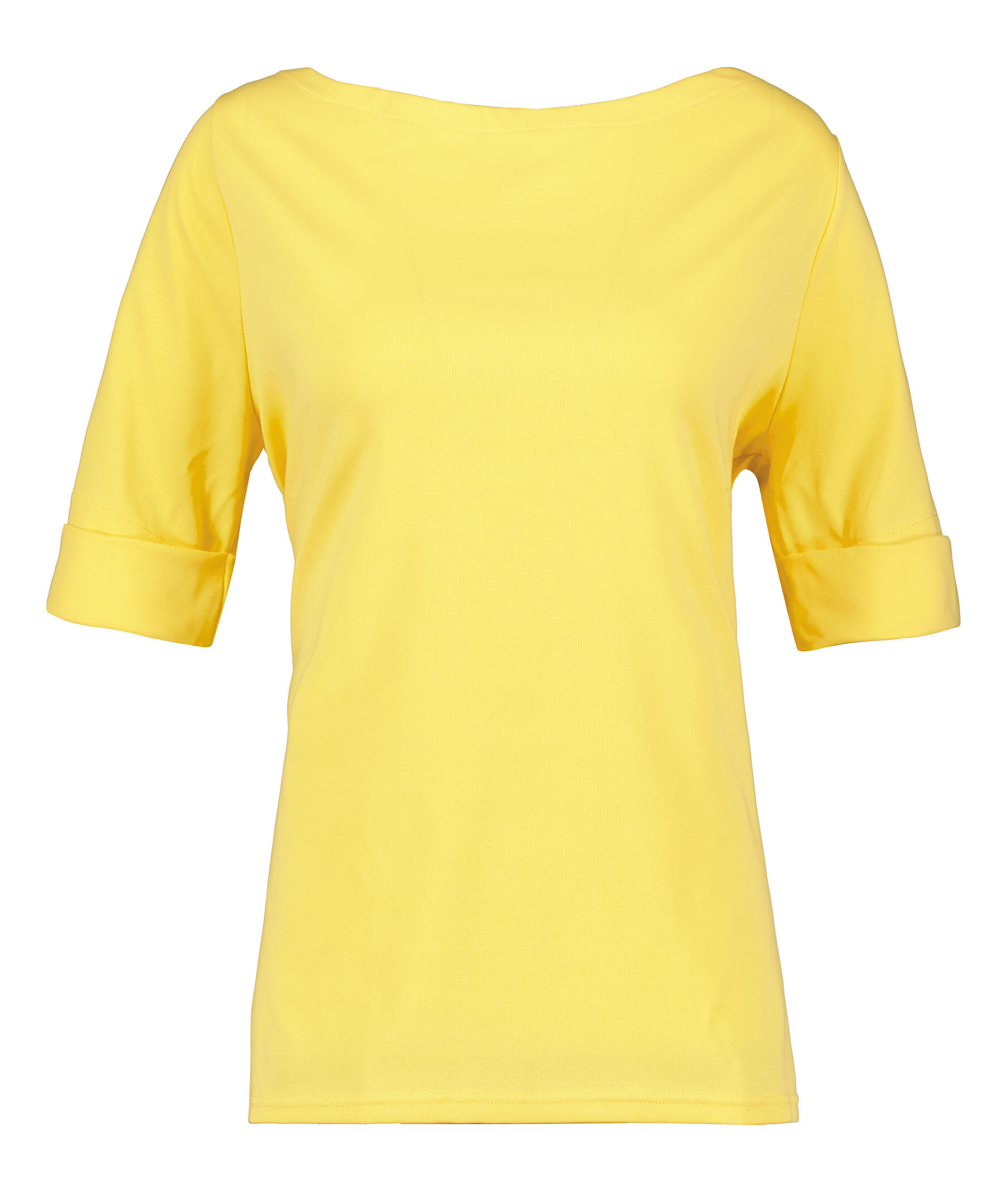 Gul tröja från Lauren Ralph Lauren. Båtringning. Korta slitsar i sidorna. Tillverkad i Bomullsblandning. Trekvartsärmar med uppvikt kant. Diskret broderad logotyp vid plaggslut på höger sida.