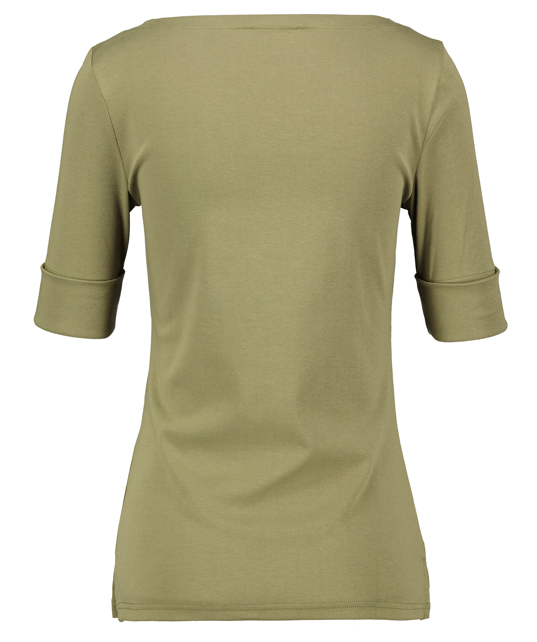 Militärgrön tröja med ärmar som slutar strax över armbågen. Figurnära passform. Båtringad halsringning. Korta slitsar nedtill. Tillverkad i bomullsblandning.