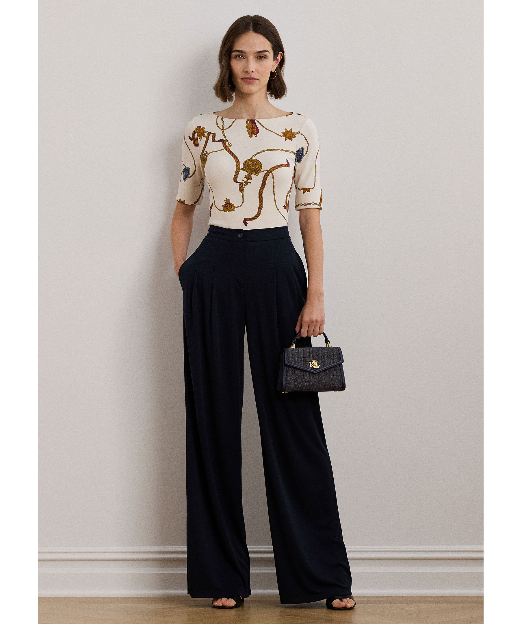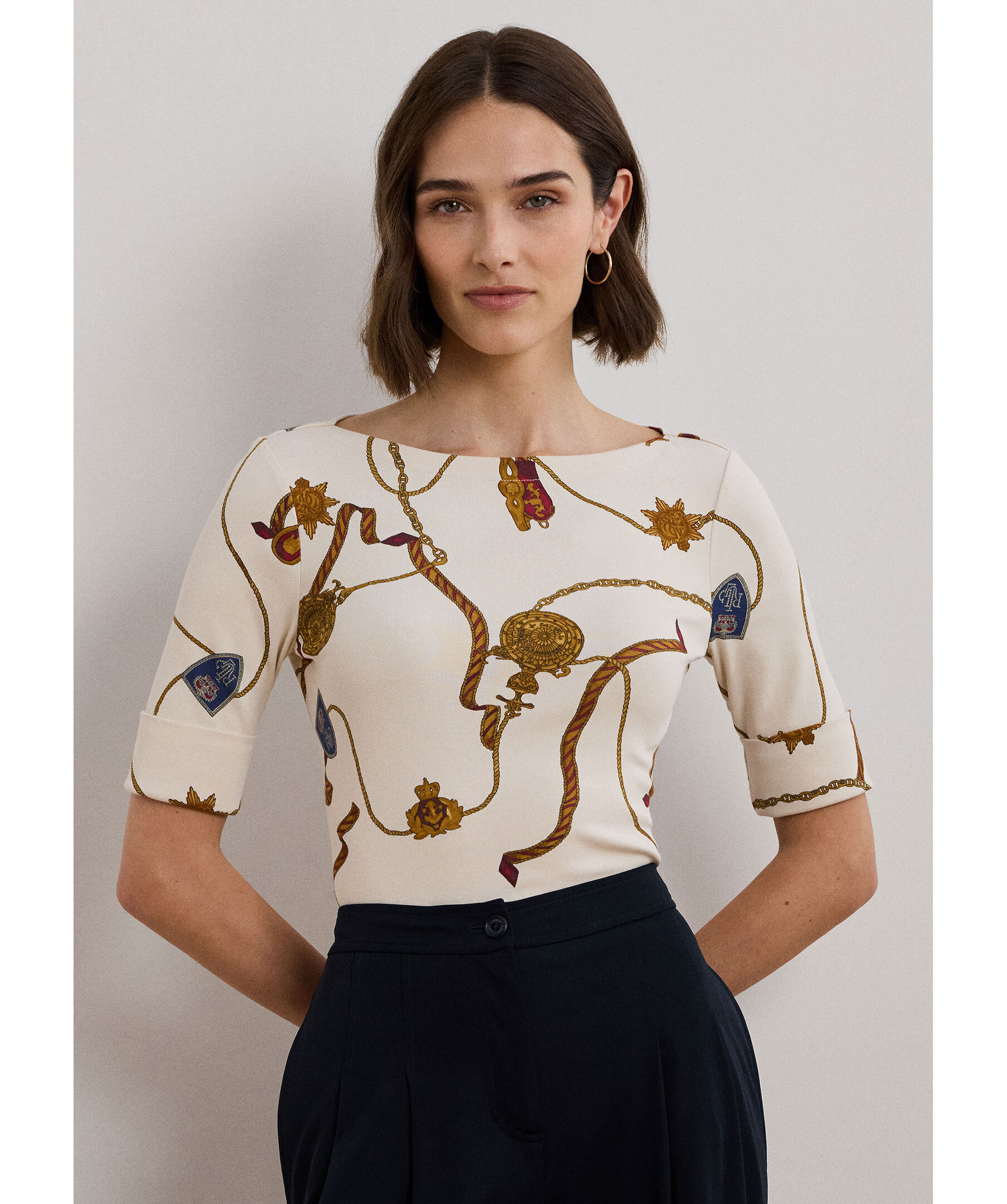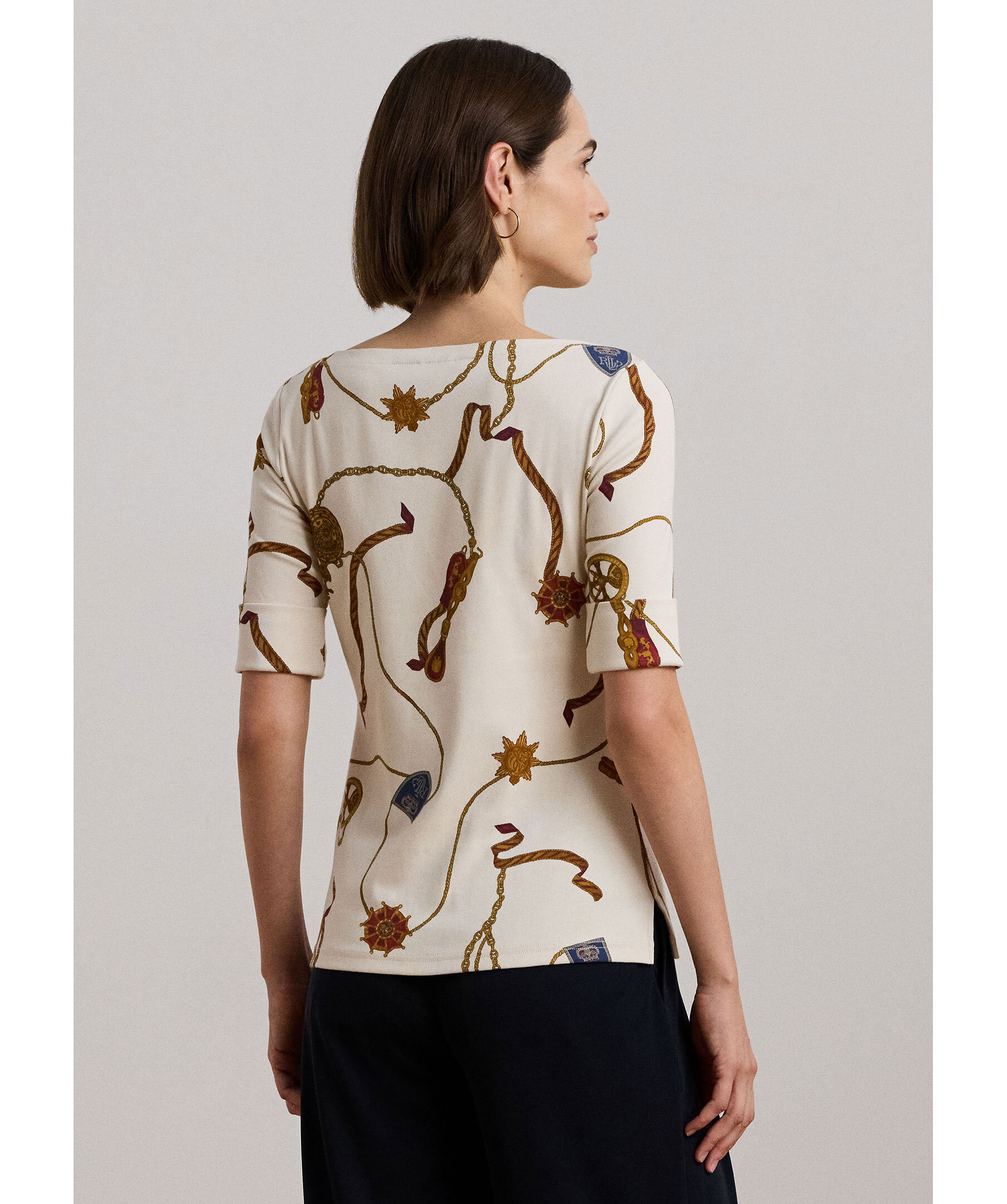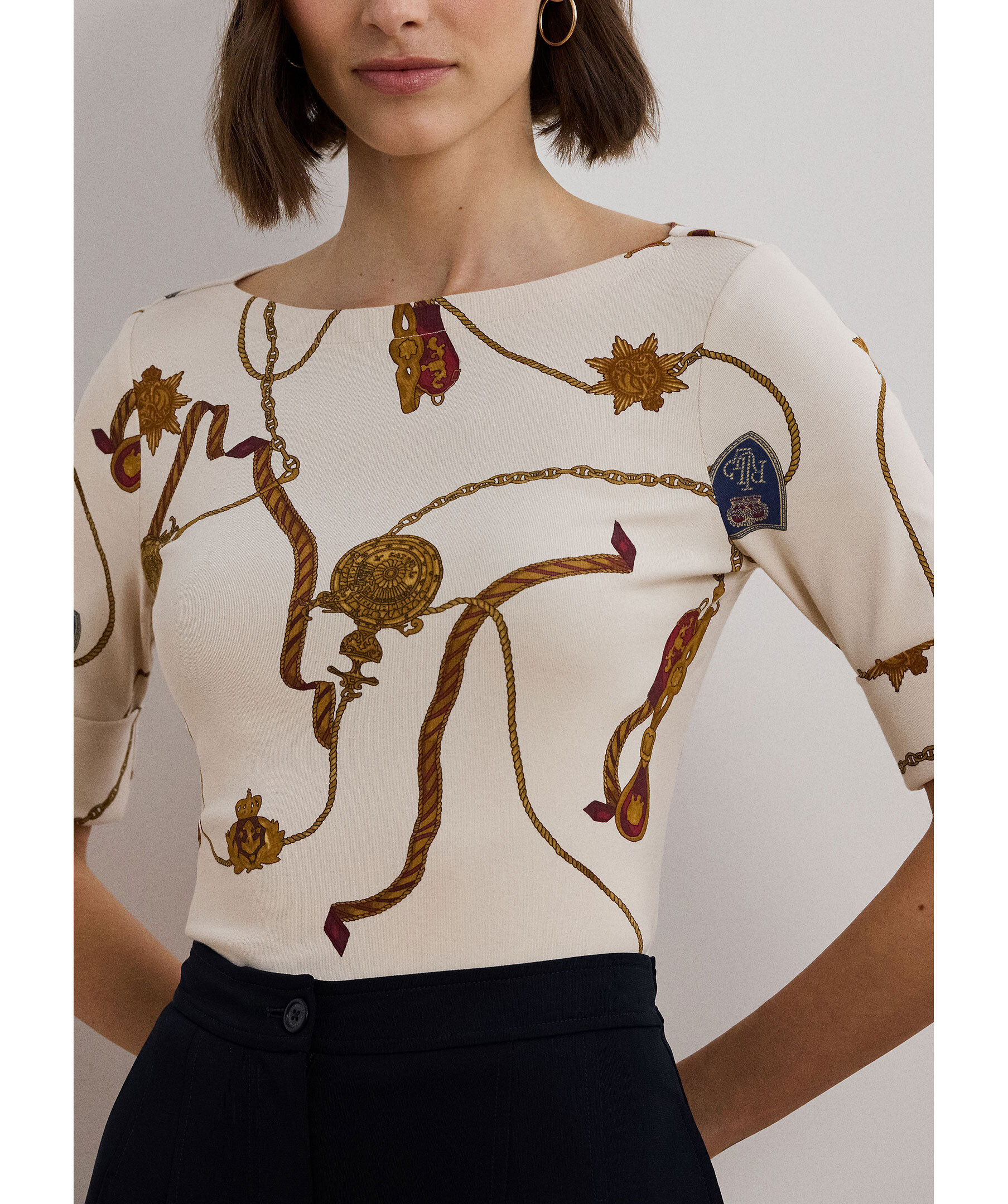 Krämfärgad mönstrad t-shirt från Lauren Ralph Lauren. Tröjan har en båthalsringning, trekvarts ärm och tillverkad av en bomullsblandning.