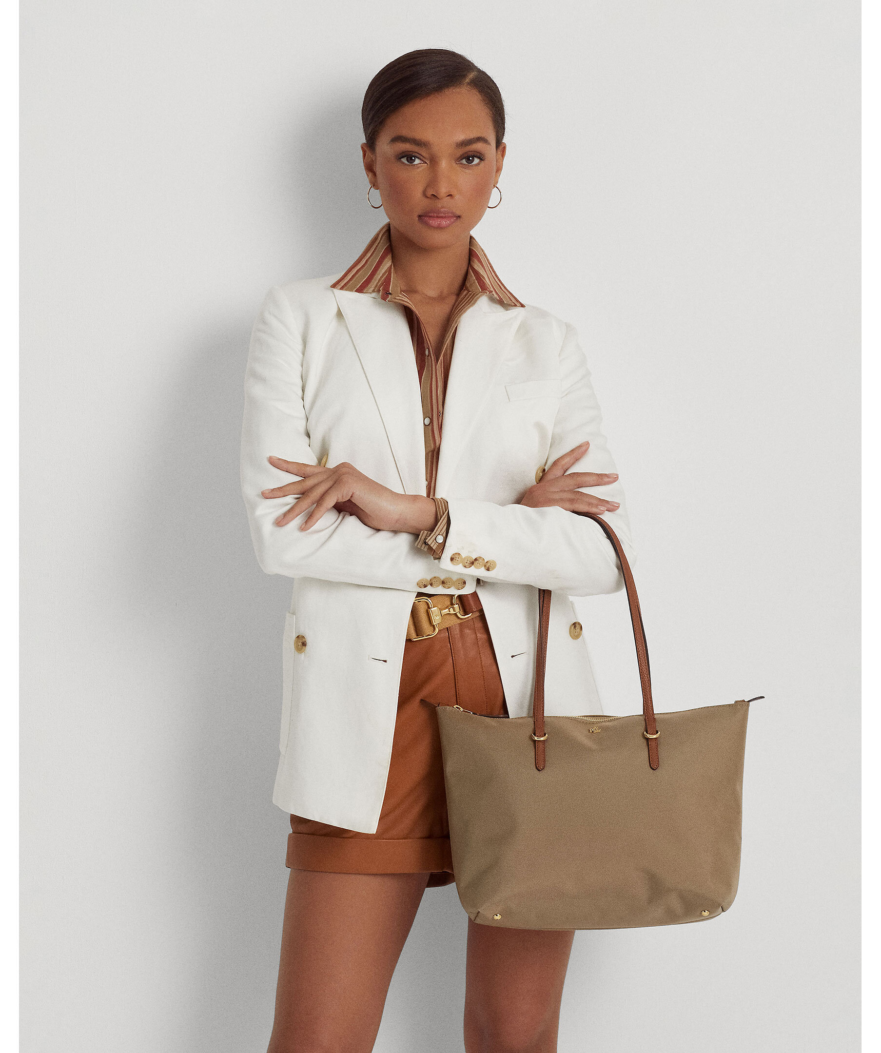 Keaton medium tote kombinerar slitstark nylon med lyxiga remmar i veganskt läder. Den rymliga designen rymmer dagens alla måsten, och en metallisk "LRL"-logotyp framtill ger en stilren signaturdetalj. Utrustad med topphandtag, dragkedja och innerficka.