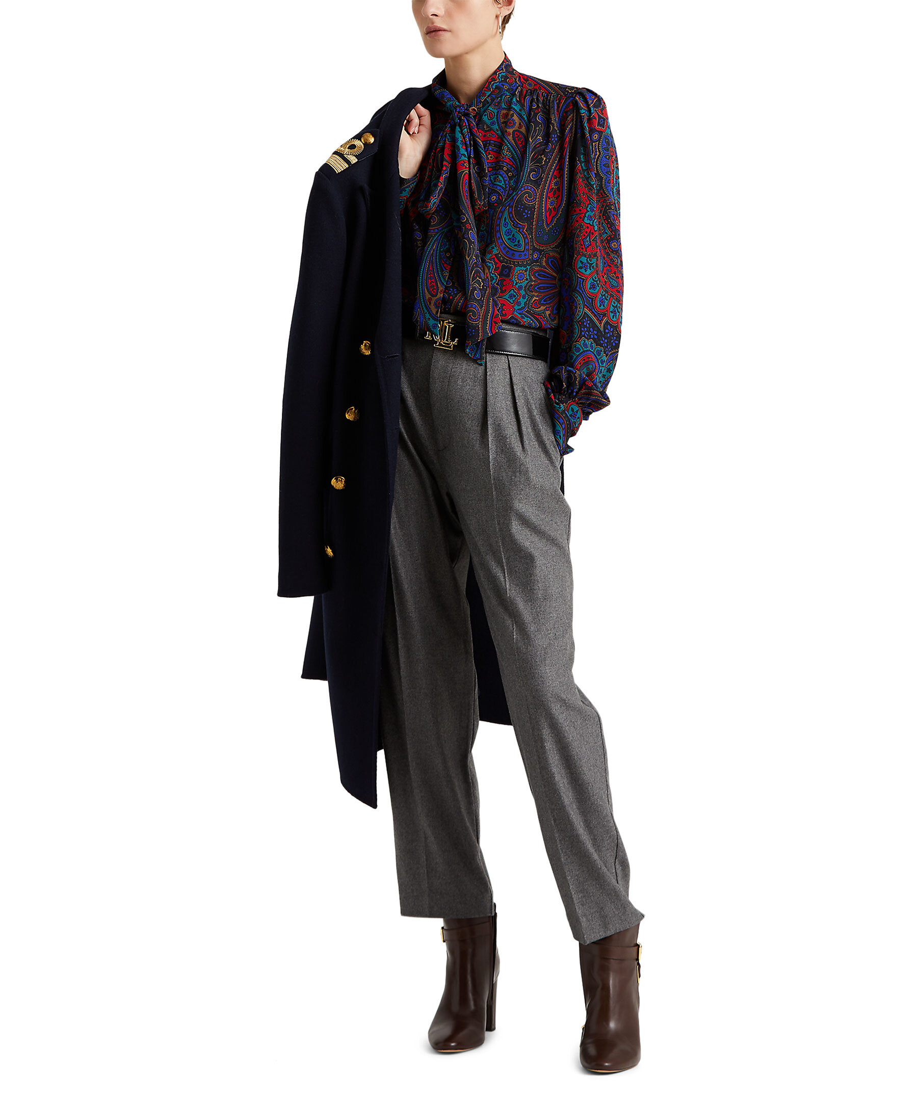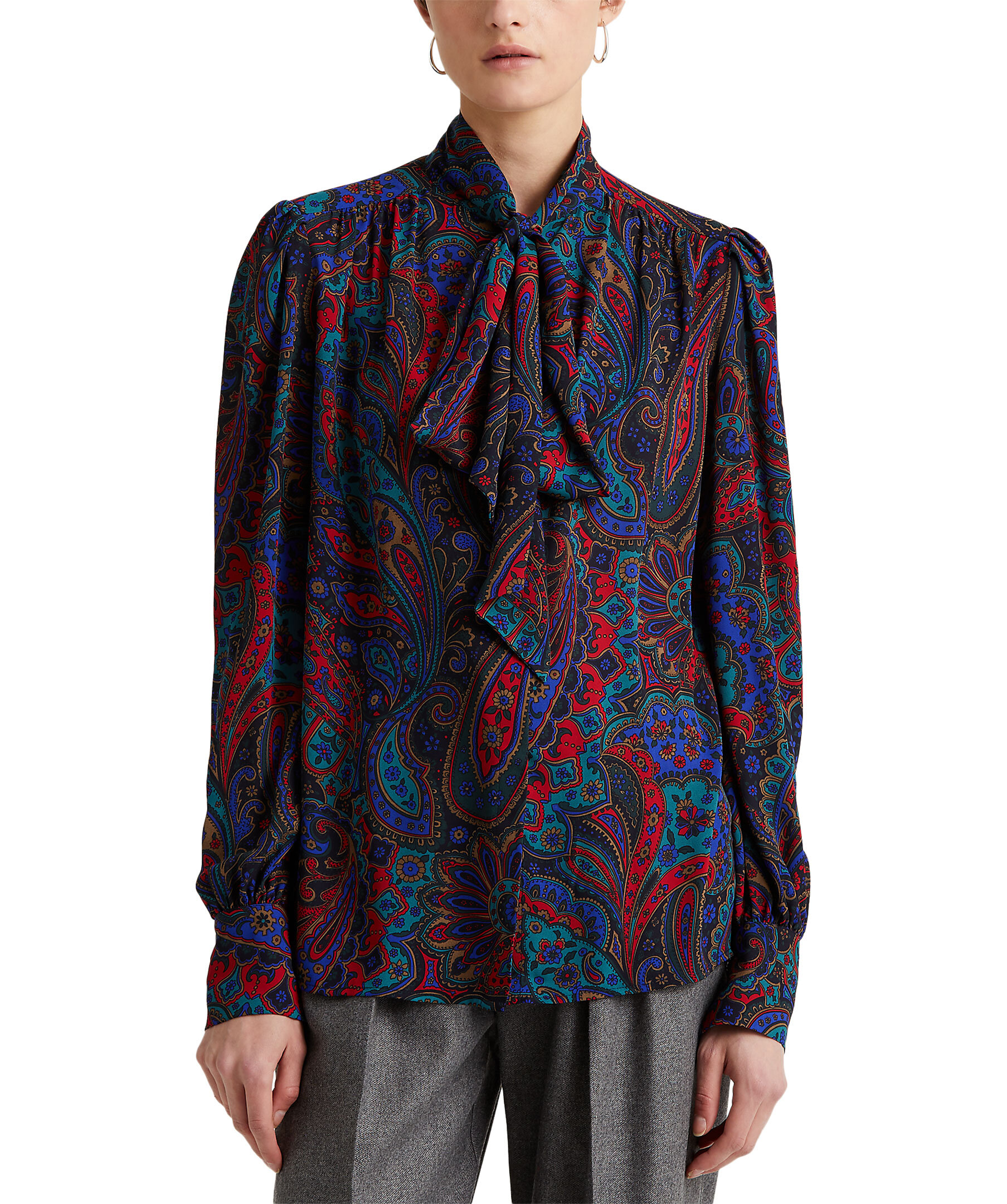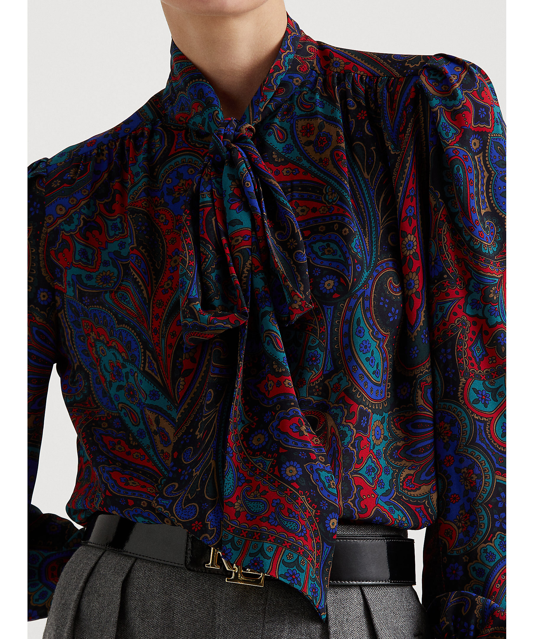 Blå, mörkgrön, röd och beige Paisley mönstrad knytblus från Lauren Ralph Lauren. Blusen har en relaxed passform. Draperingar vid axlarna och på ärmarna. Manschetter.