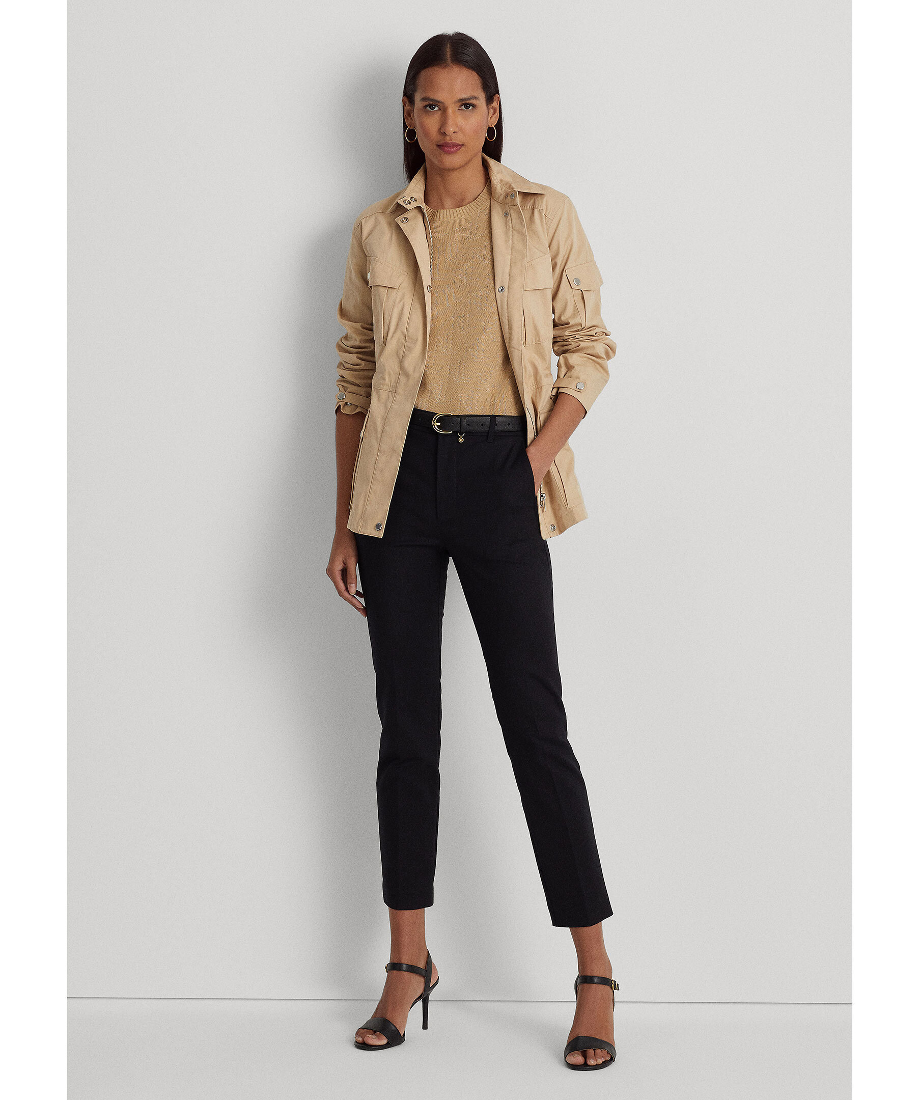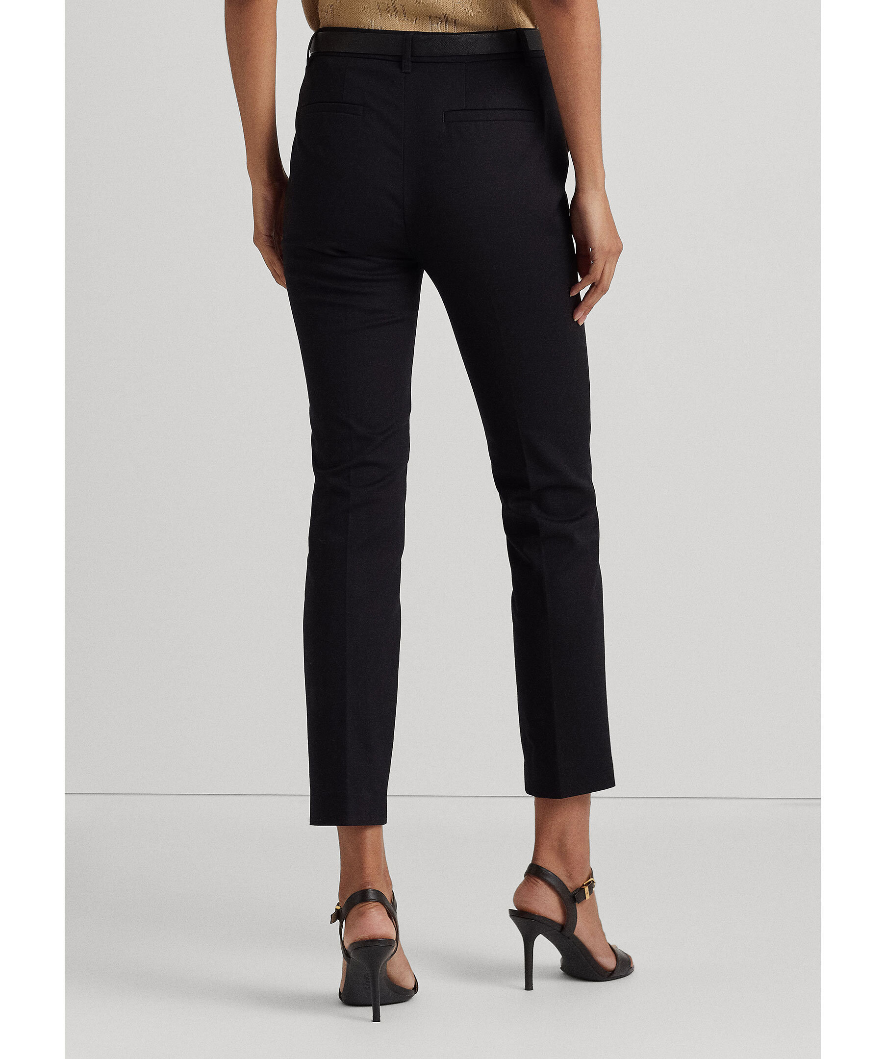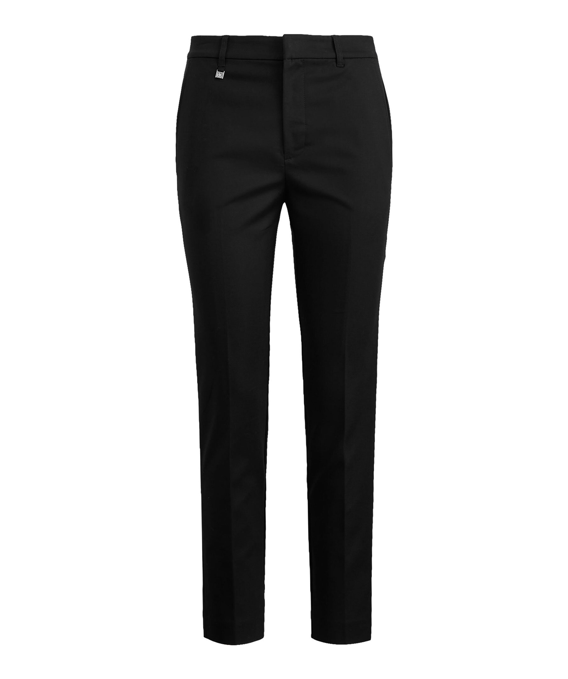 Svarta högmidjade byxor från Lauren Ralph Lauren. Byxorna har en slim fit modell med cropade benslut. Hällor för bälte. Två fickor framtill, tvåbakfickor. dold gylf med dragkedja och hake. Guldfärgad metallbricka på höger höft.