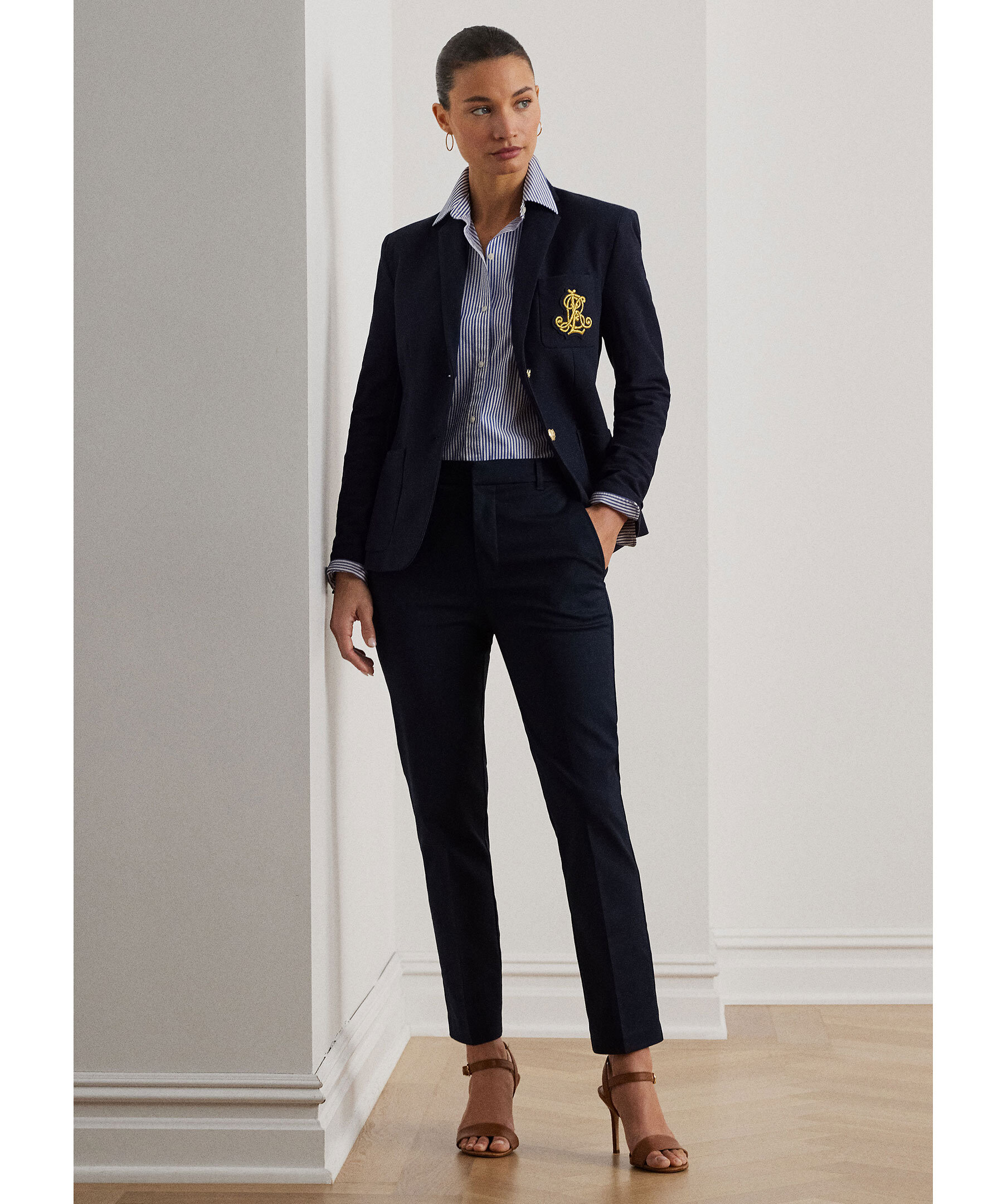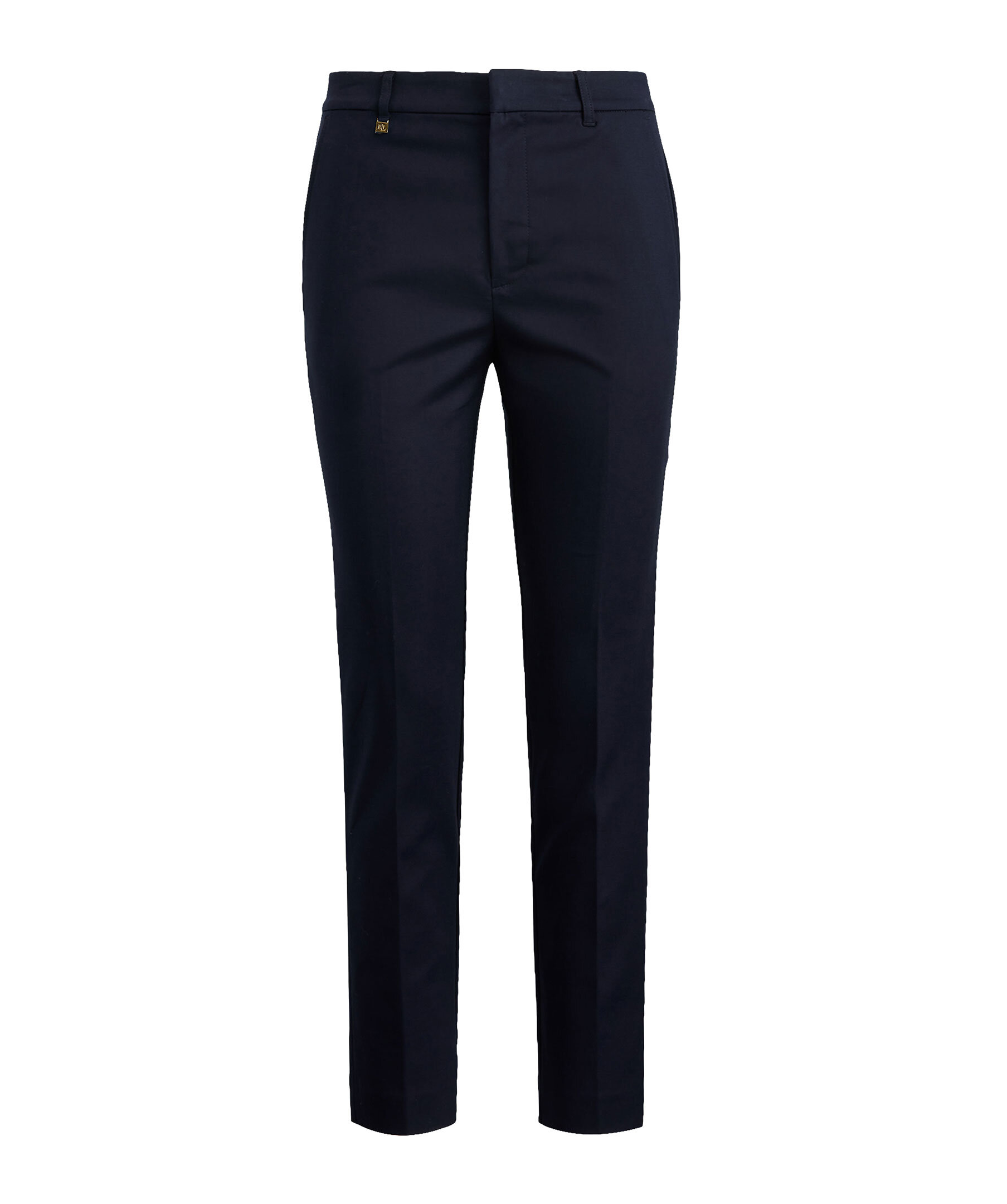 Mörkblåa högmidjade byxor från Lauren Ralph Lauren. Byxorna har en slim fit modell med cropade benslut. Hällor för bälte. Två fickor framtill, tvåbakfickor. dold gylf med dragkedja och hake. Guldfärgad metallbricka på höger höft.