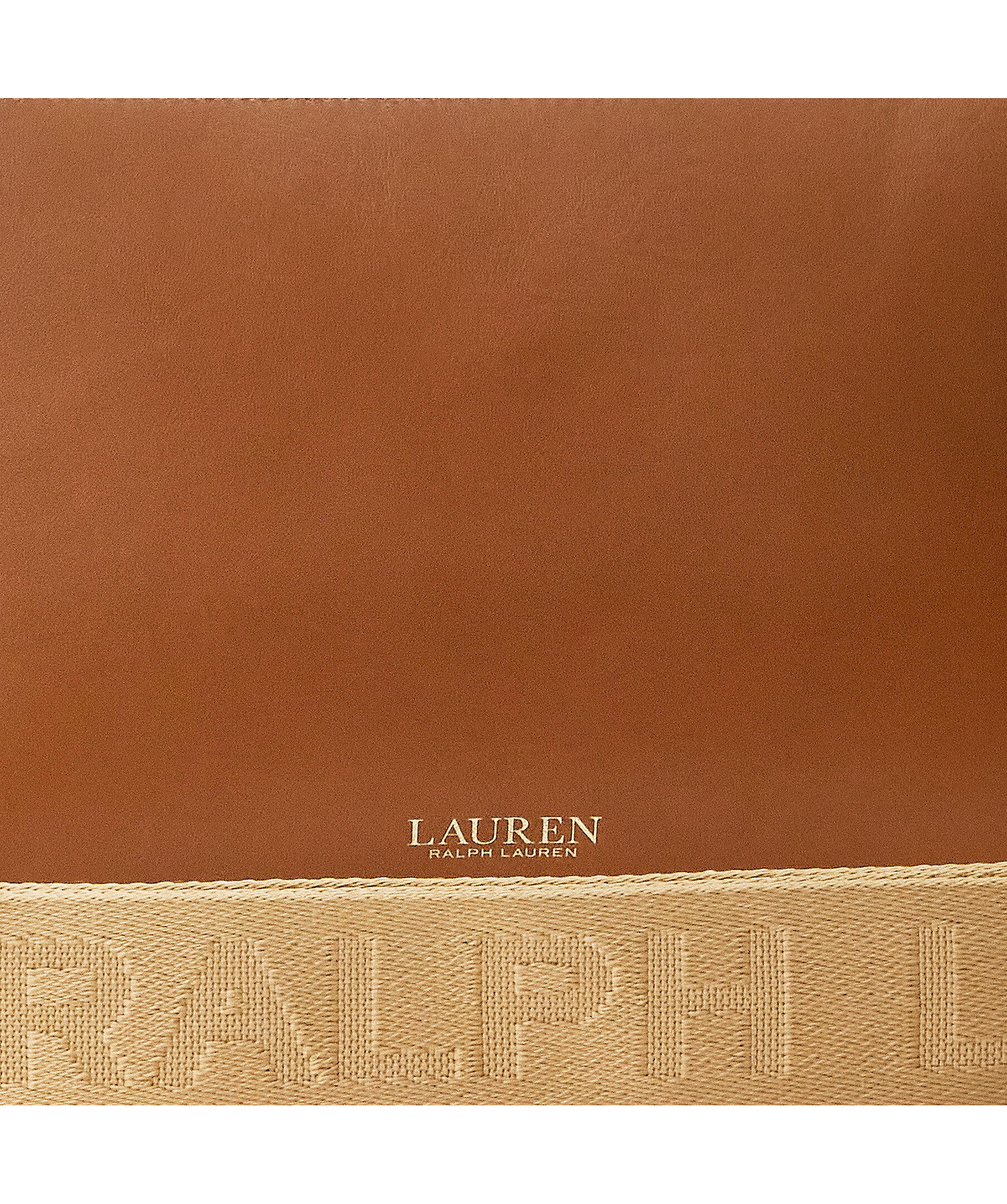 Brun väska i läder från Lauren Ralph Lauren. Tryckt guldfärgad logotyp. Två huvudfack som stängs med guldfärgad dragkedja. Två justerbara och avtagbara axelremmar, en i läder och ett vävt med logotyper. Väskans mått: H 16 cm, B 25 cm, D 2,5 cm.