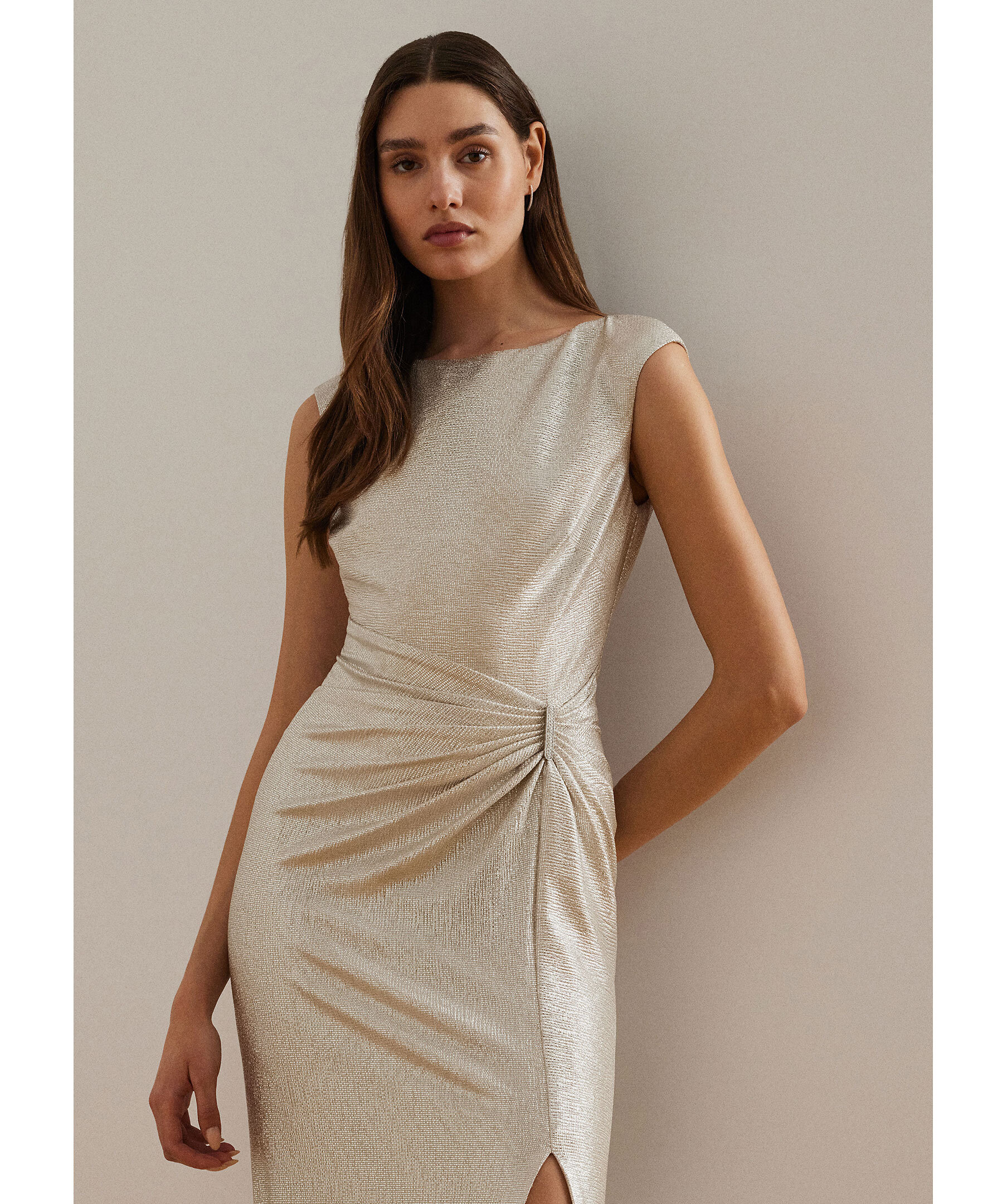 Champagnefärgad aftonklänning från Lauren Ralph Lauren. Figurnära långklänning med lätt draperad midja med glittrigt spänne i sidan. Båtkrage och lång sidoslits. Tillverkad av en polyesterblandning.