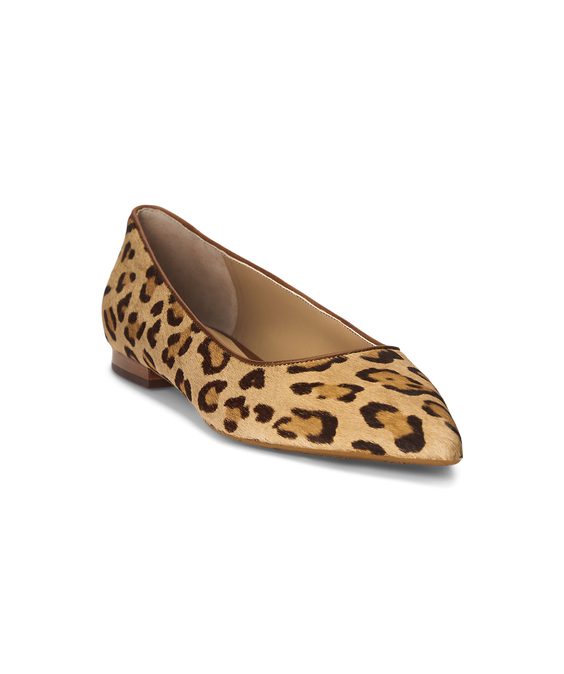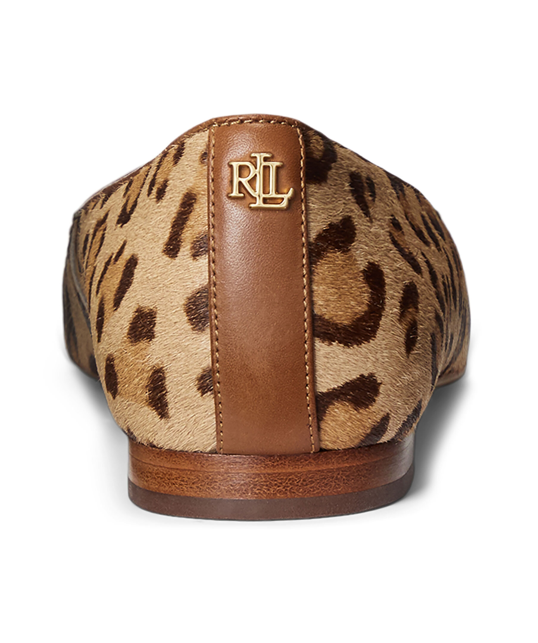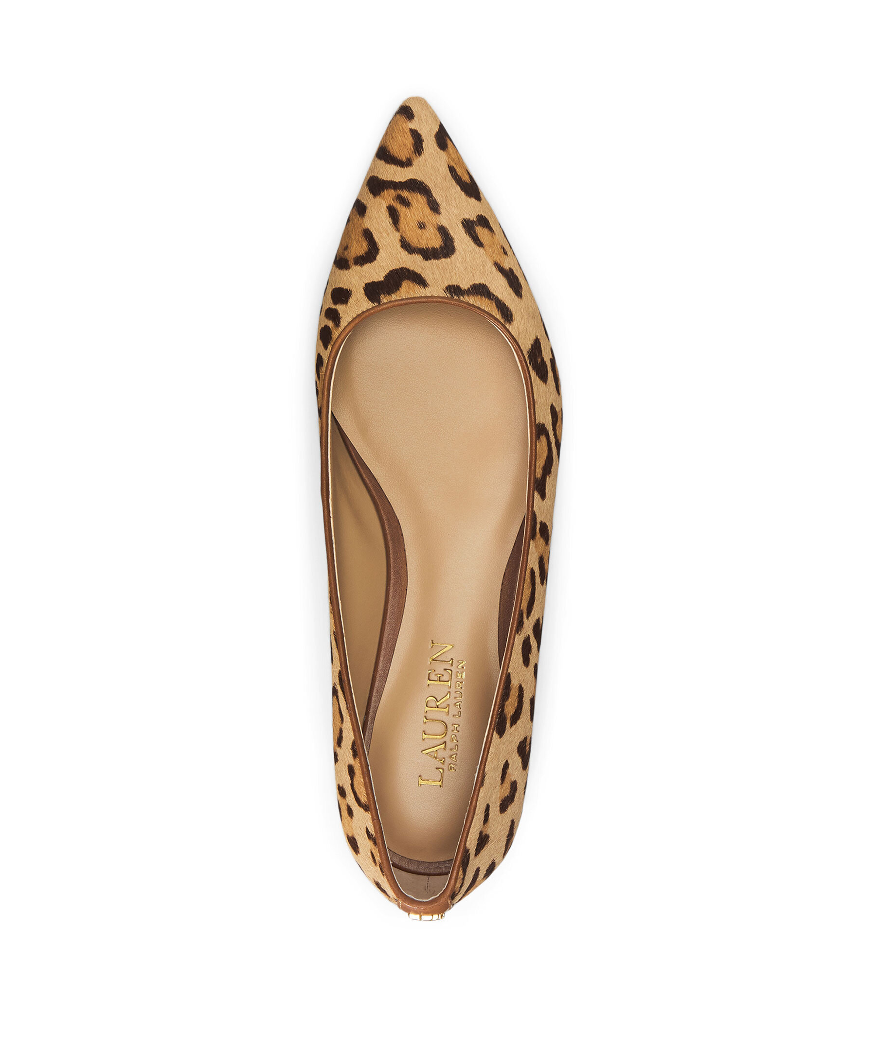 Leopardmönstrade ballerinaskor med spetsig tå från Lauren Ralph Lauren. Tillverkad av kalvhår med leopardmotiv och har en LRL-metalllogga vid hälen. Slip-on modell, vadderad innersula samt yttersula i gummi.