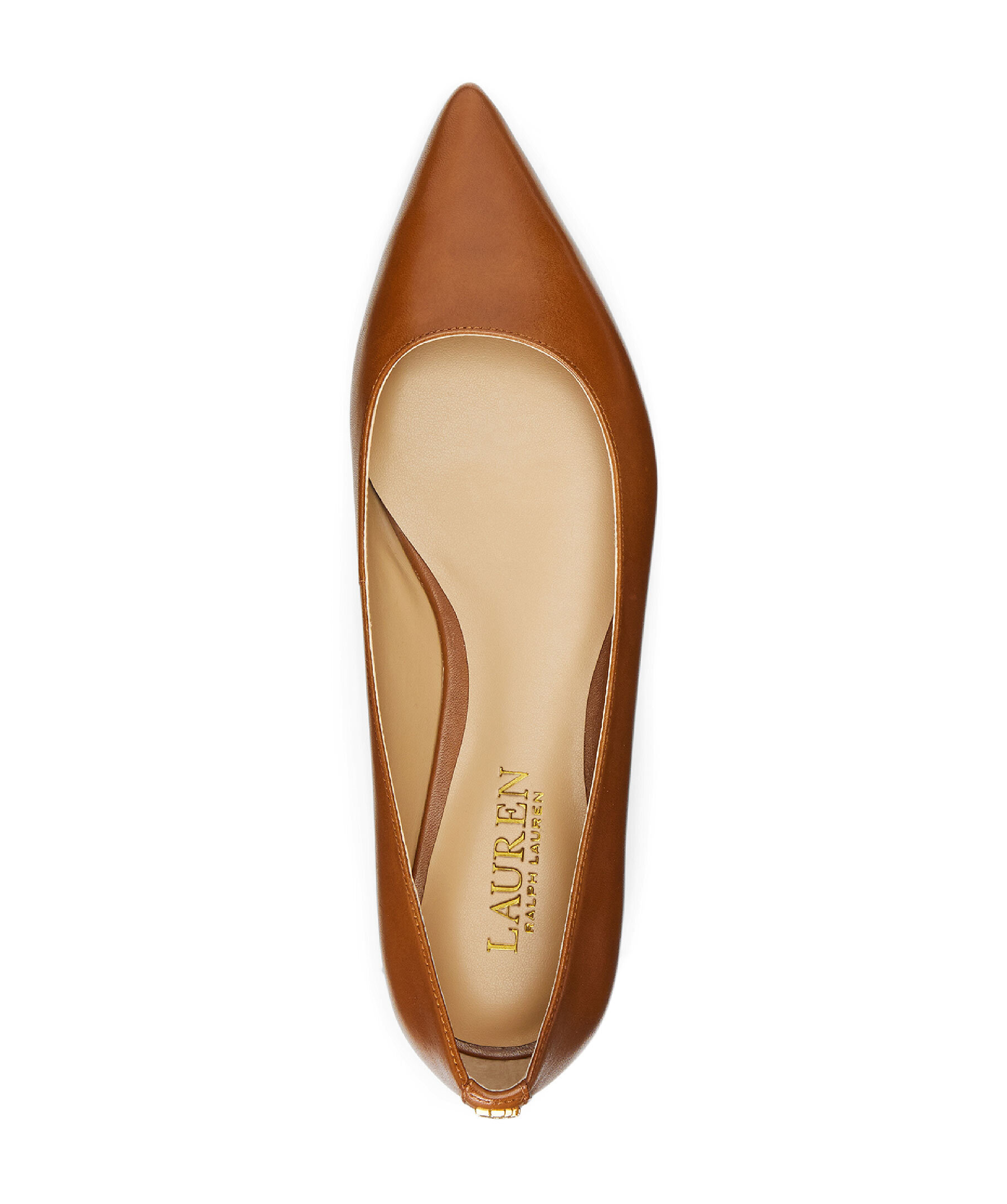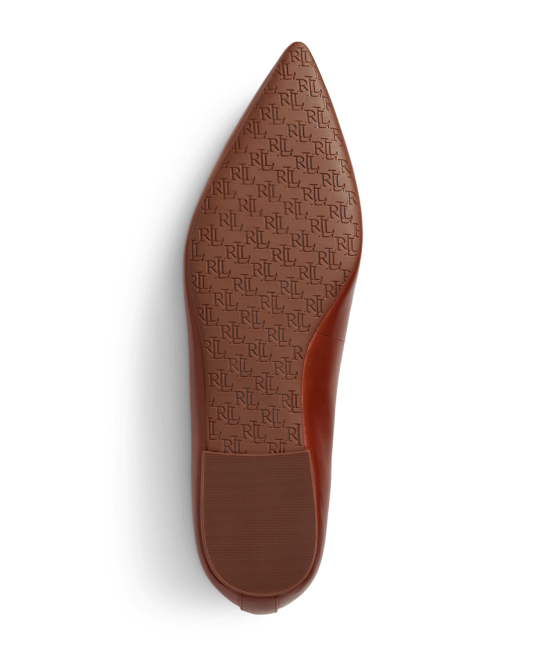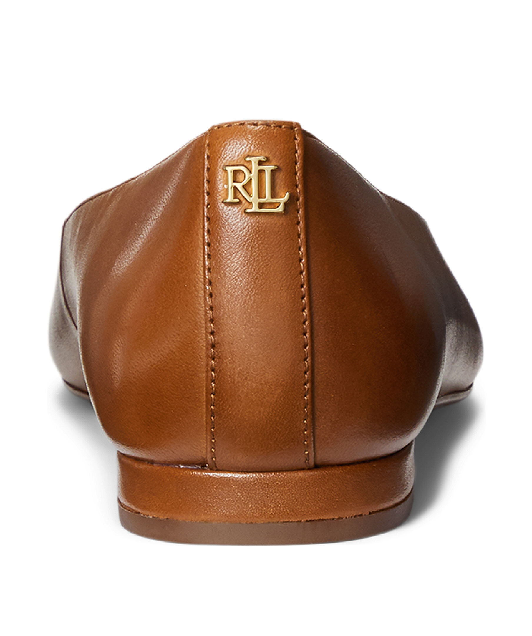 Bruna ballerinaskor med spetsig tå från Lauren Ralph Lauren. Tillverkad av polerat läder och har en LRL-metallogga vid hälen. Slip-on modell och vadderad innersula samt yttersula i gummi.