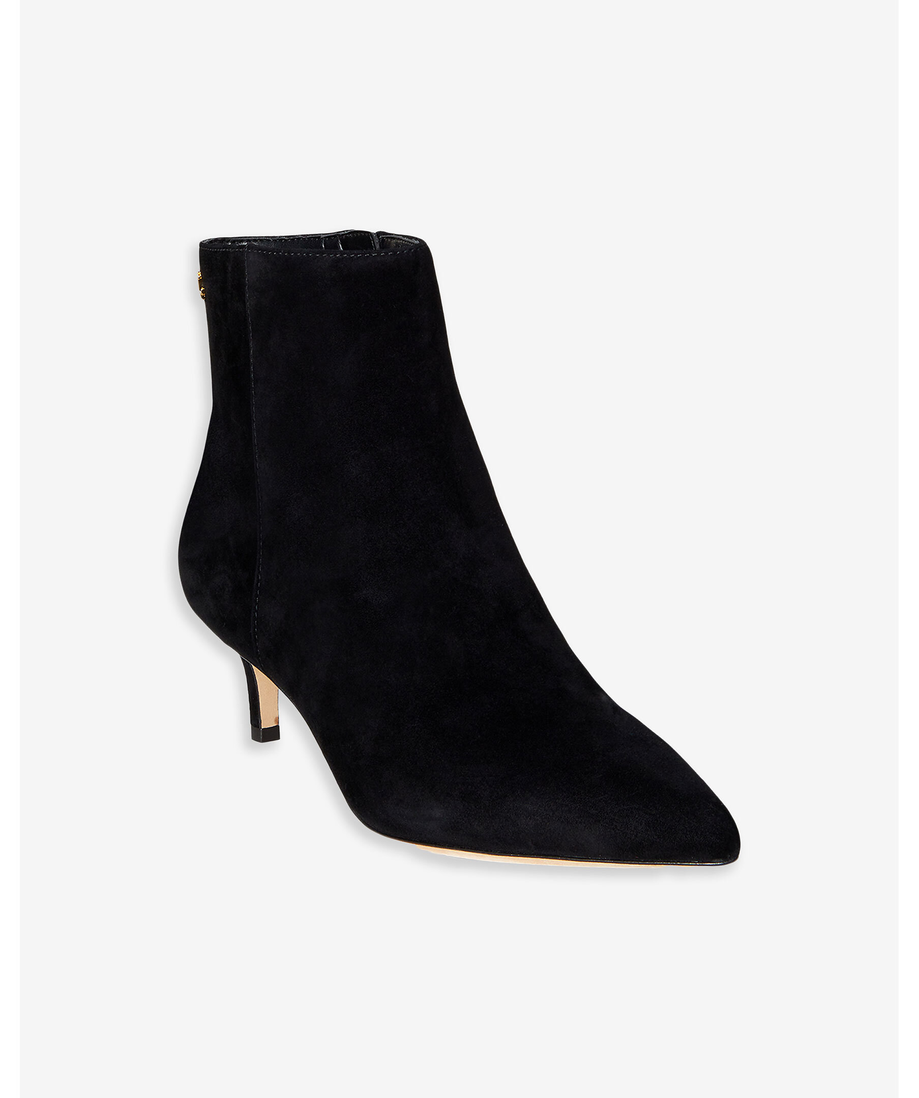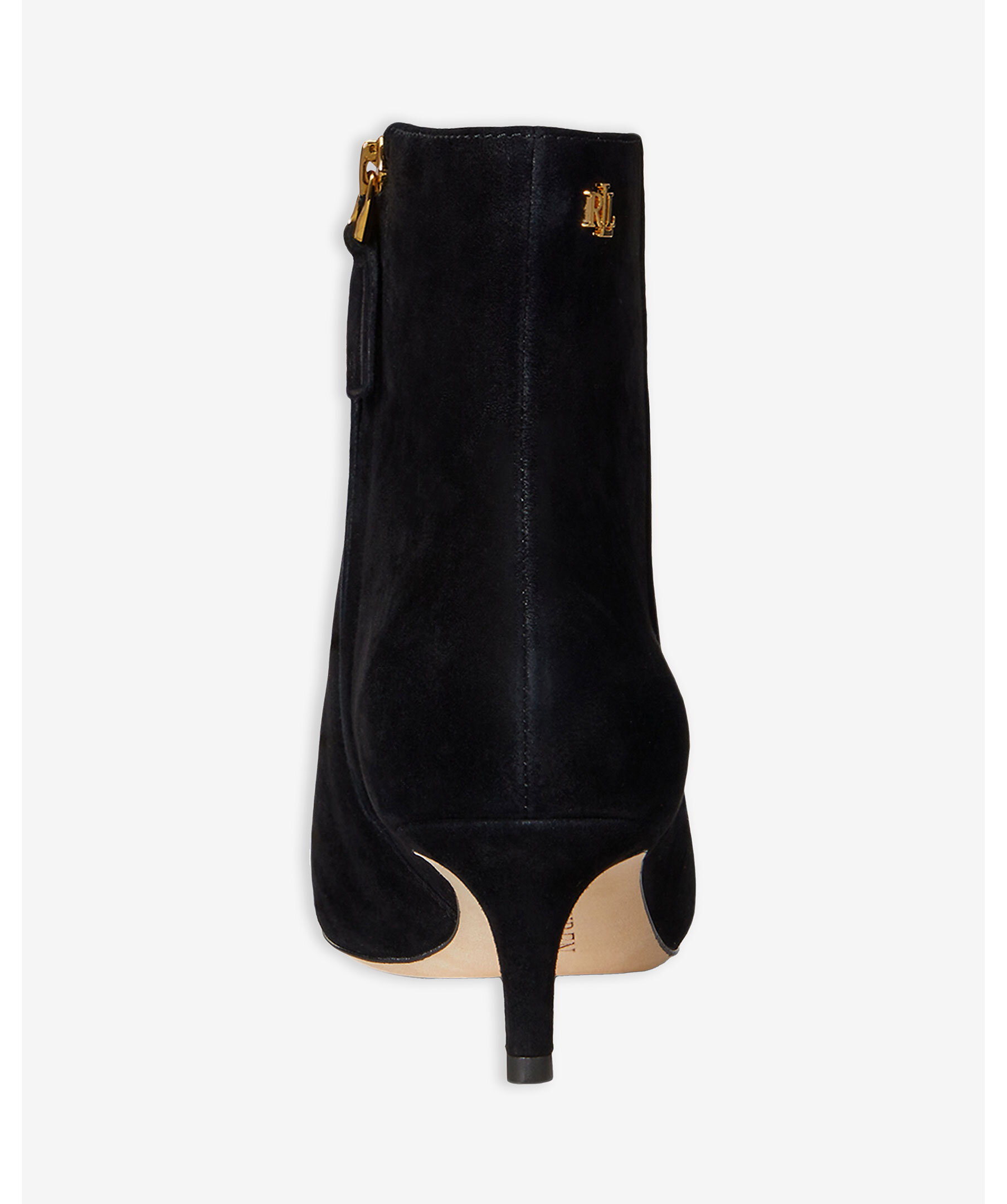 Svart boot med klack i elegant mocka från Lauren Ralph Lauren. Med en spetsig tåform och en medelhög kitten heel på 5cm som förlänger silhuetten utan att kompromissa med komforten passar denna stövel för både vardag och fest. Guld färgad logotyp på skons ena sida.