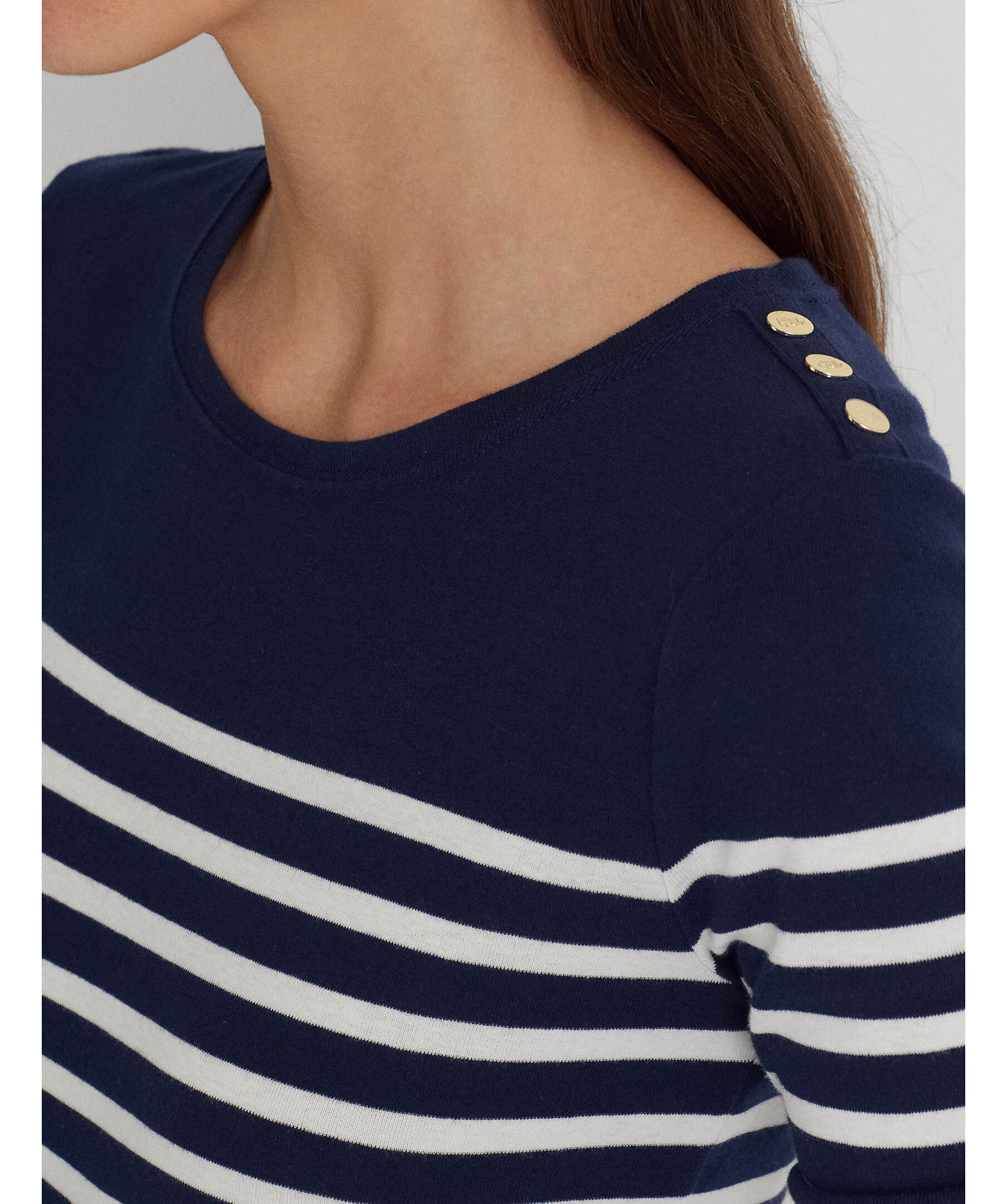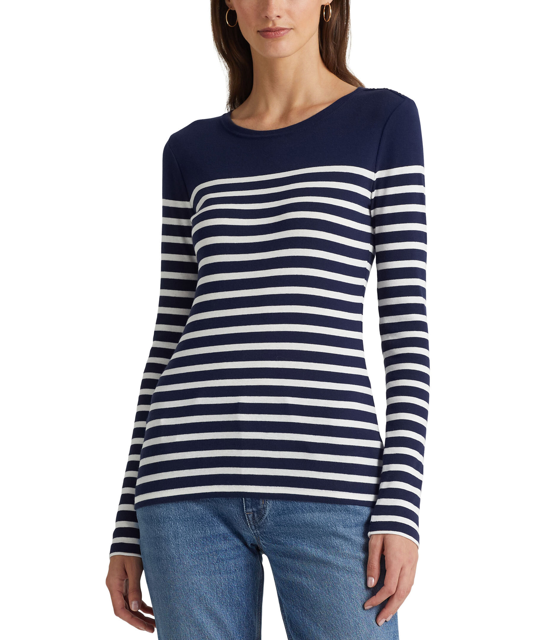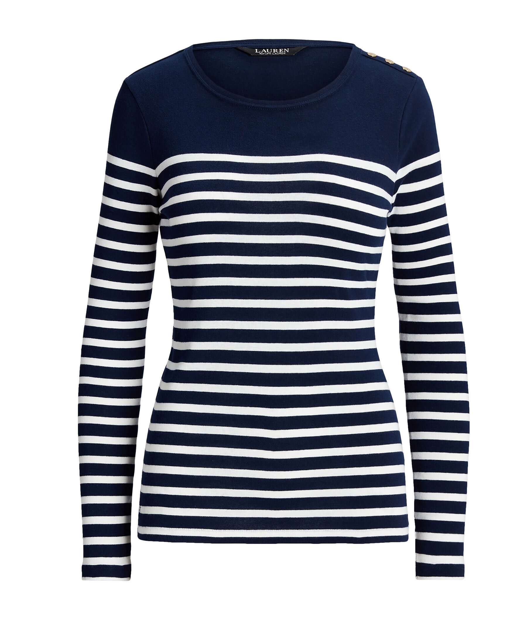 Mörkblå och vit randig långärmad tröja från Lauren Ralph Lauren. Rundad halsringning. Guldfärgade knappar på vänster axel. Tillverkad i 100% Bomull.
